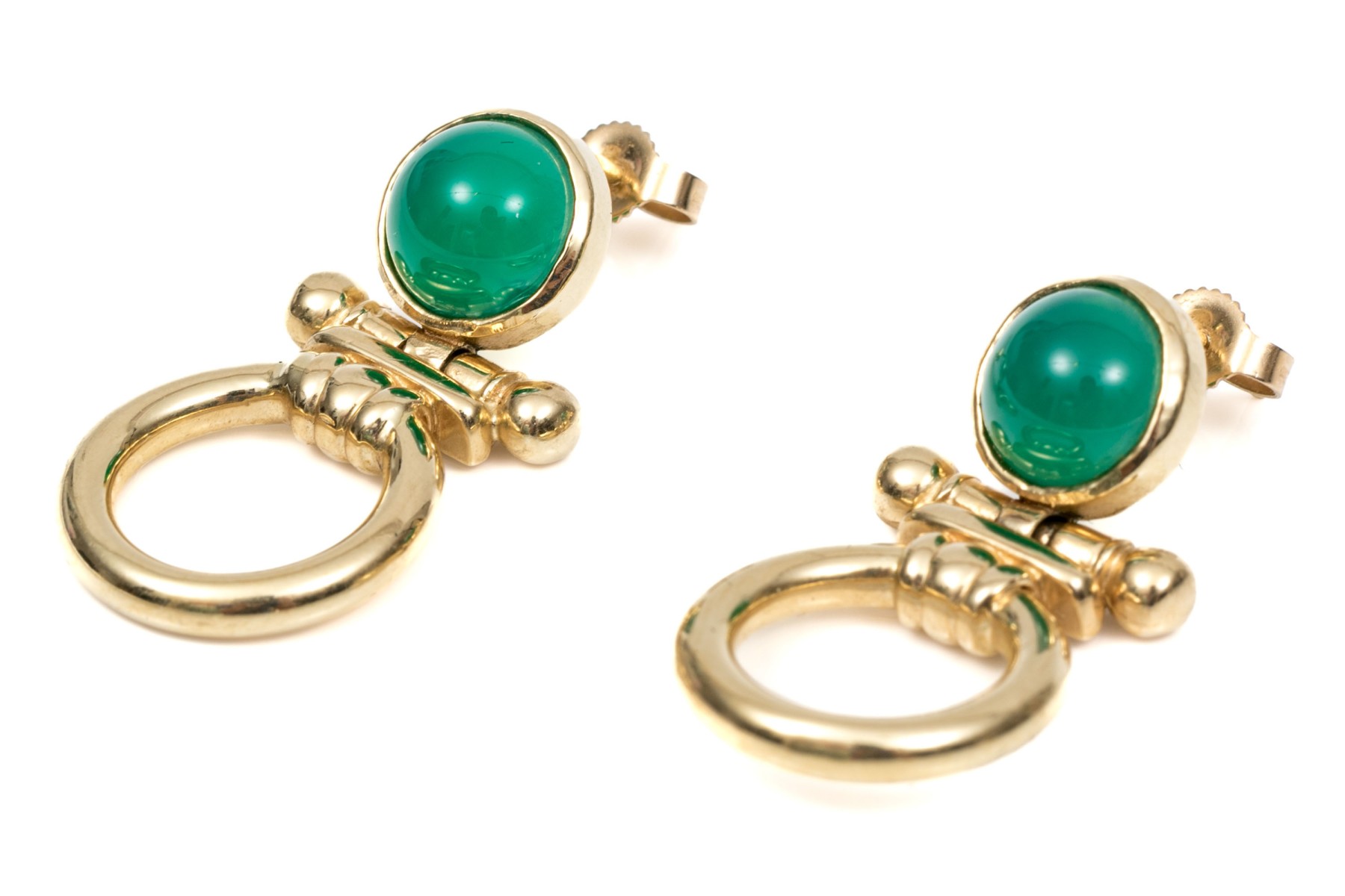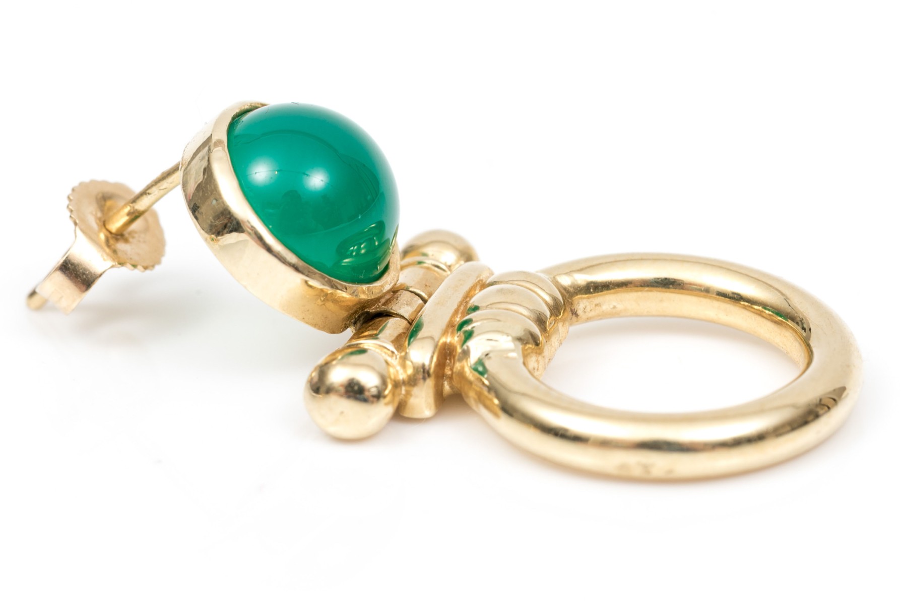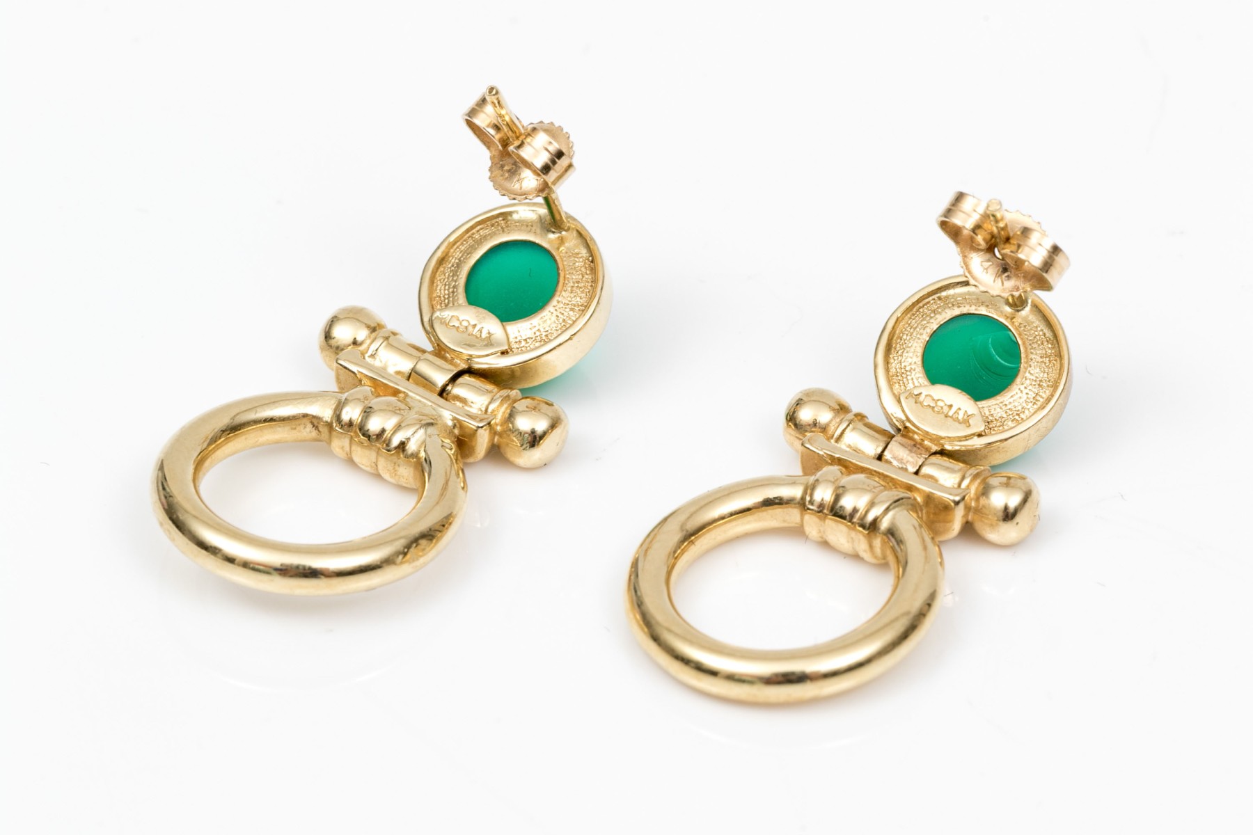Door knocker style 14K yellow gold earrings. The tops of the earrings are bezel set with green chalcedony while open rings are at the base. Post and clutch backings.