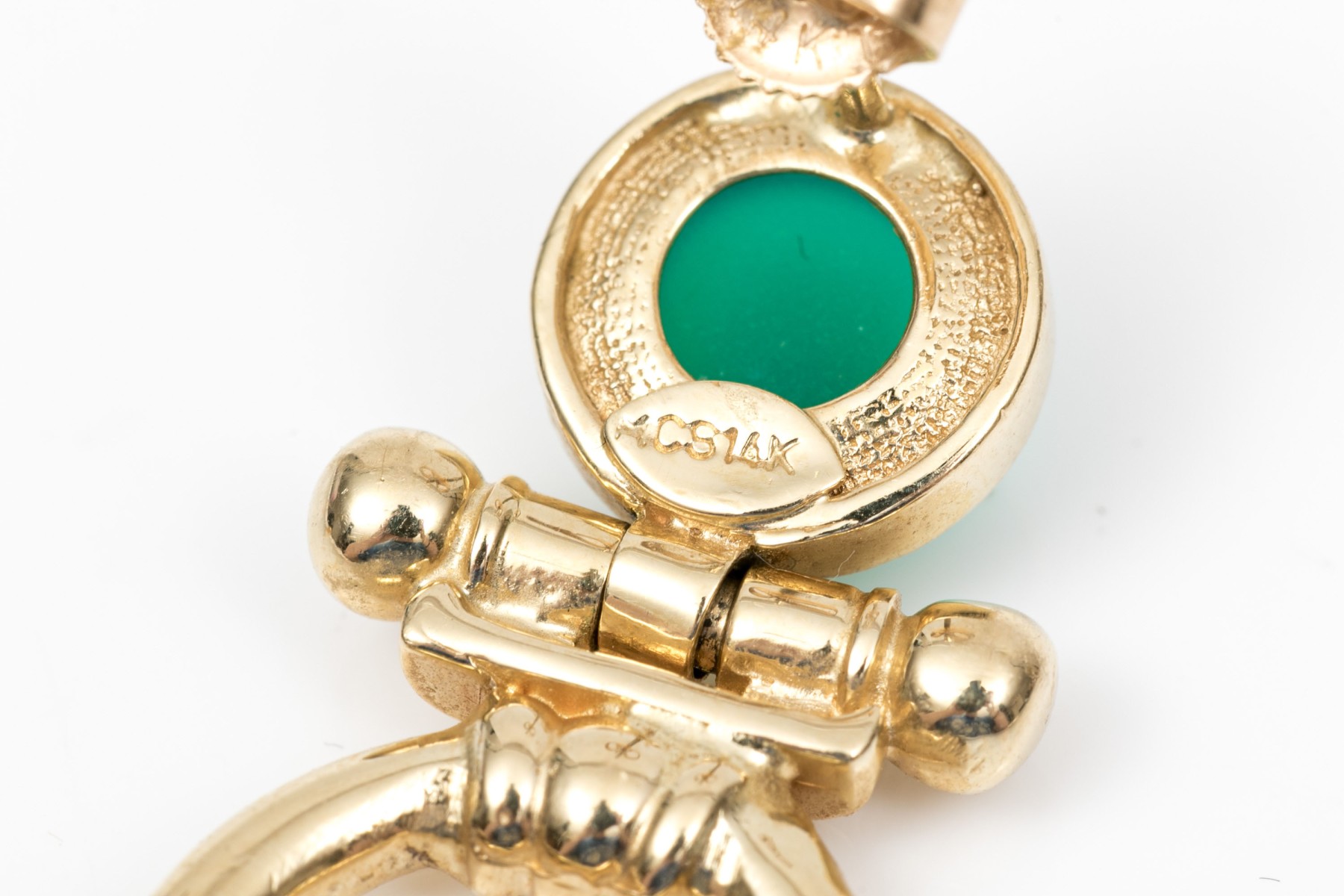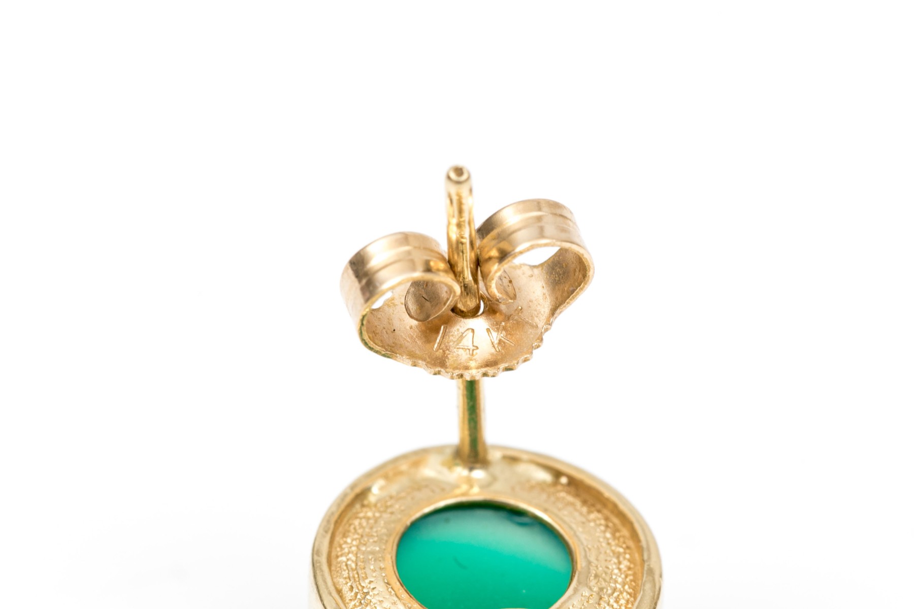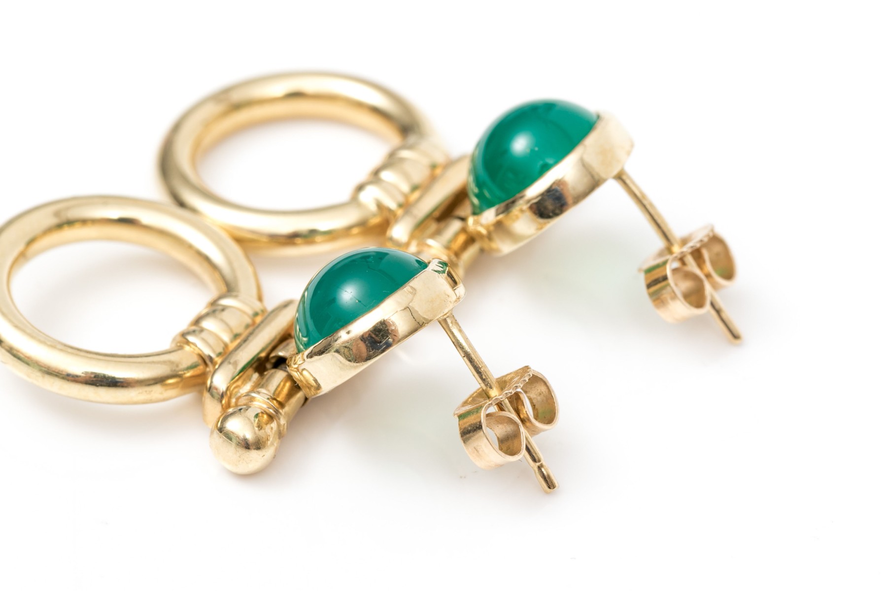 Door knocker style 14K yellow gold earrings. The tops of the earrings are bezel set with green chalcedony while open rings are at the base. Post and clutch backings.
