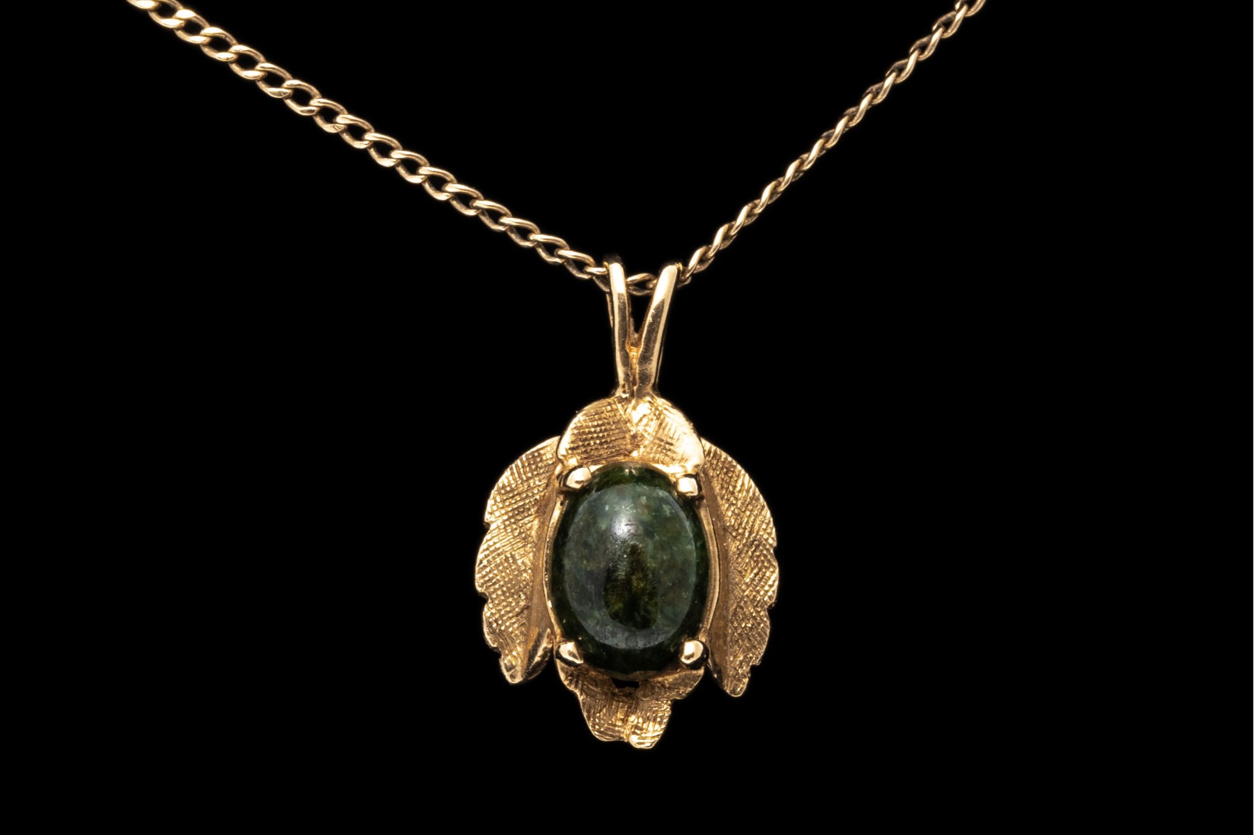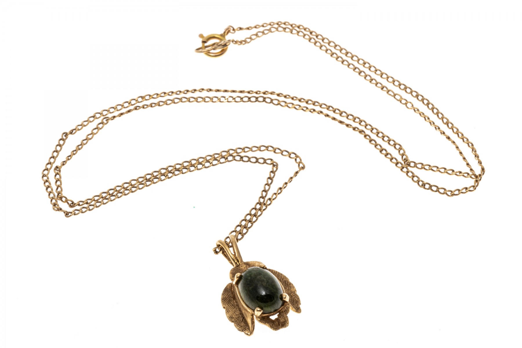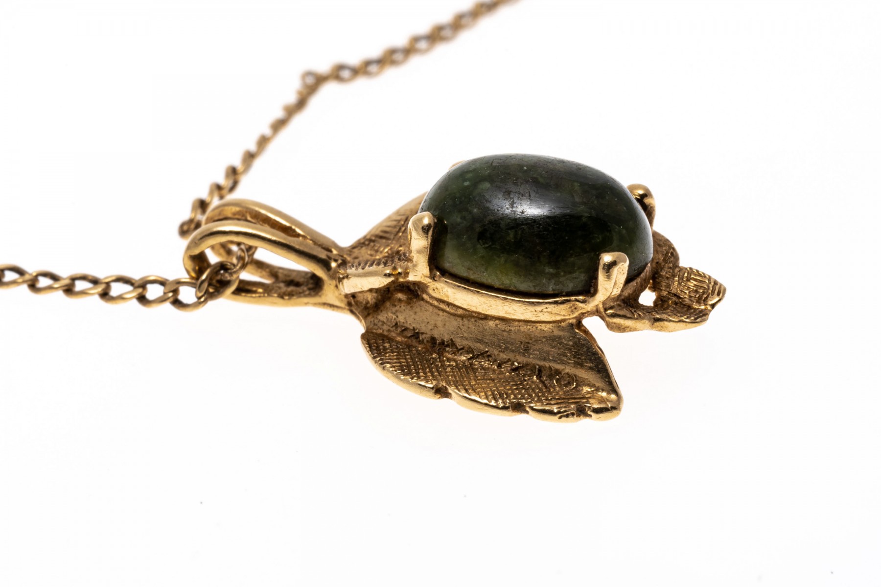 A 14K yellow gold curb chain style necklace. Suspended from the chain is a leaf designed pendant with a textured finish. prong set at the center of the pendant is a single oval cabochon cut nephrite jade stone. Chain secures with a spring ring clasp.