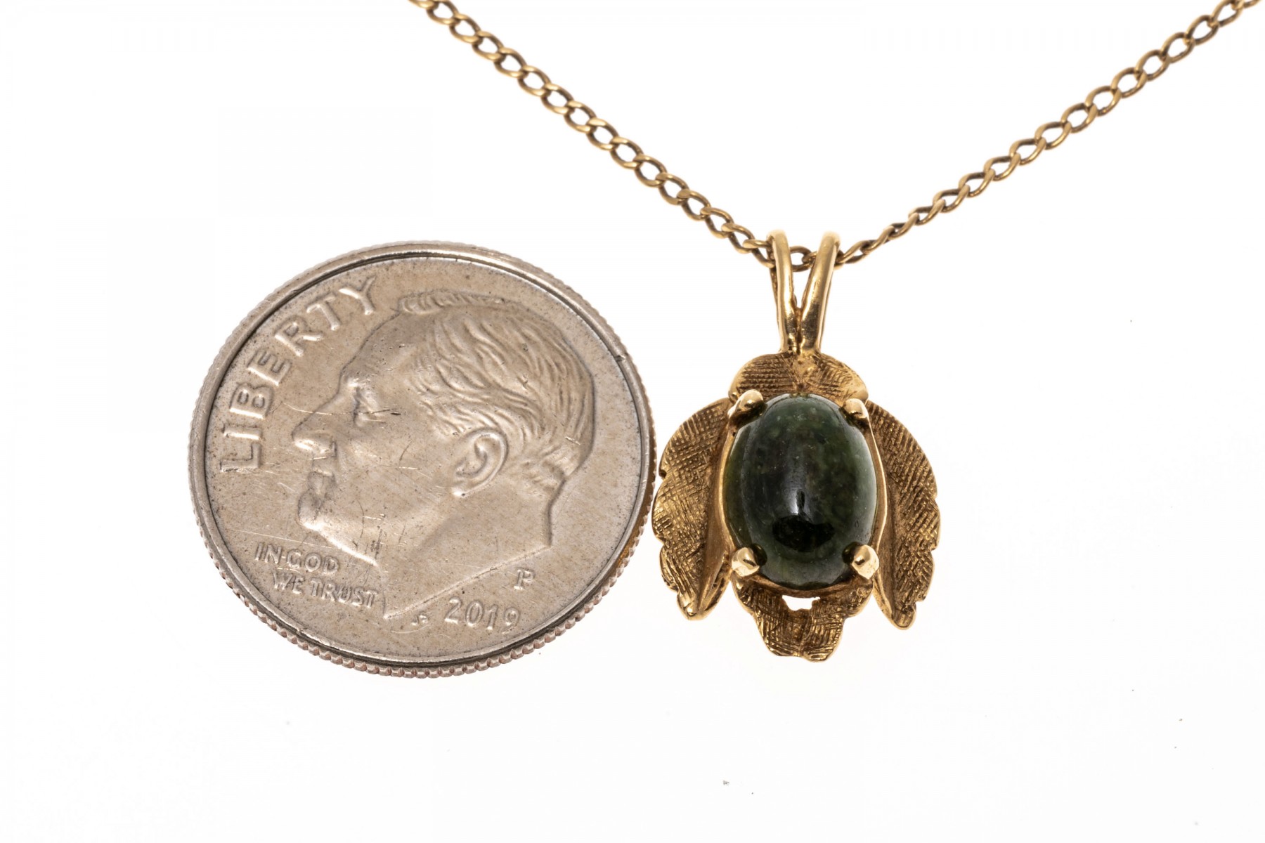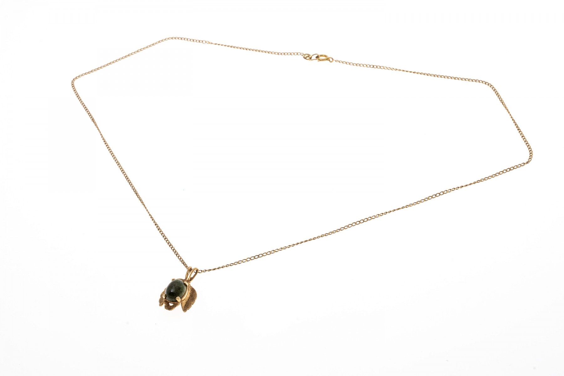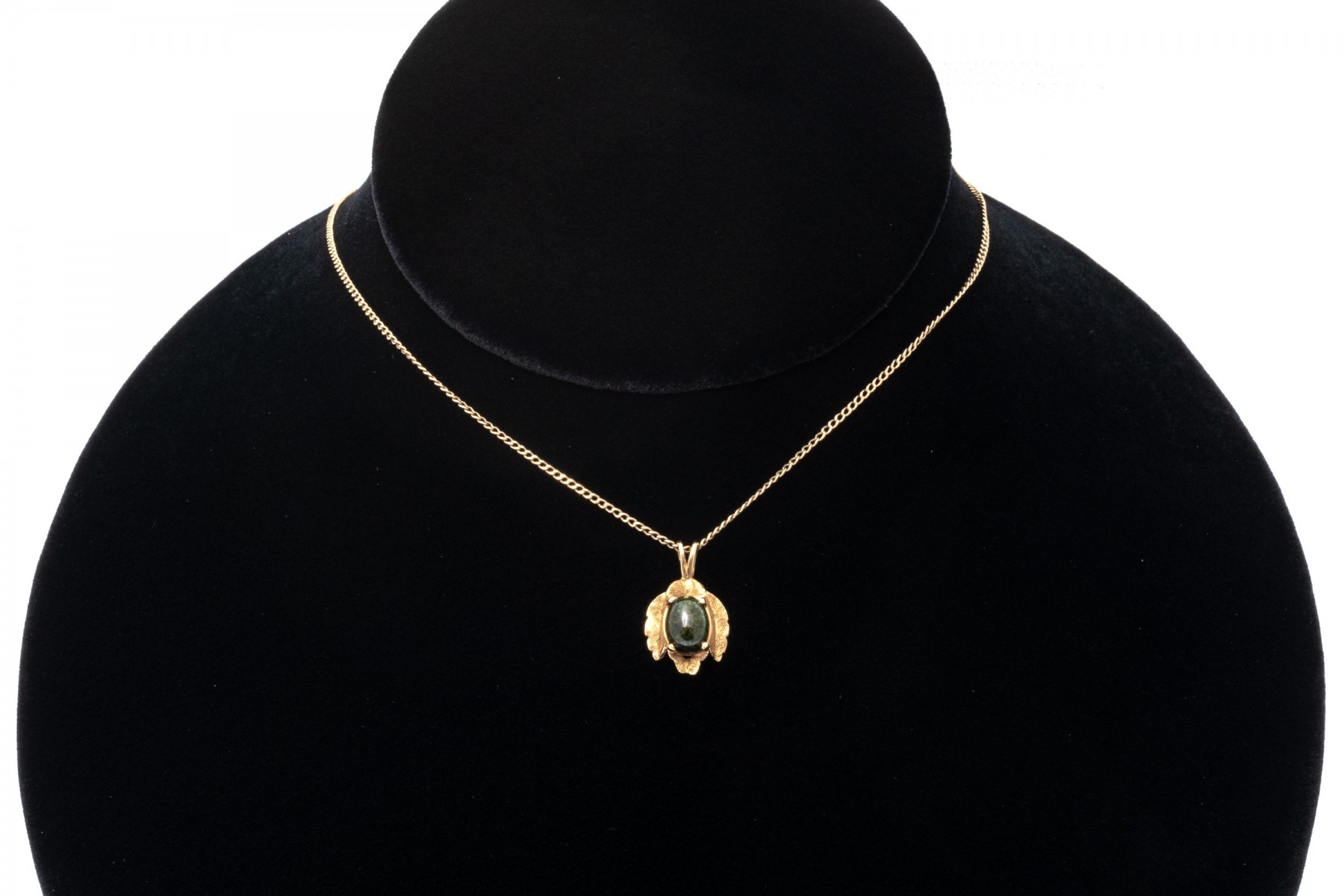 A 14K yellow gold curb chain style necklace. Suspended from the chain is a leaf designed pendant with a textured finish. prong set at the center of the pendant is a single oval cabochon cut nephrite jade stone. Chain secures with a spring ring clasp.