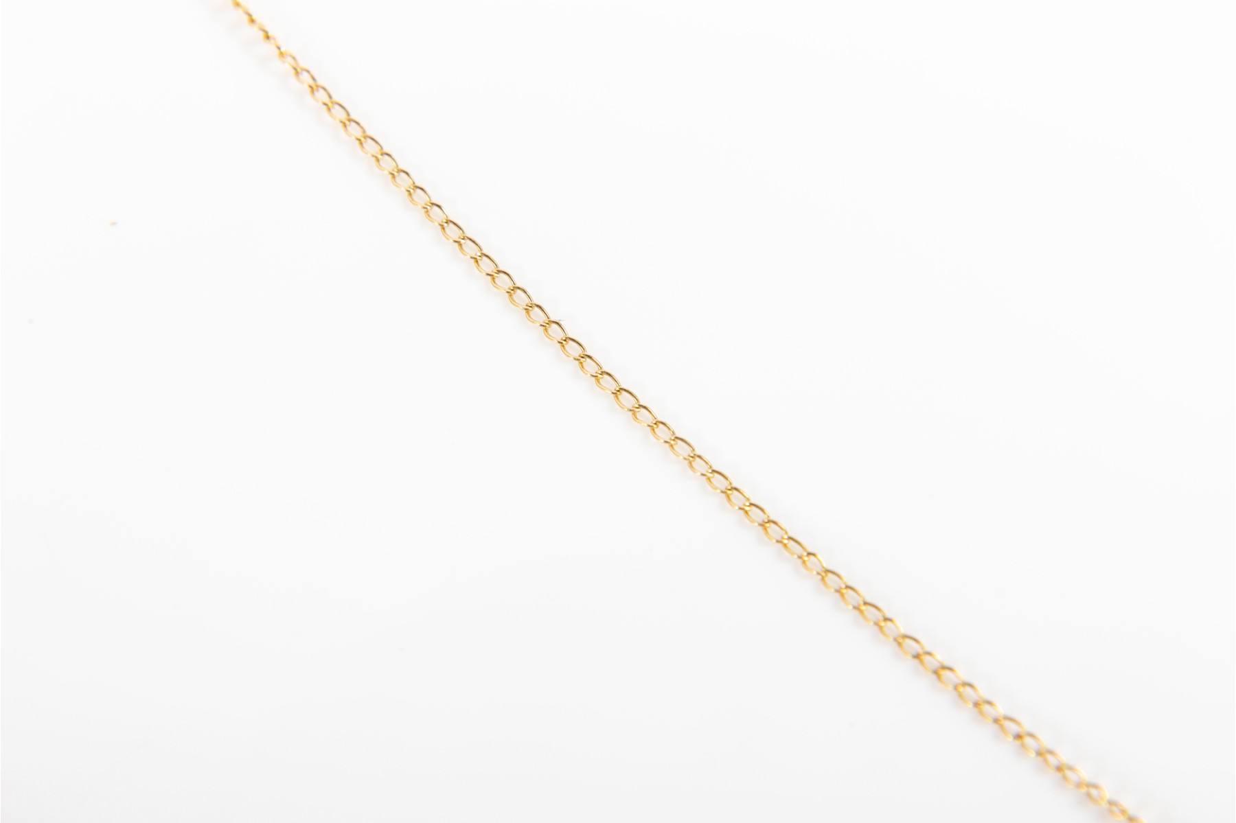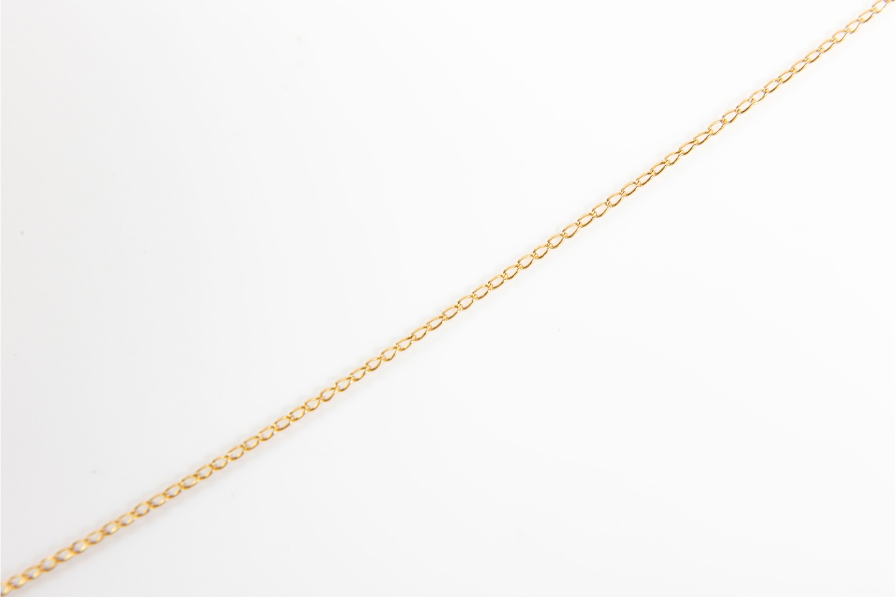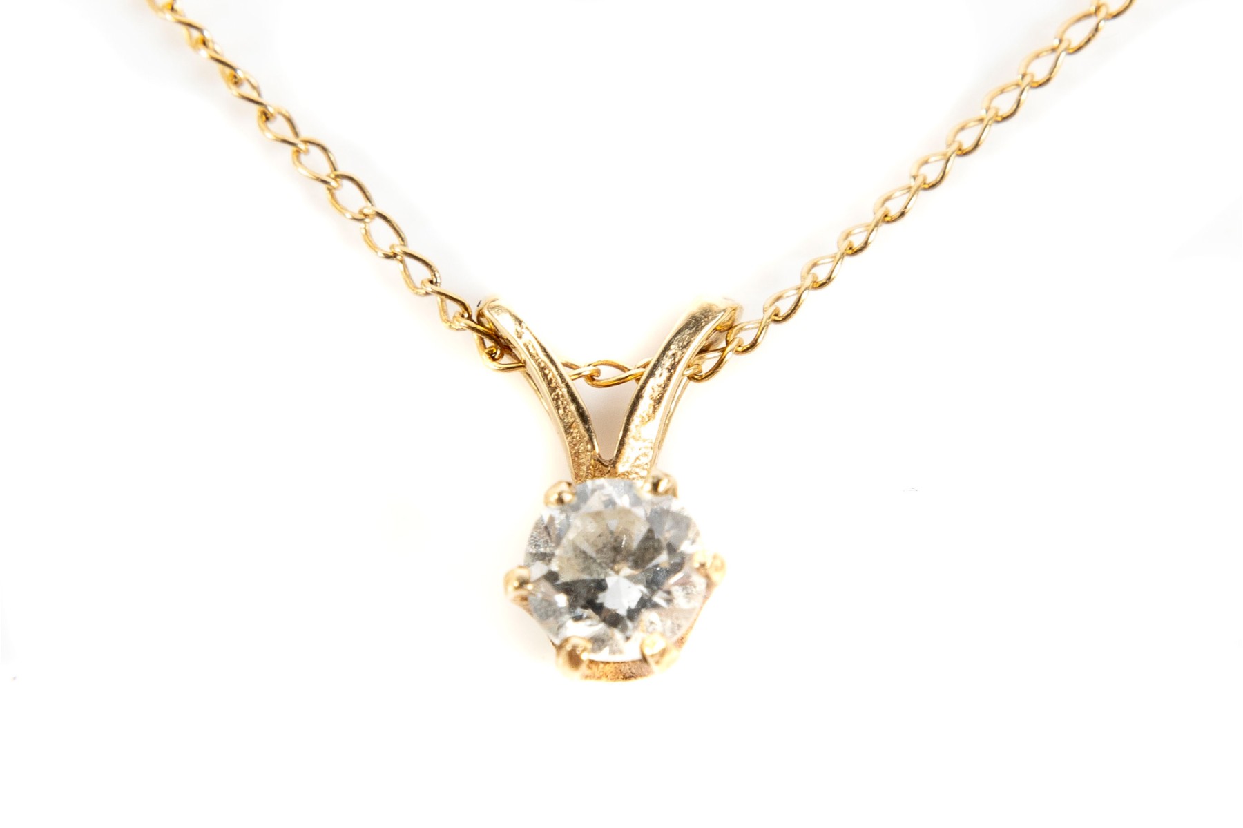 14K yellow gold pendant necklace. This slim cable link style chain displays a split bale pendant set with a single round brilliant cut diamond, approximately 0.25 cts. Spring ring clasp.
