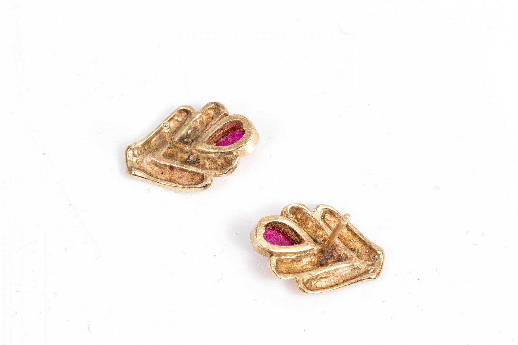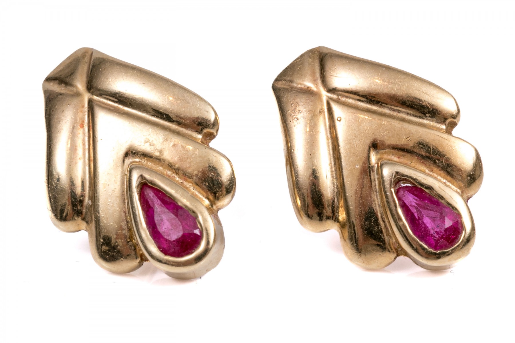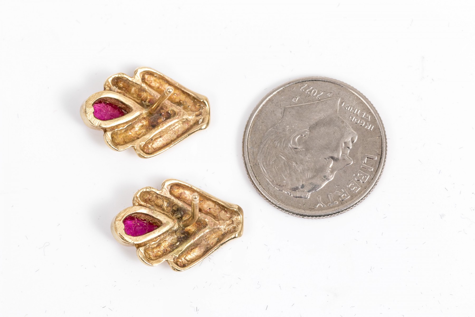 A pair of 14K yellow gold earrings. Set into these chevron style earrings are pear cut pink sapphires. Post backings.