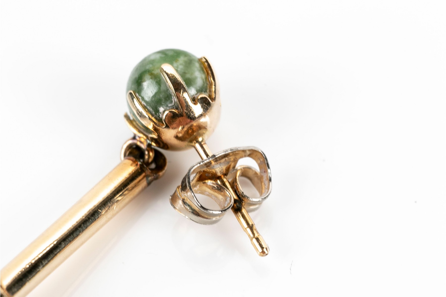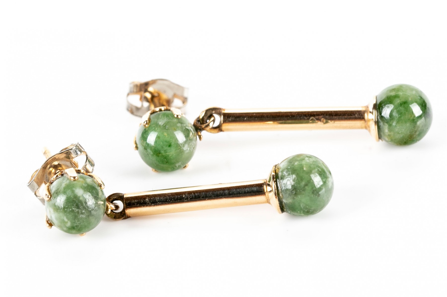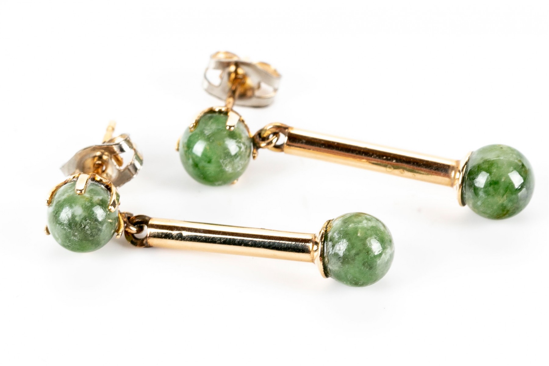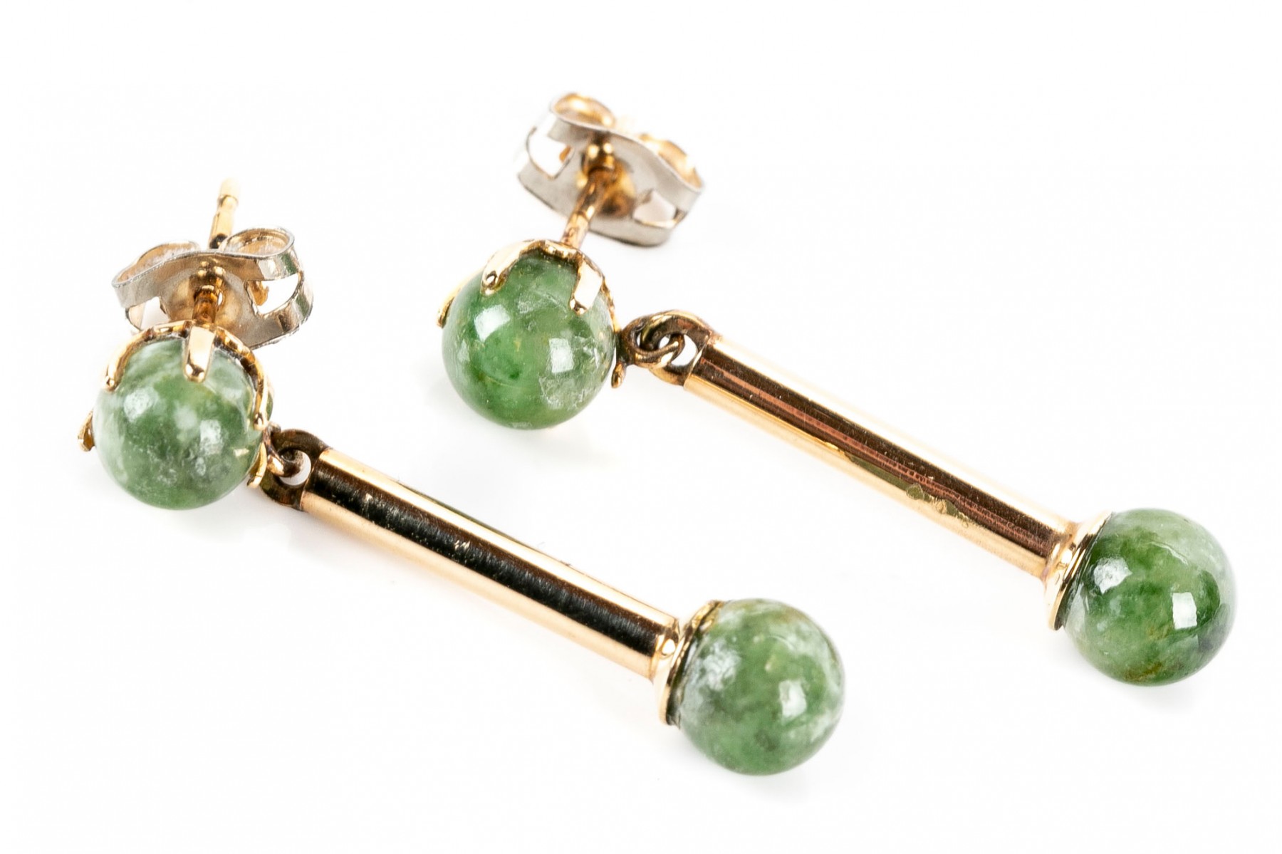 Wonderful pair of 14K yellow gold drop style earrings. Set at the top and suspended from the base of the earrings are 6mm beads of green serpentine. Post and clutch style backings.