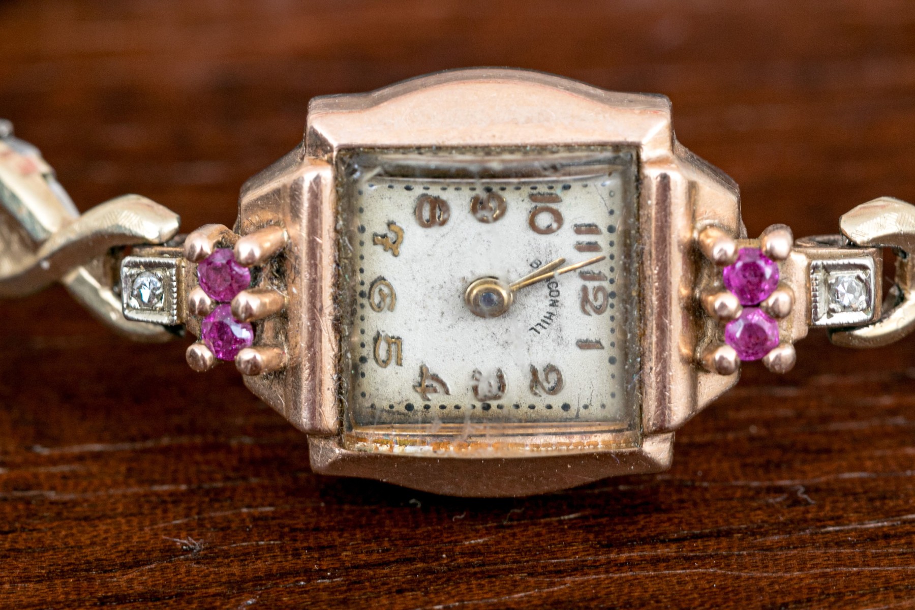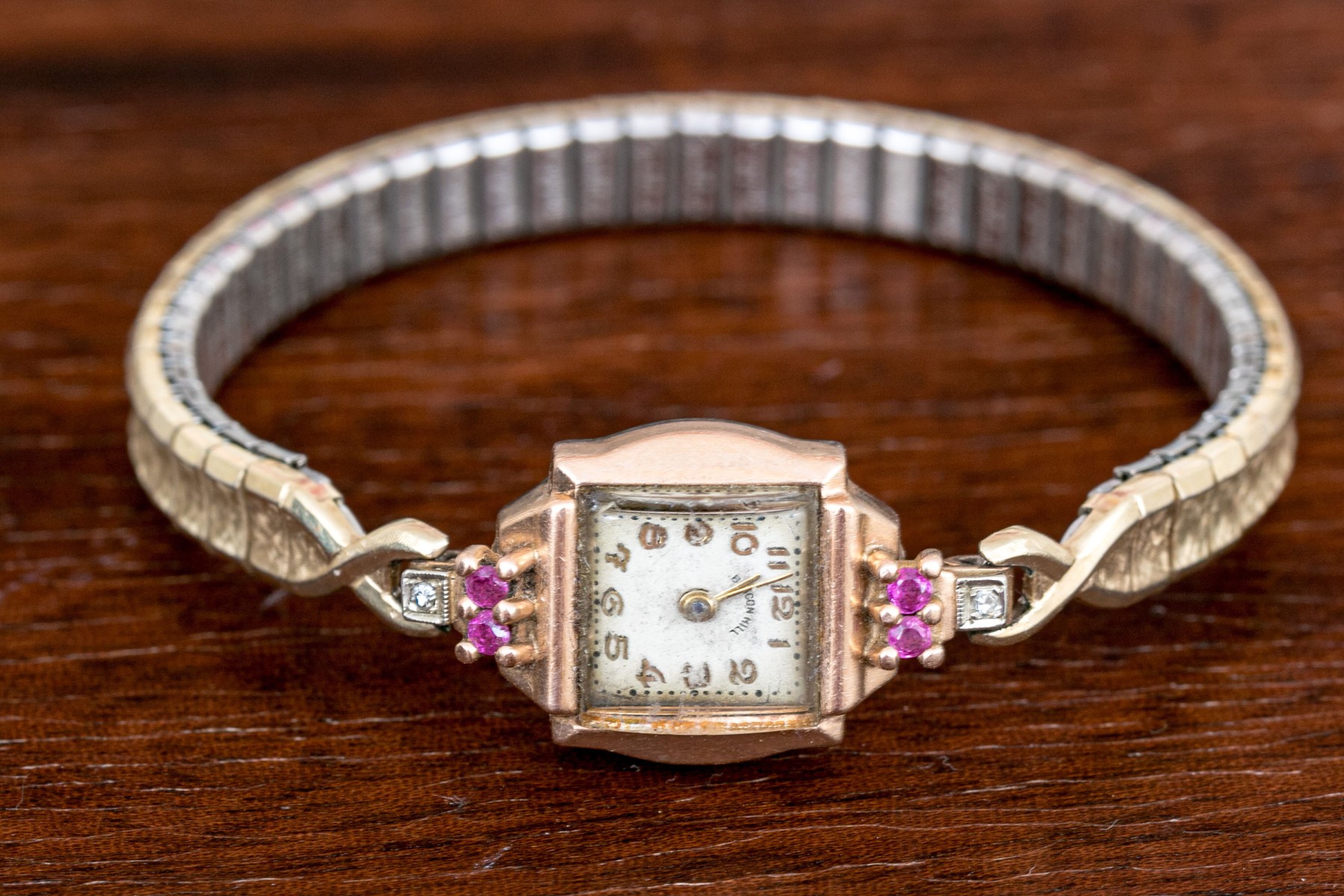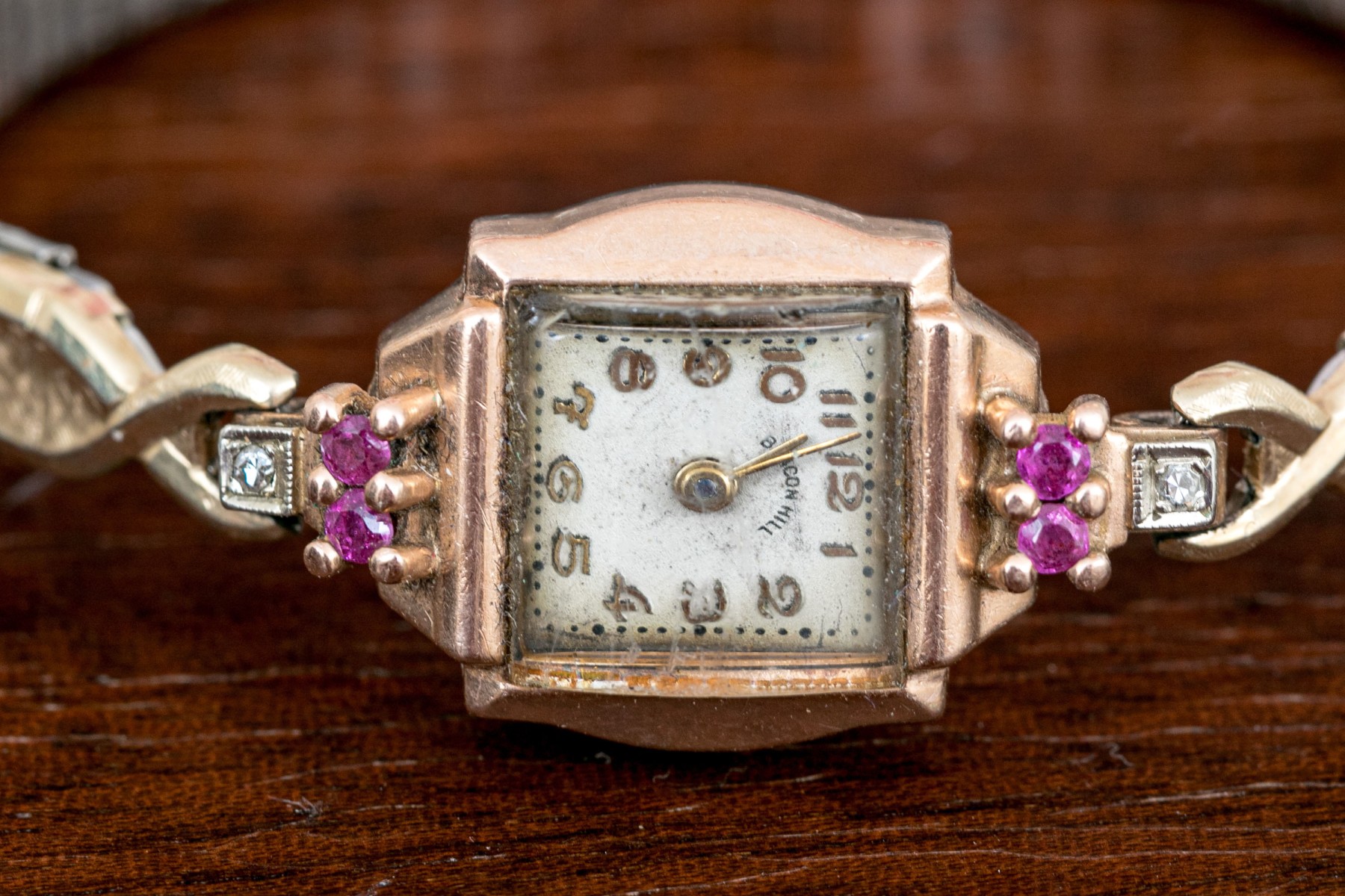 A lovely Beacon Hill ladies wristwatch sporting a square white dial with an Art Deco flare to the case. The case is detailed with two pinkish red gemstones in prong settings and single rough cut accent diamonds on the lugs, heralding a flexible gilt stainless steel bracelet. The case is marked 14K.