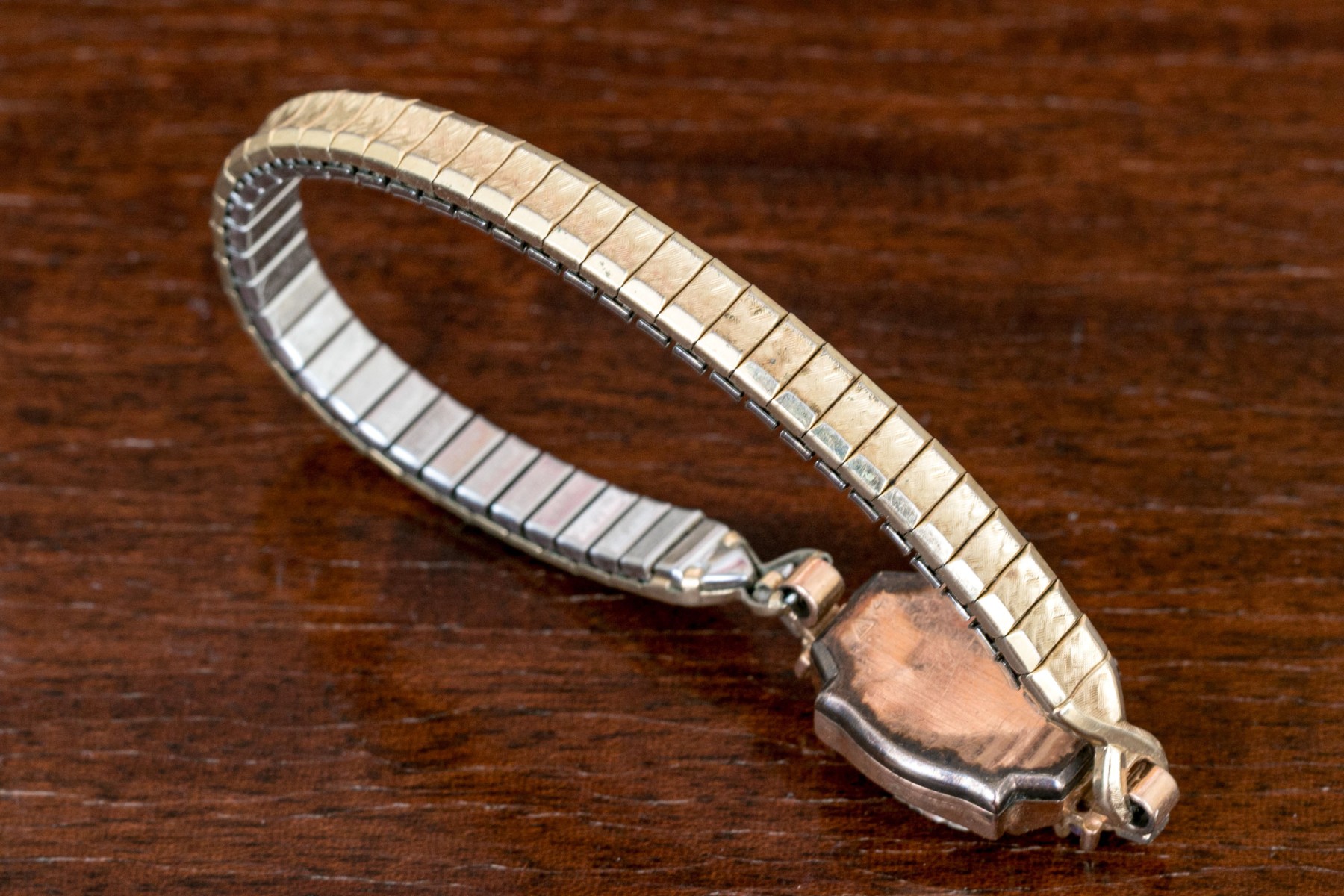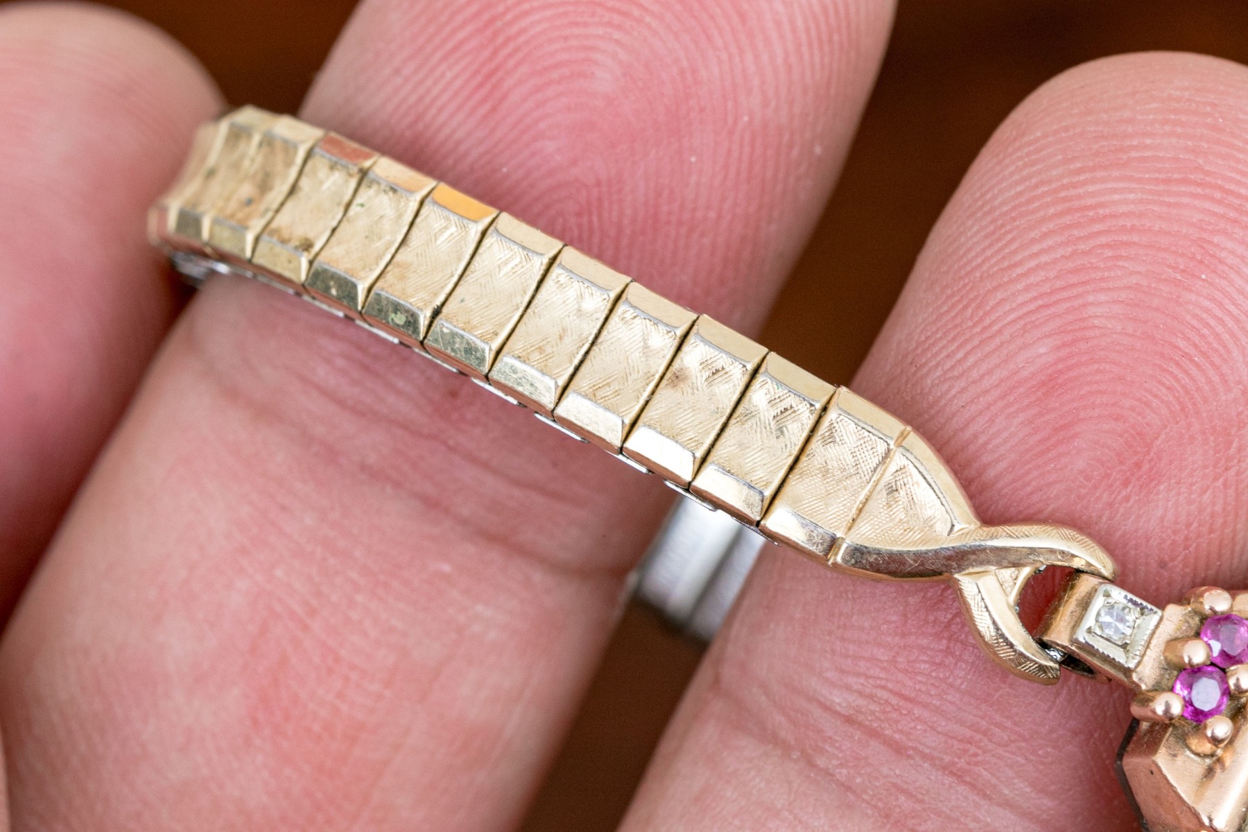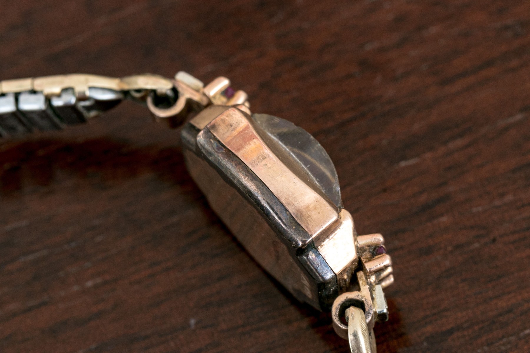 A lovely Beacon Hill ladies wristwatch sporting a square white dial with an Art Deco flare to the case. The case is detailed with two pinkish red gemstones in prong settings and single rough cut accent diamonds on the lugs, heralding a flexible gilt stainless steel bracelet. The case is marked 14K.