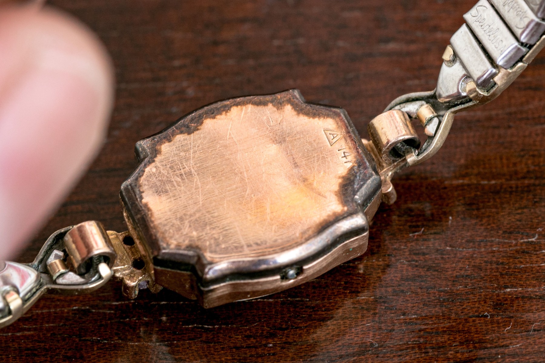With notable wear commensurate with age and use, including discoloration to the dial, nicks to the crystal, tarnishing to the back of the case, and surface scratches around the case and strap. The working condition has not been tested.