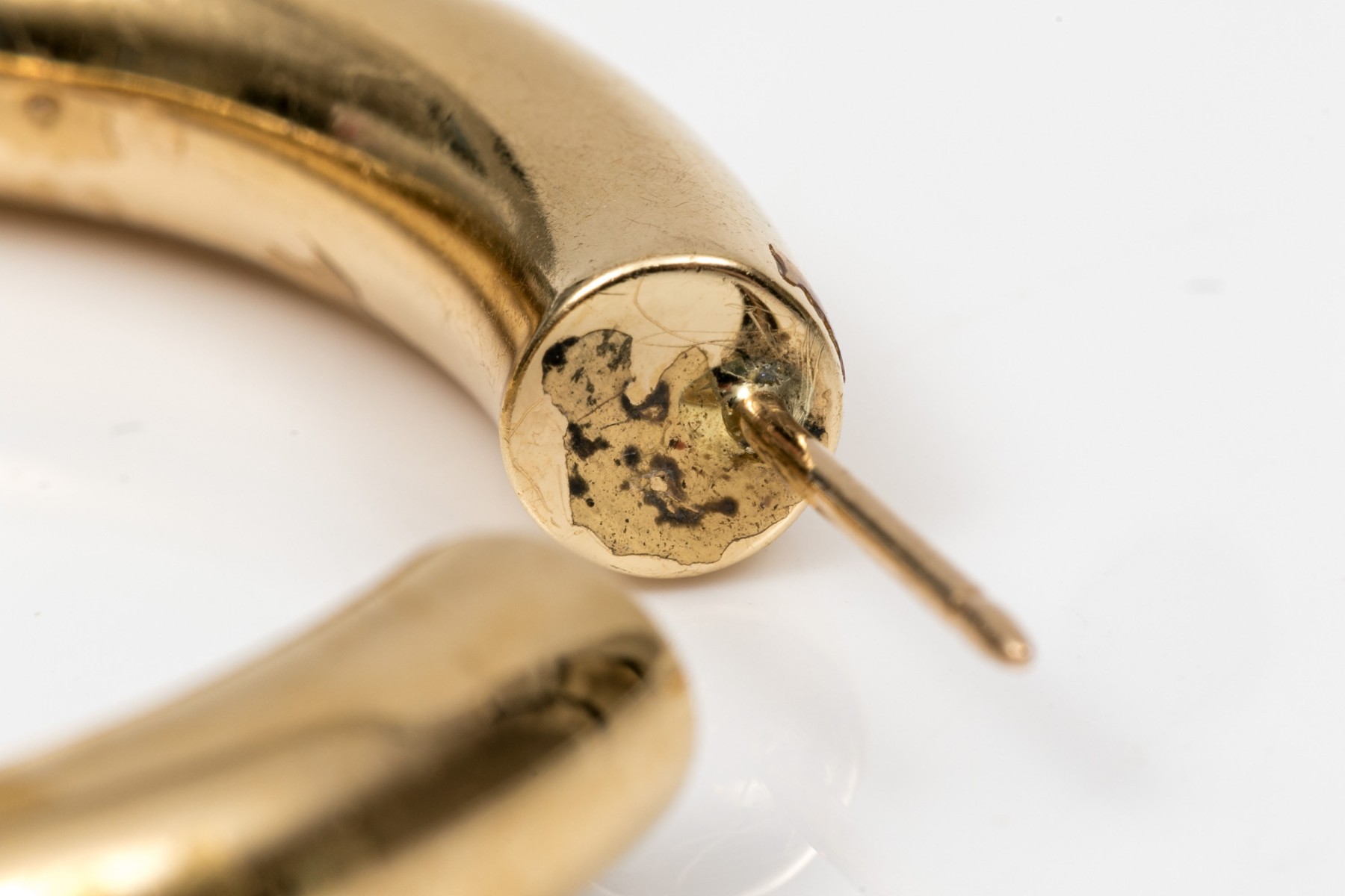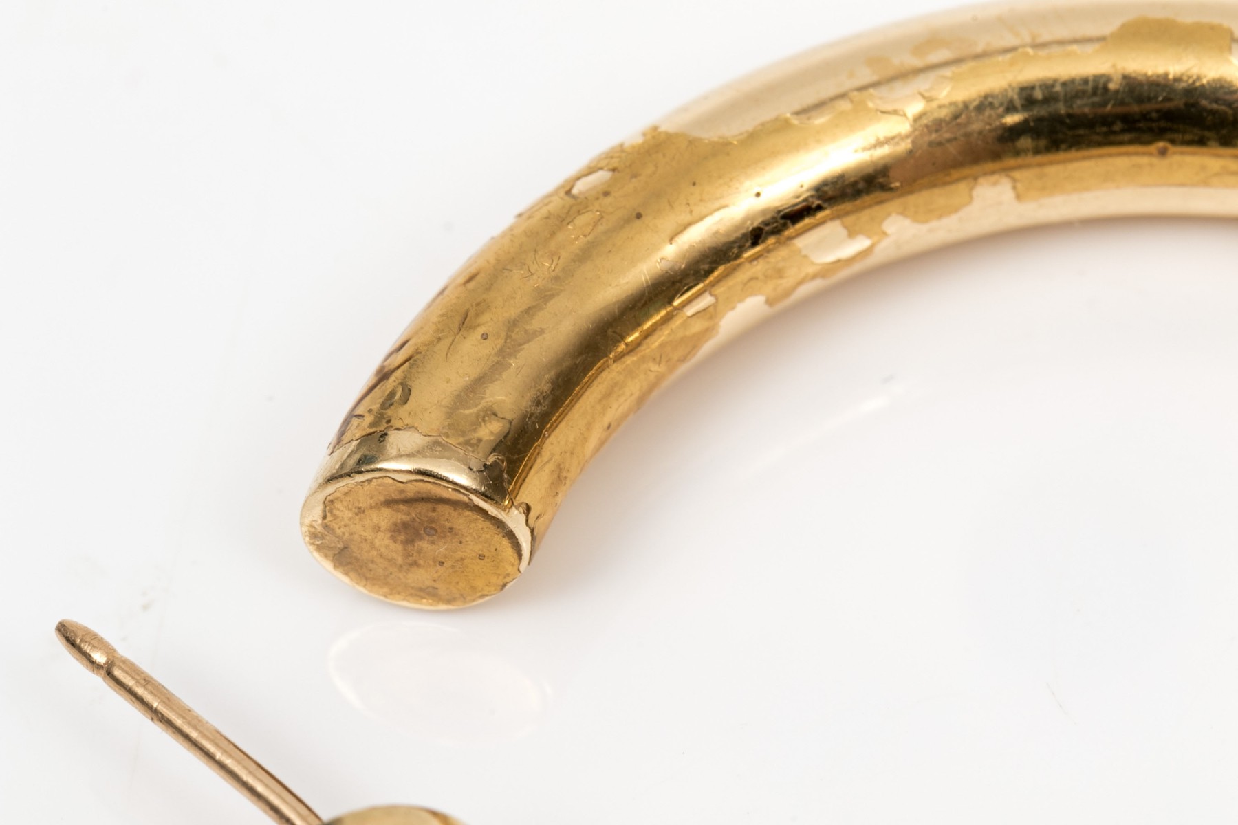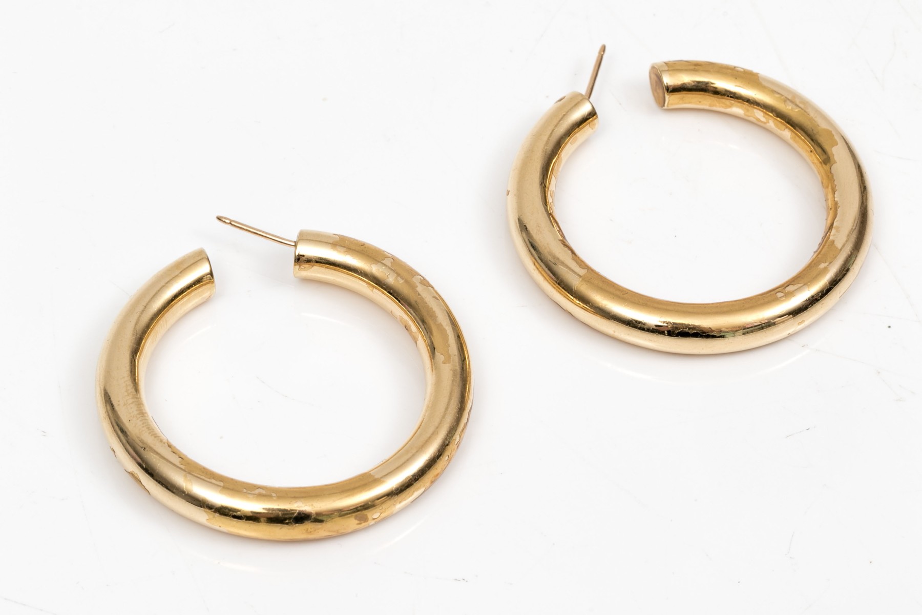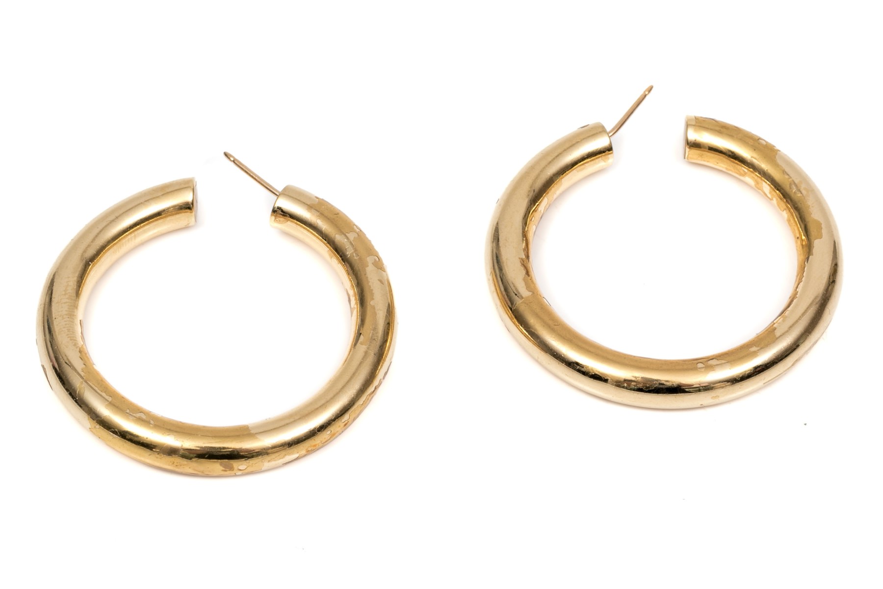 A pair of 14K yellow gold hoop earrings. The earrings have a bright polished finish with a lacquer finish. Post backings.