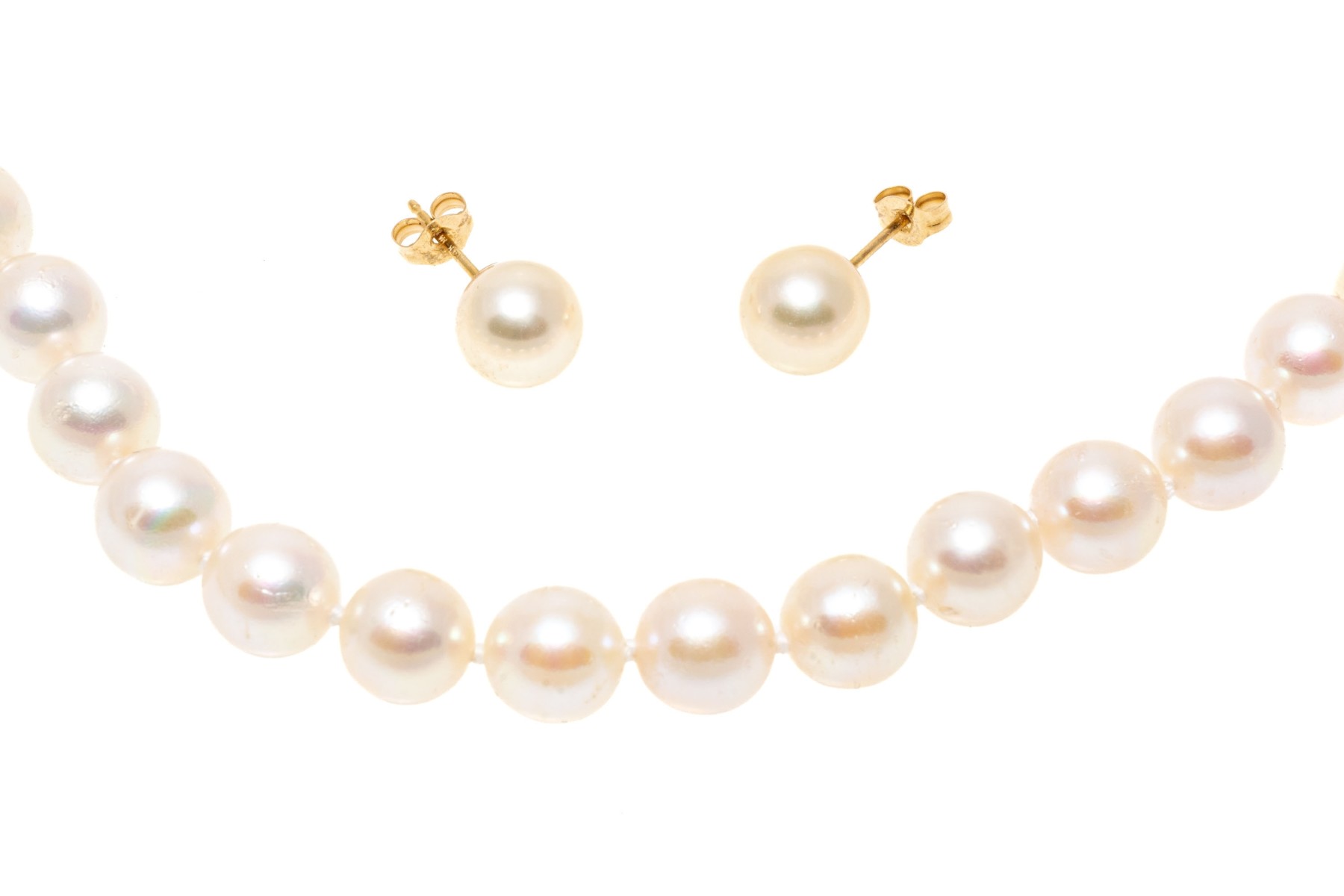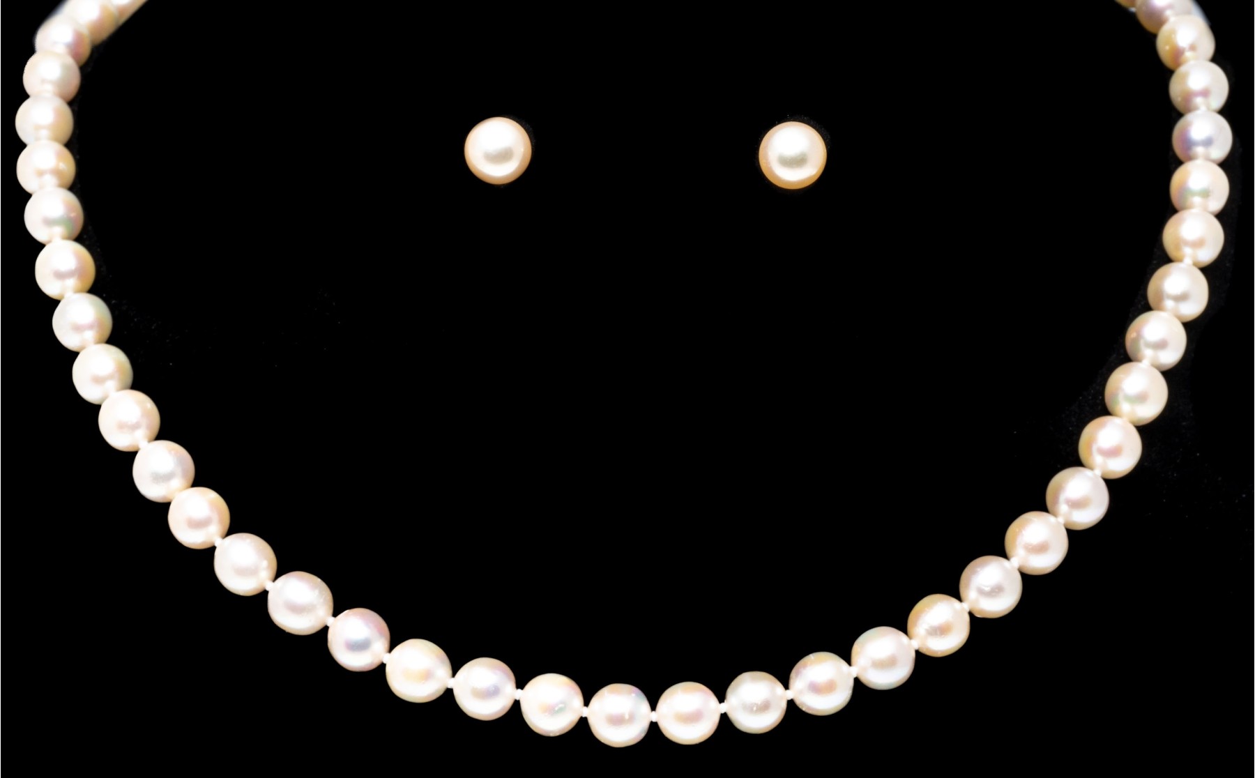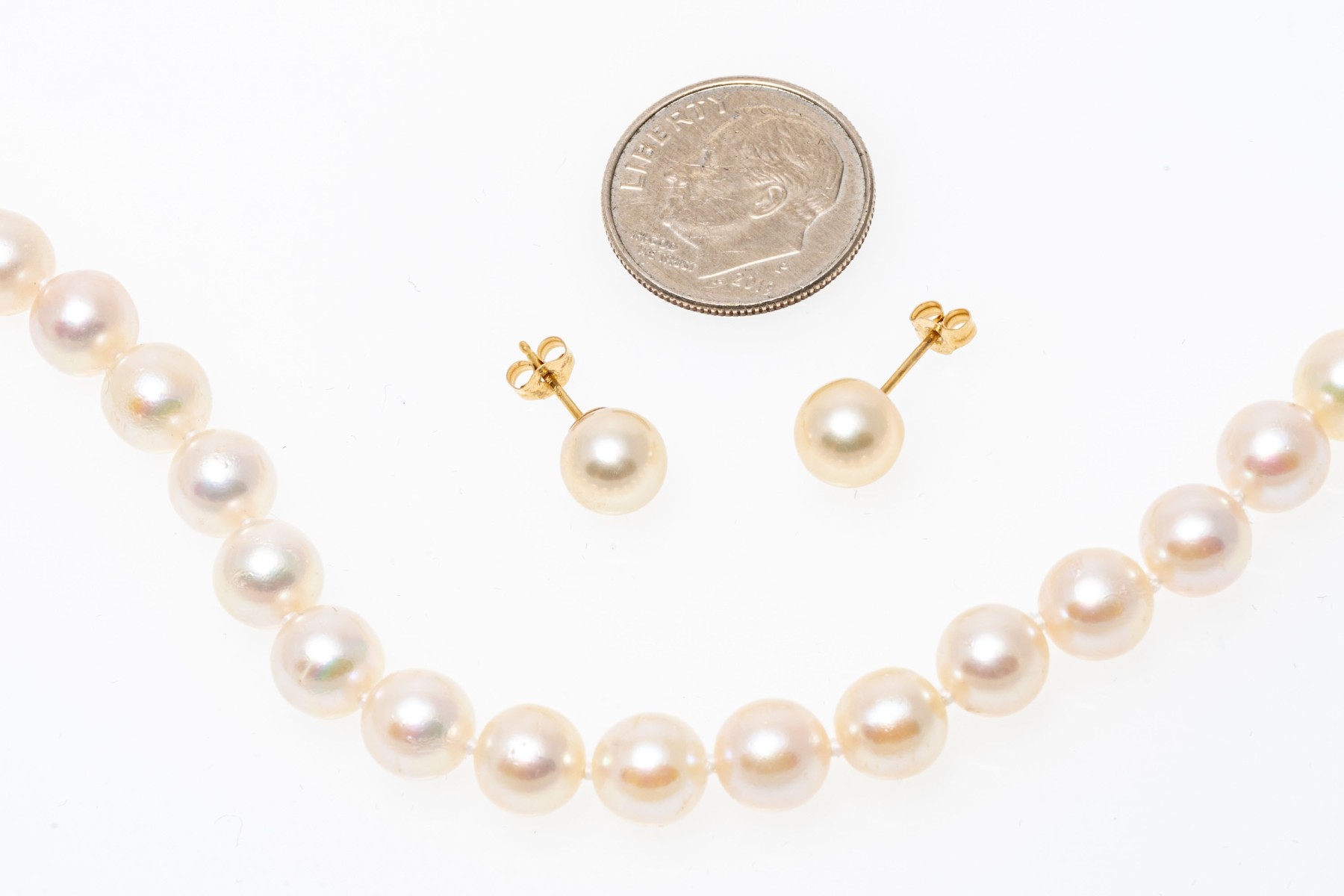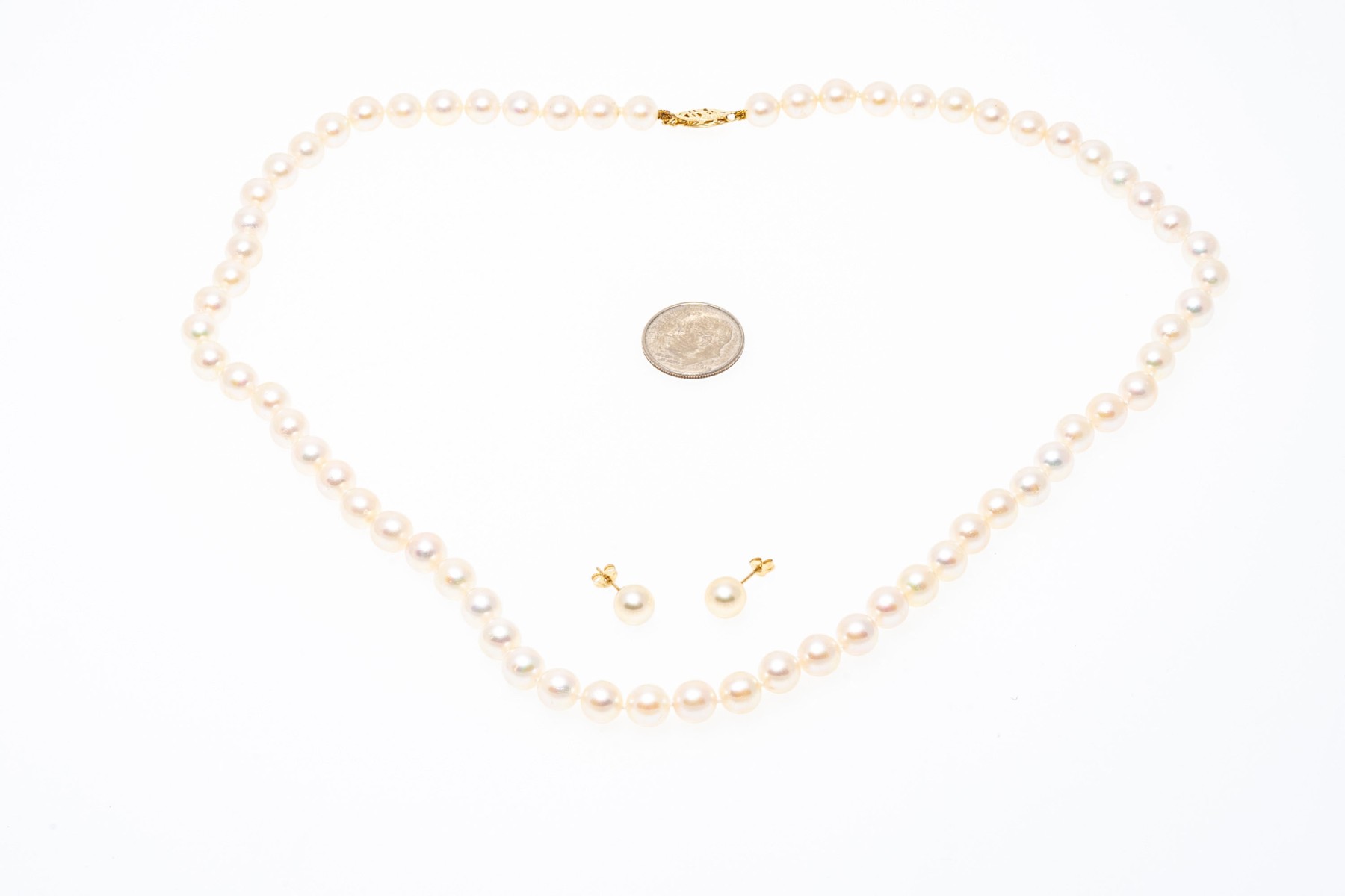 Complimentary bright white cultured pearl strung necklace and stud earrings. Cultured pearls average 6.5mm. Necklace secures with a 14K yellow gold fish hook clasp. Earrings have 14K yellow gold post and clutch backings.