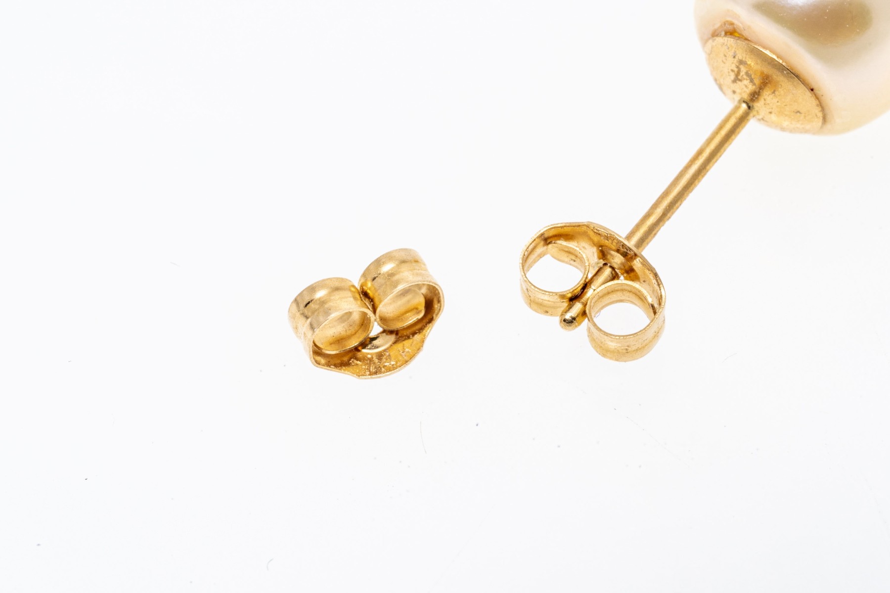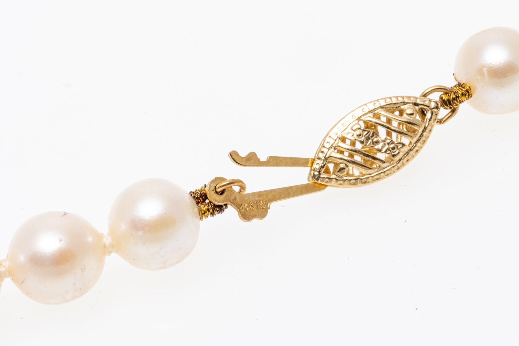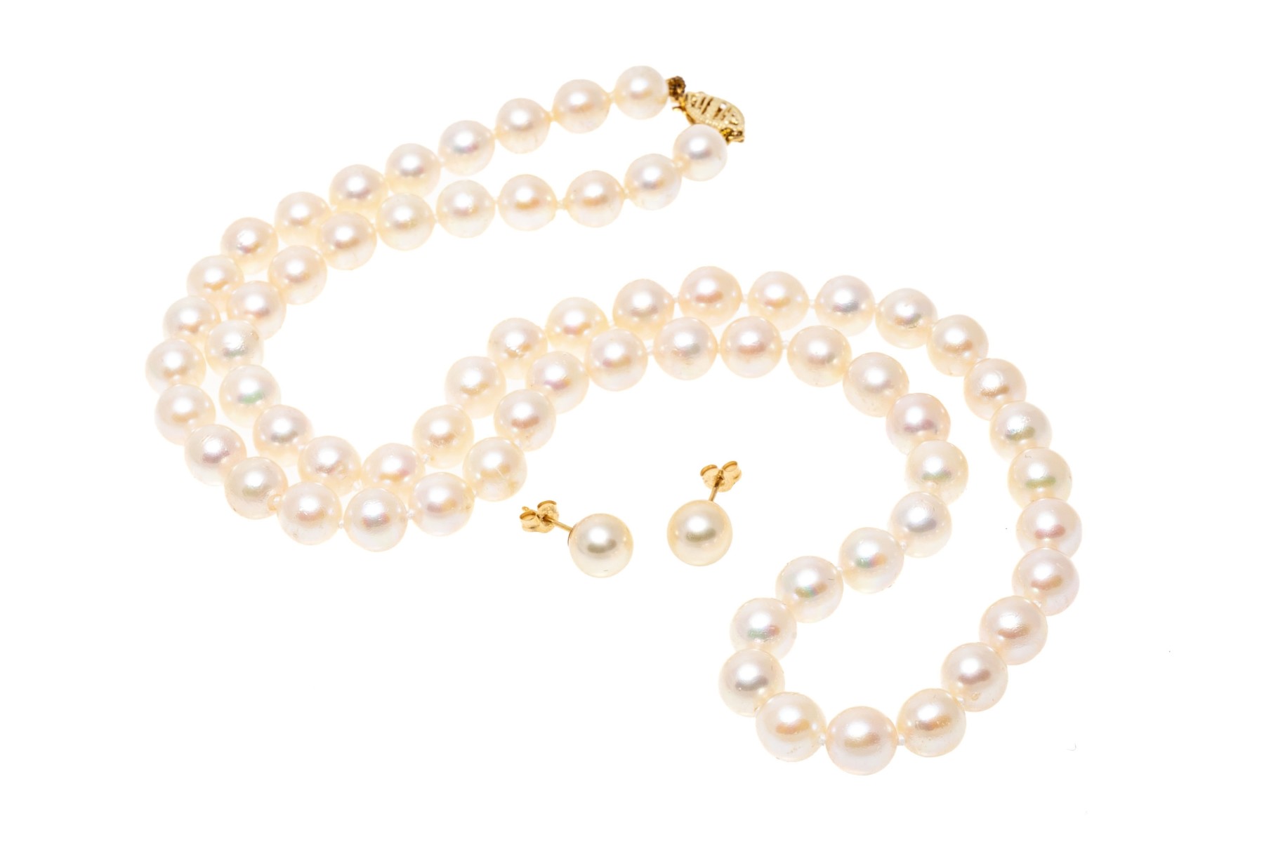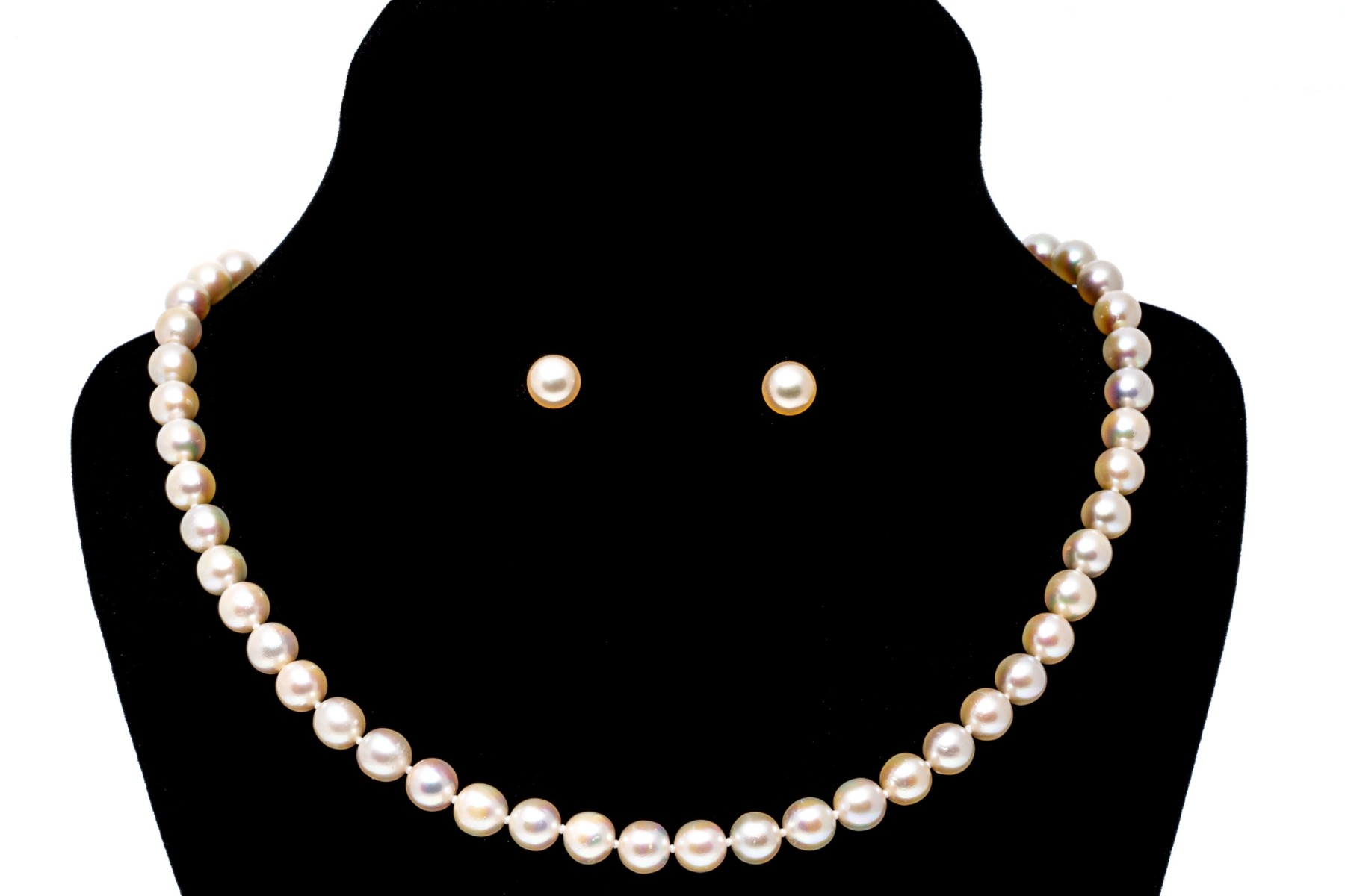 Complimentary bright white cultured pearl strung necklace and stud earrings. Cultured pearls average 6.5mm. Necklace secures with a 14K yellow gold fish hook clasp. Earrings have 14K yellow gold post and clutch backings.