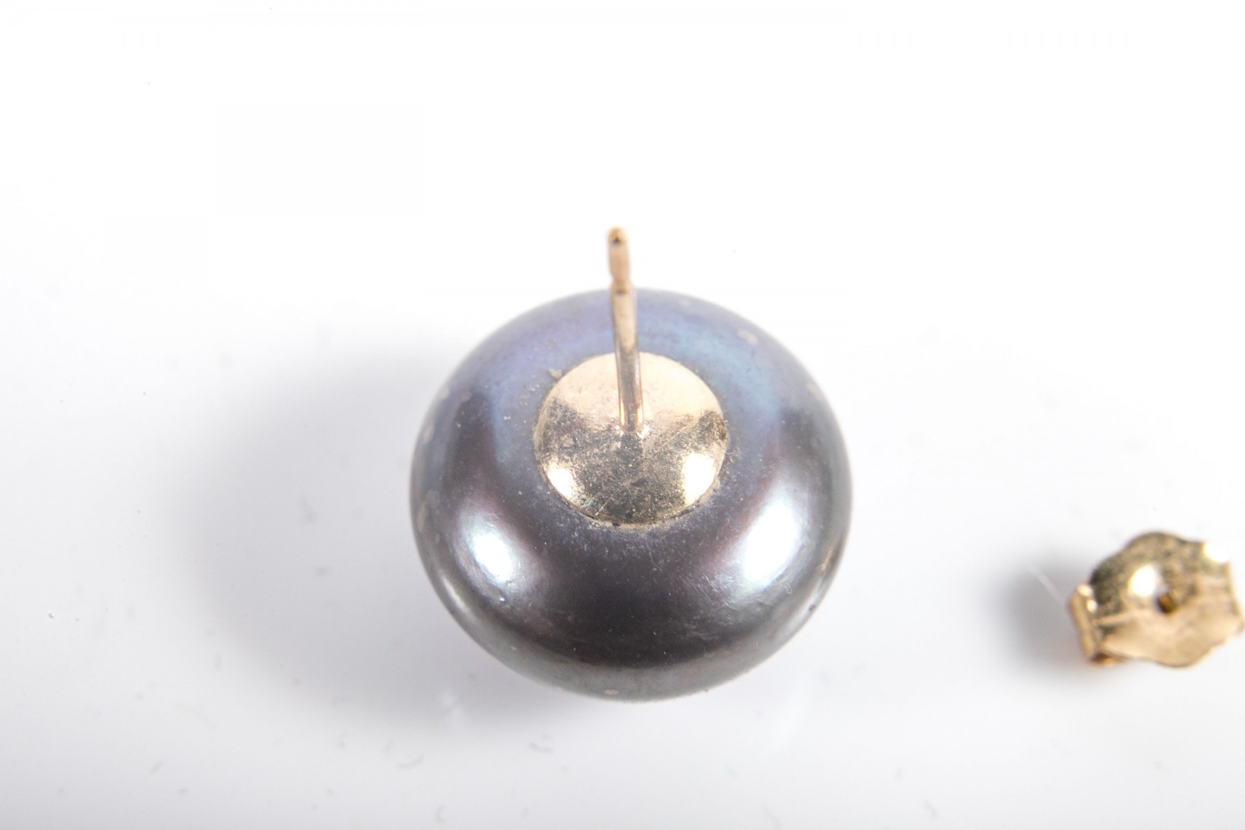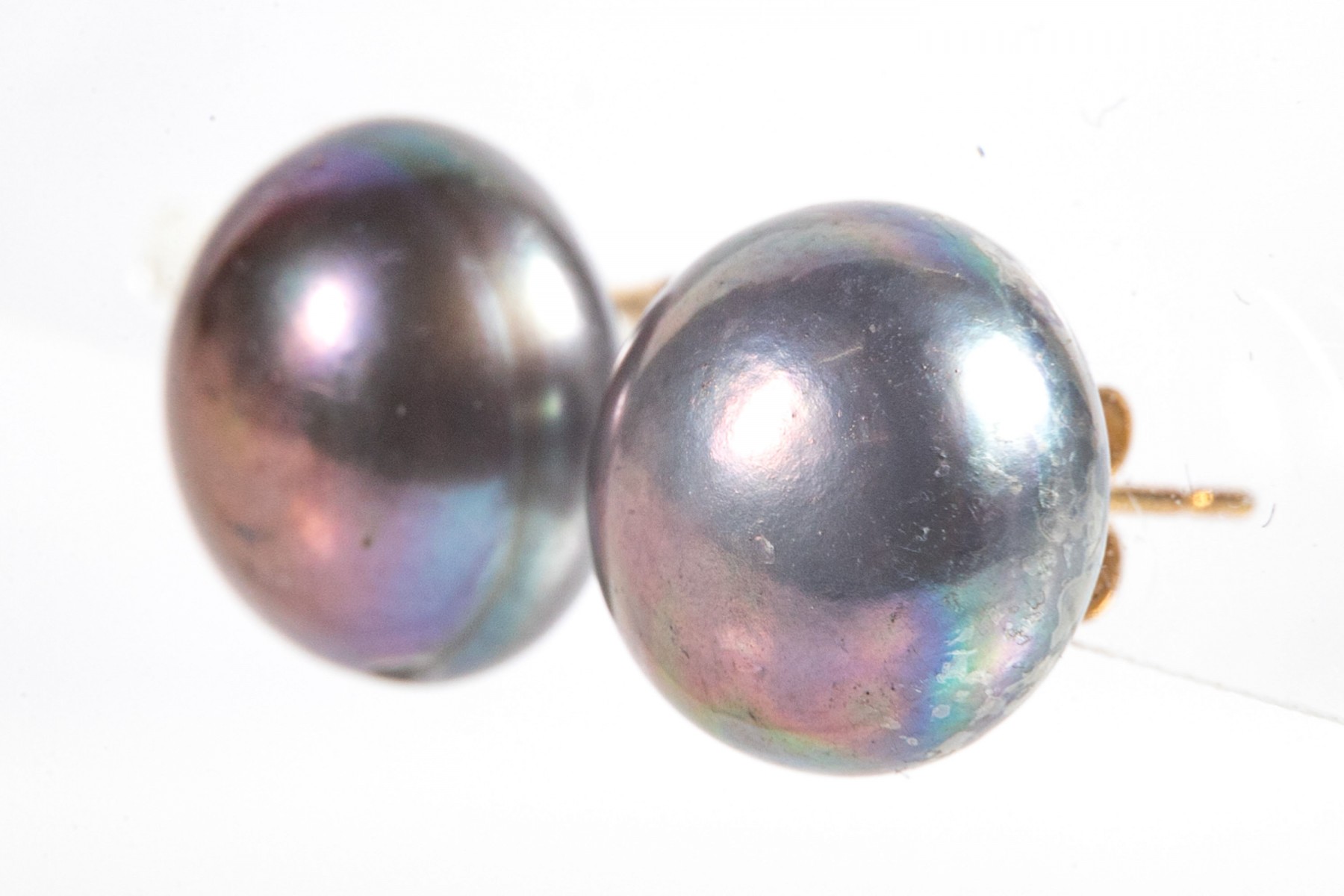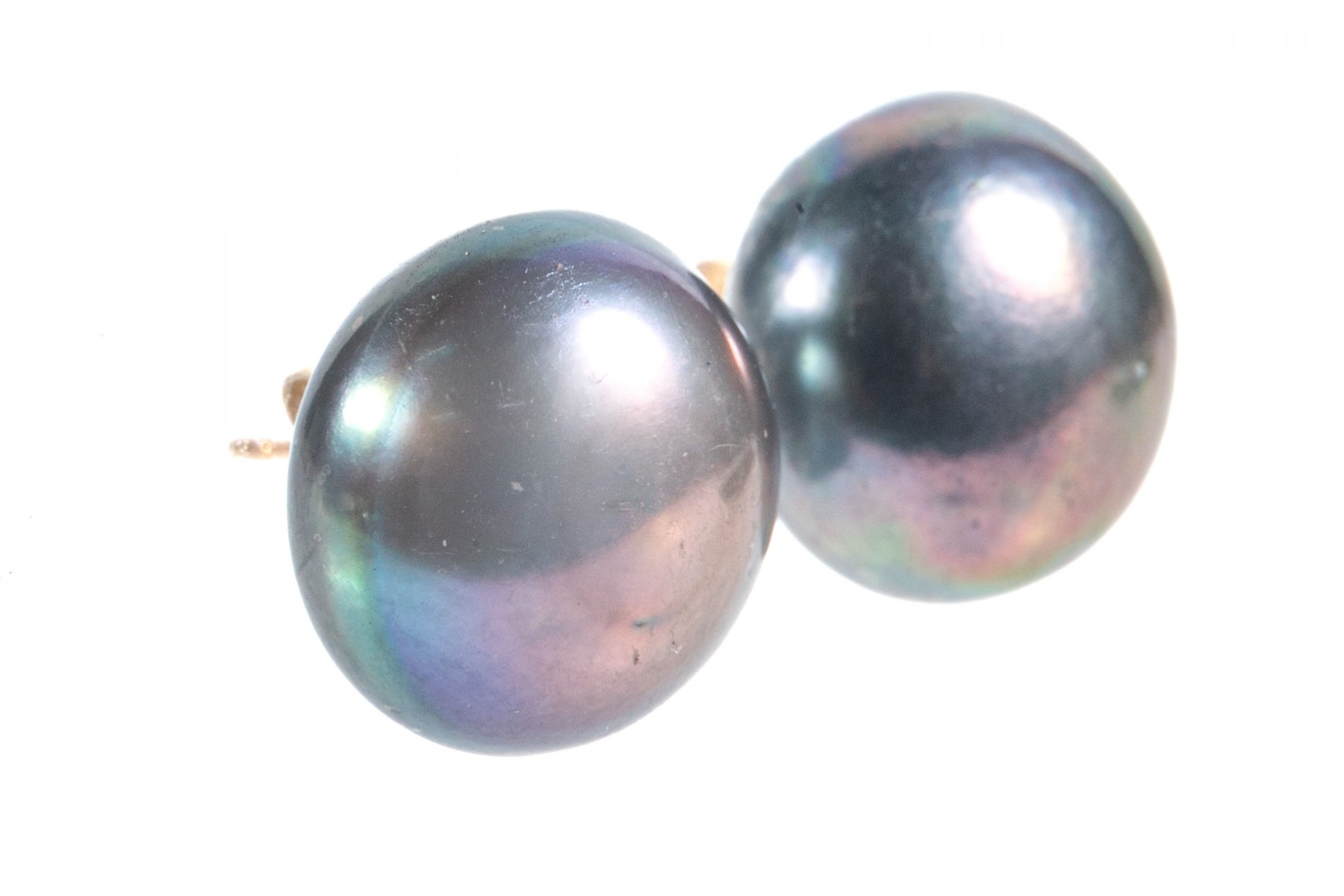 A beautiful pair of large cultured button pearls in steely black with iridescent blue and purple hues, mounted to yellow gold posts.
