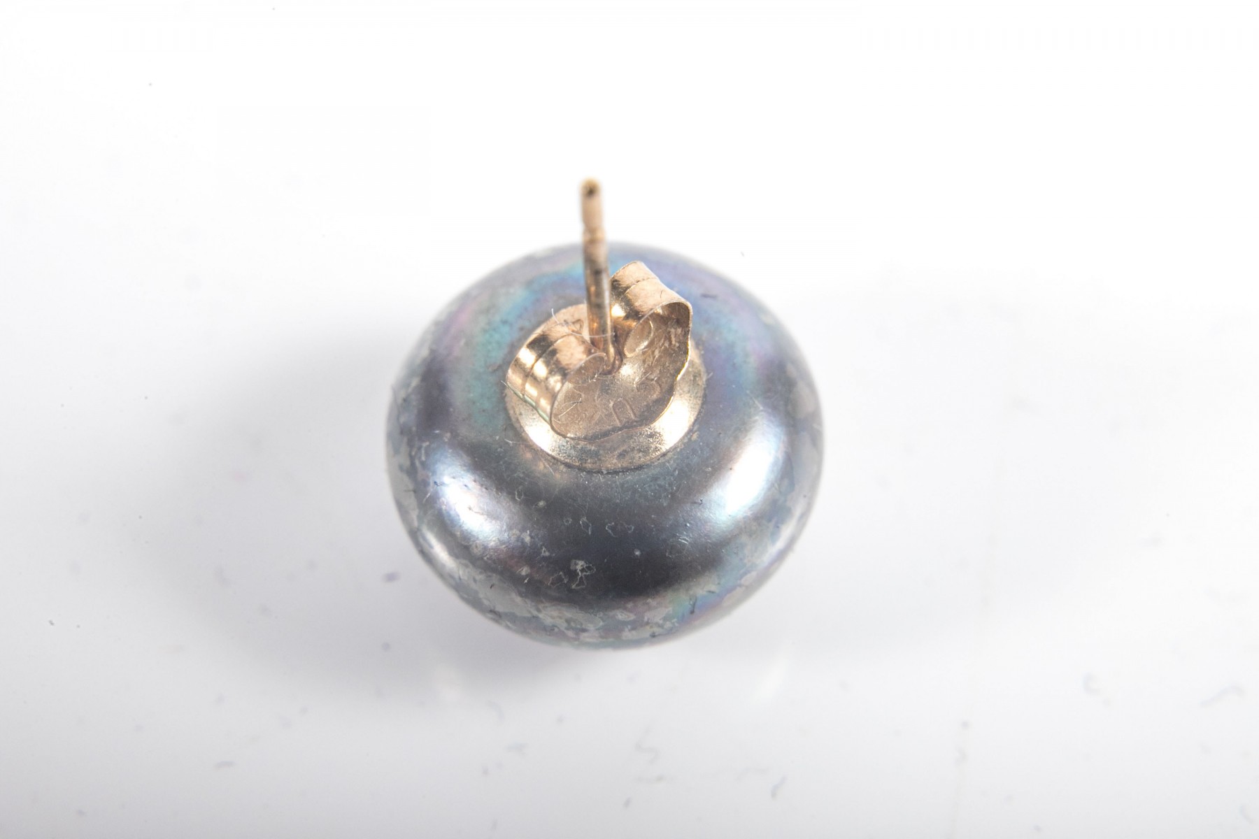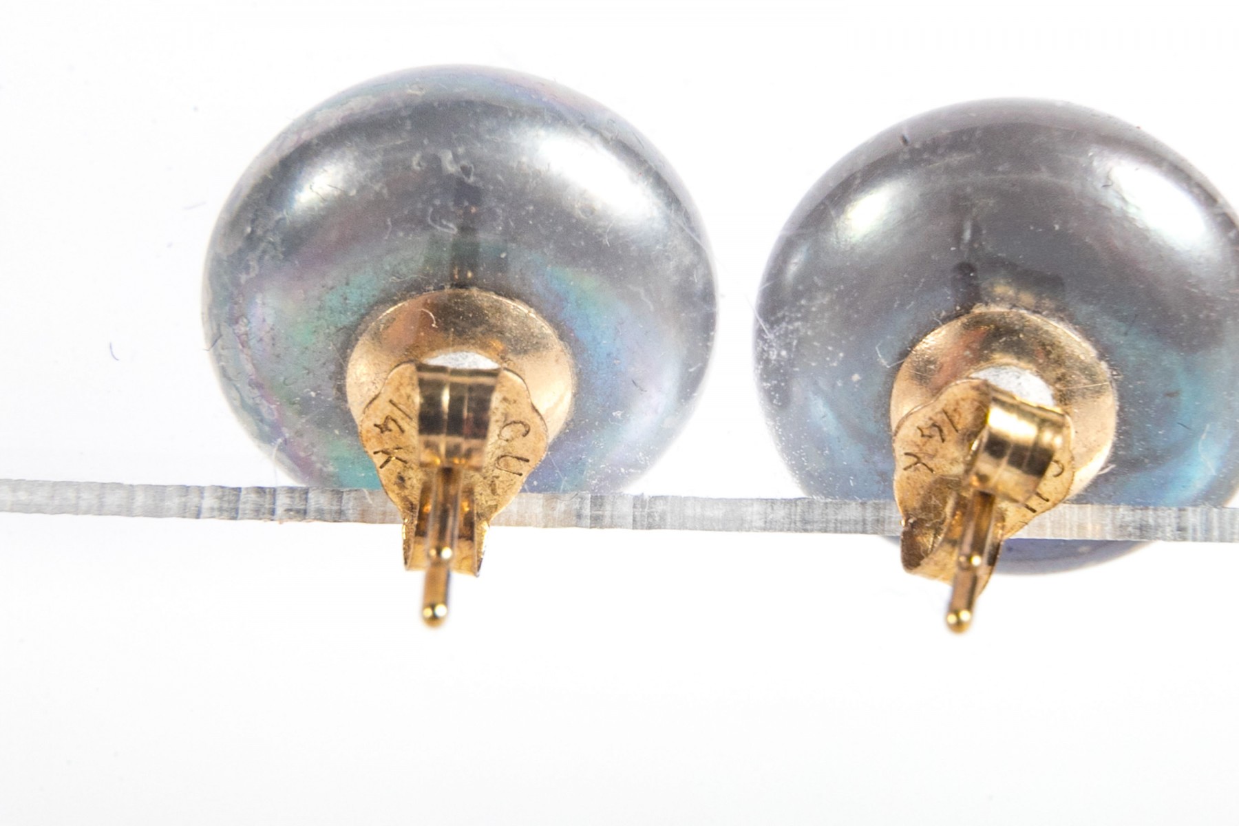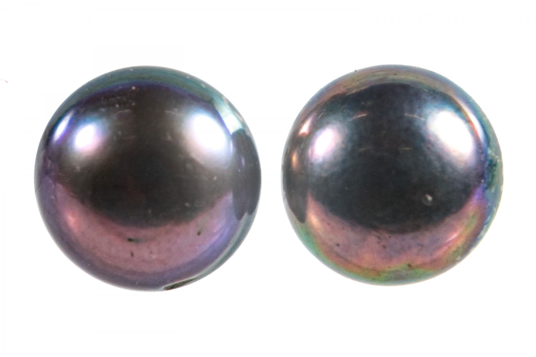 A beautiful pair of large cultured button pearls in steely black with iridescent blue and purple hues, mounted to yellow gold posts.