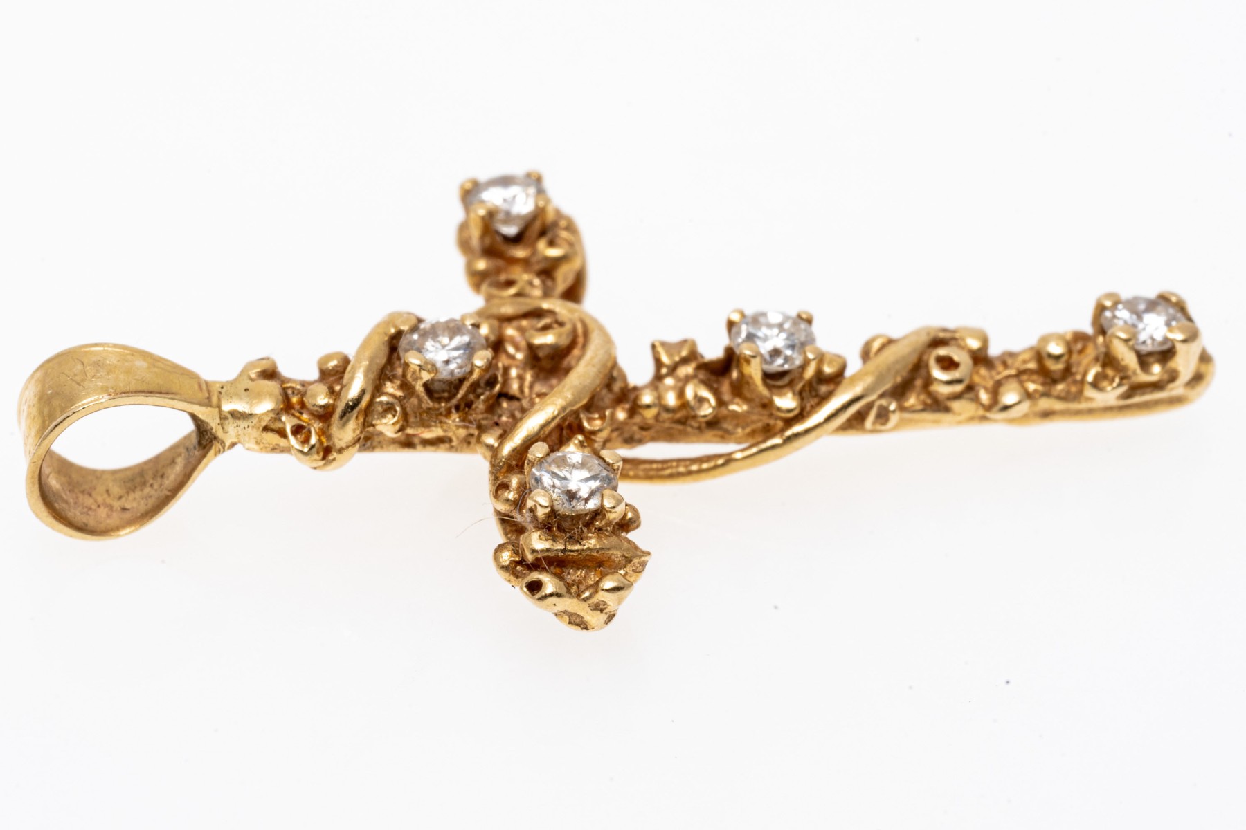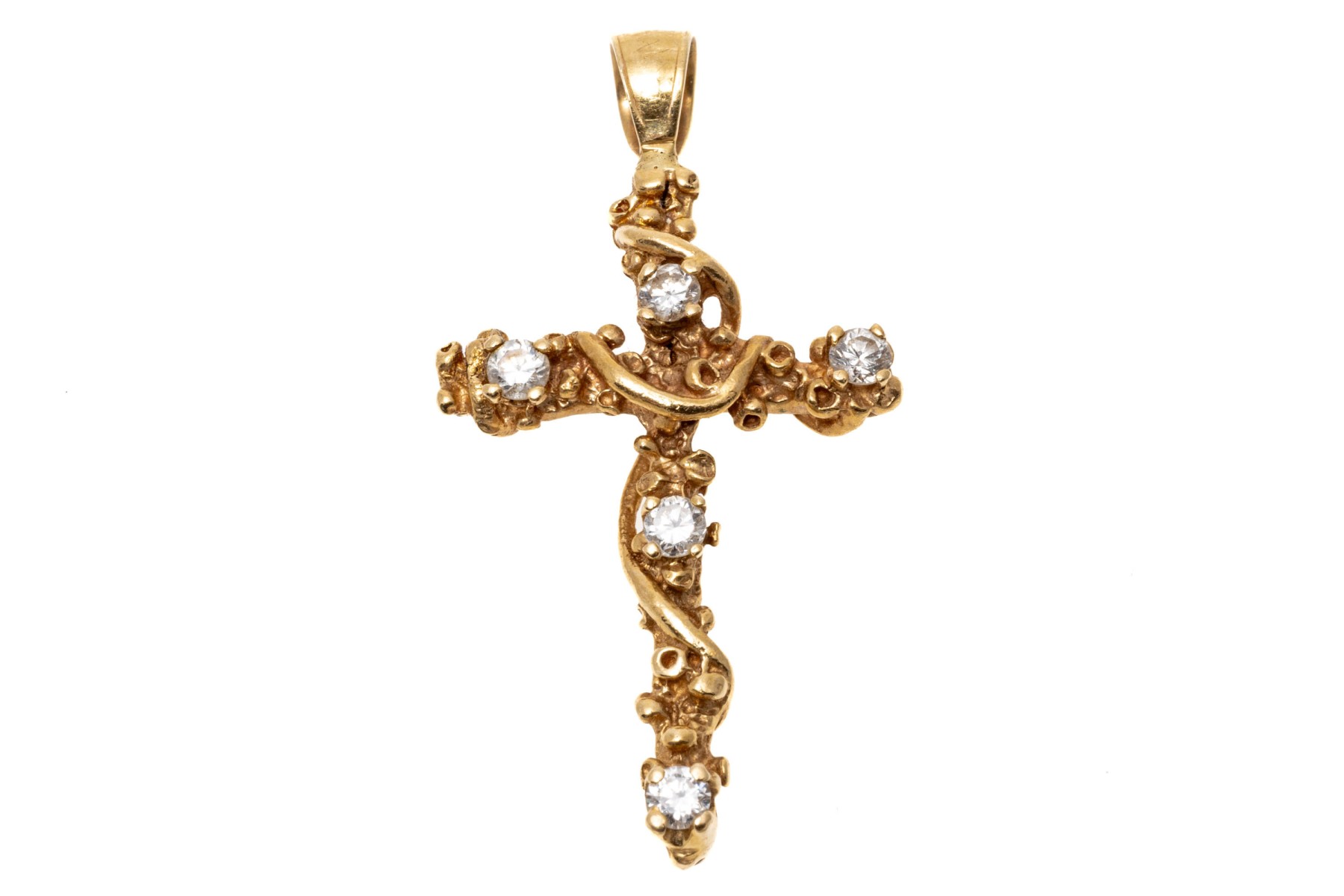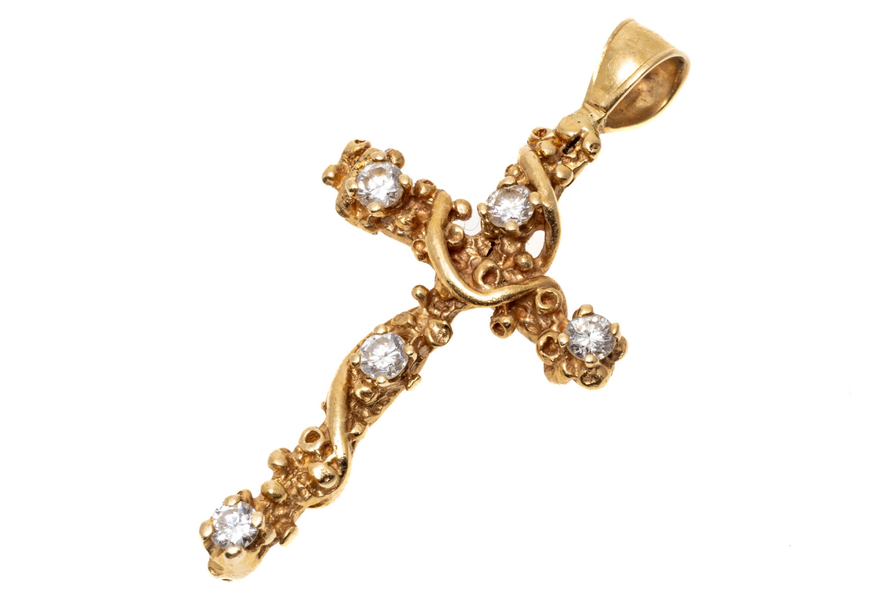 14K yellow gold pendant. This delicate cross form pendant has a wrapped in a vine design and set with five round brilliant cut diamonds, approximately 0.26 TCW.