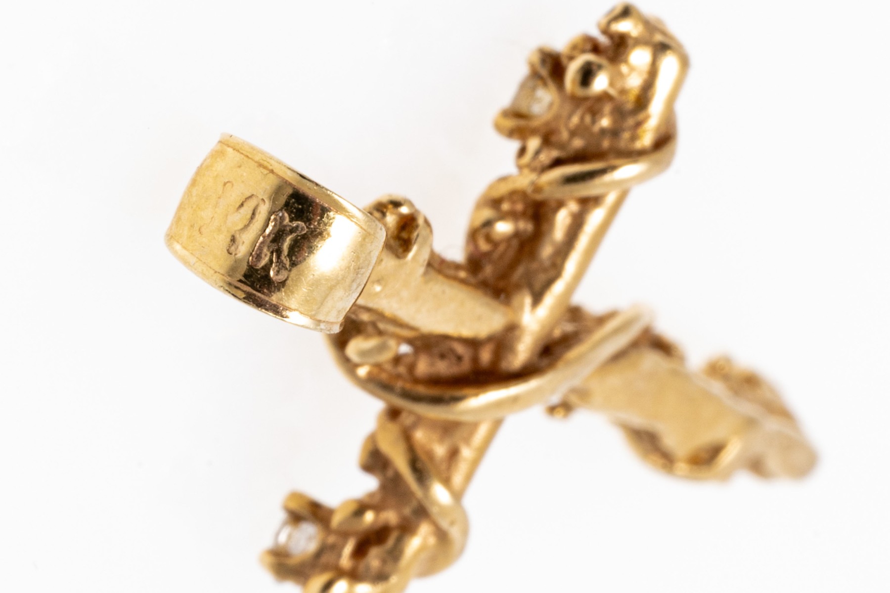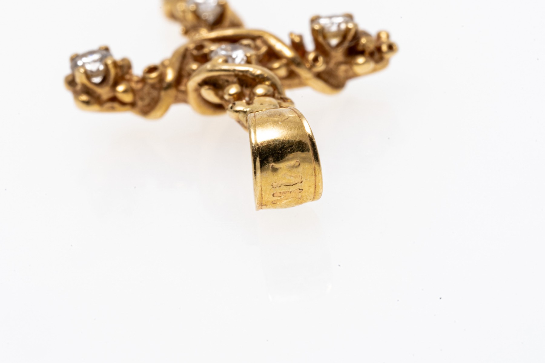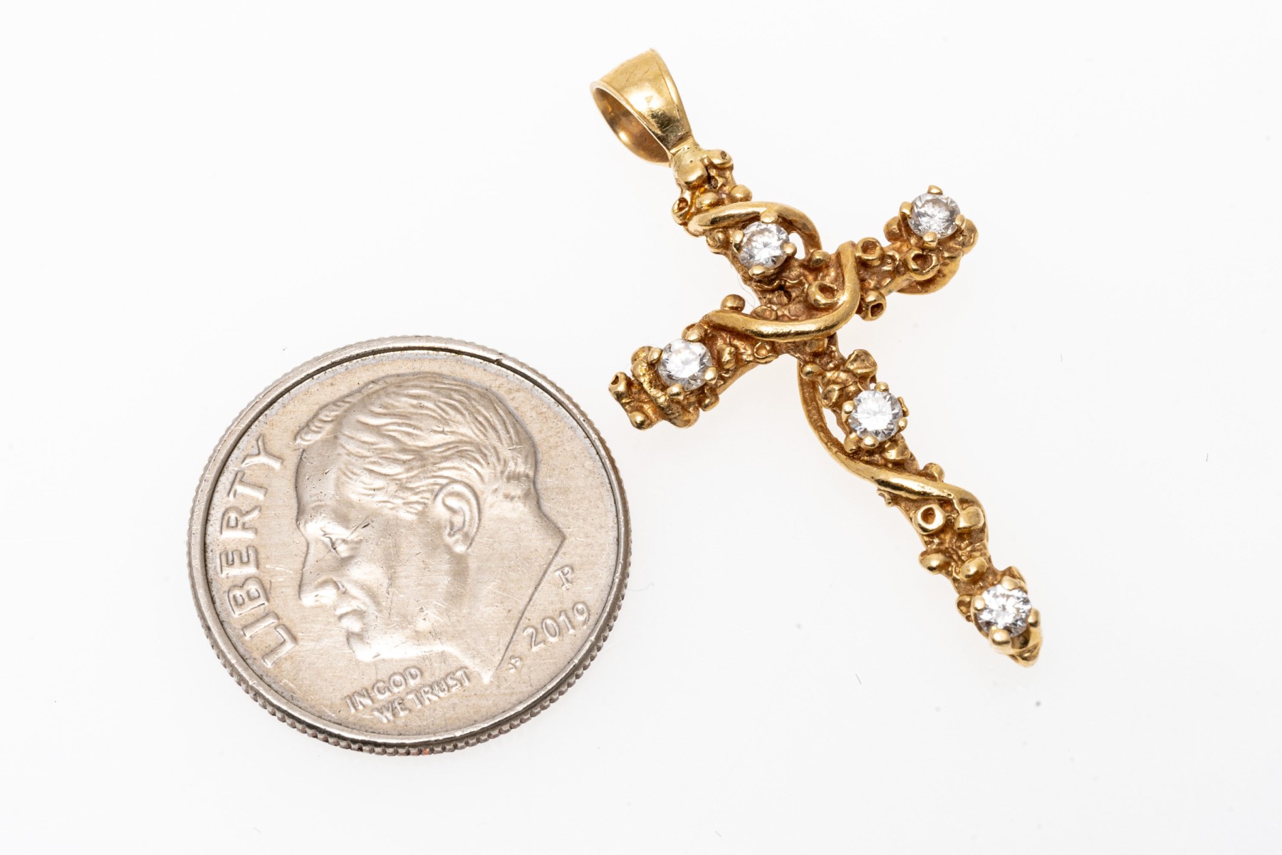 14K yellow gold pendant. This delicate cross form pendant has a wrapped in a vine design and set with five round brilliant cut diamonds, approximately 0.26 TCW.