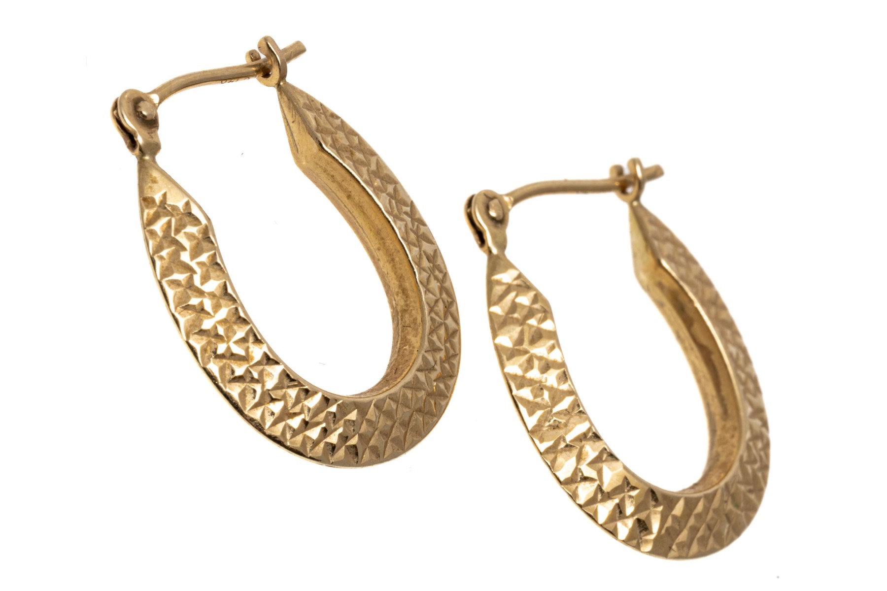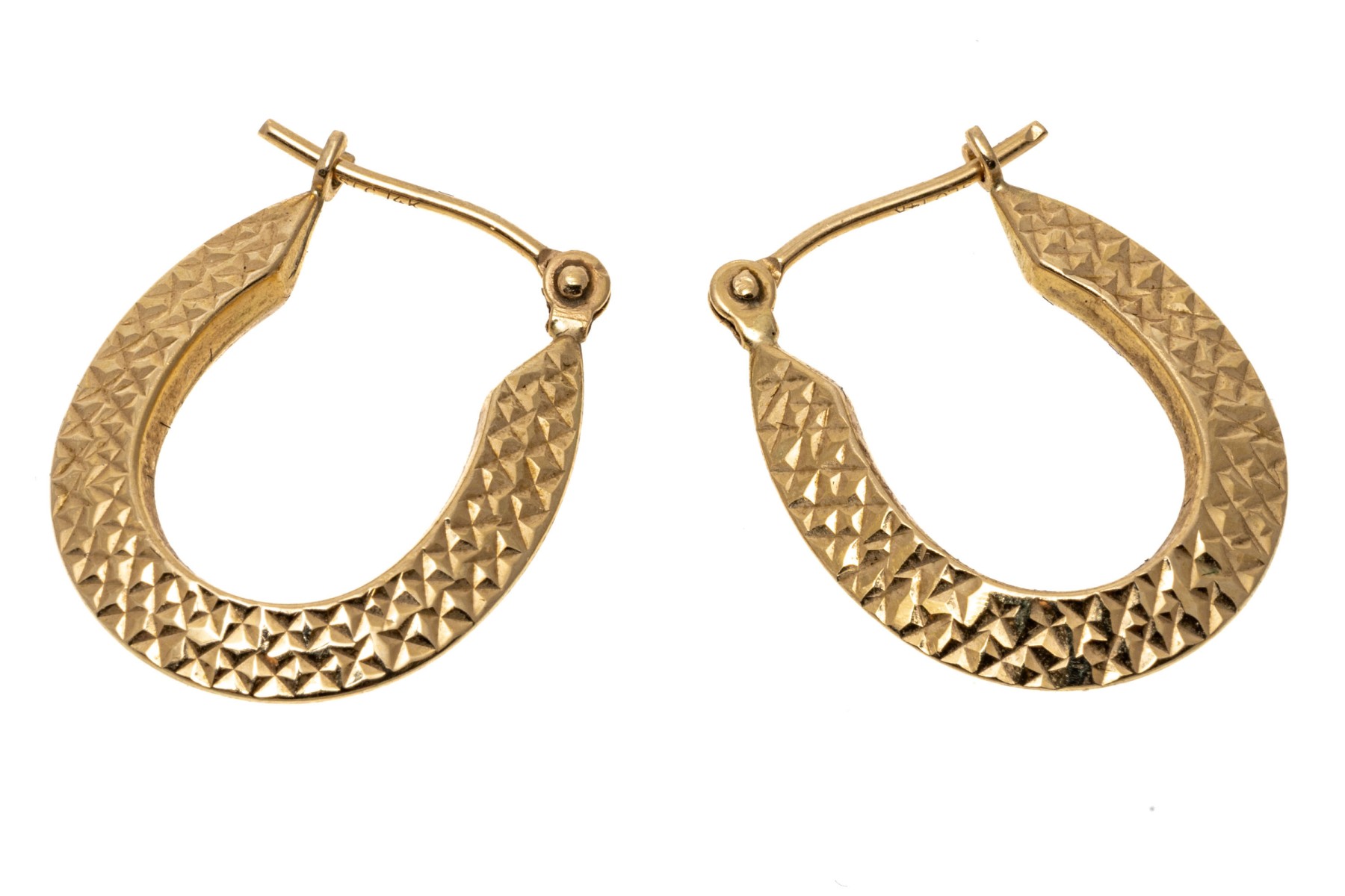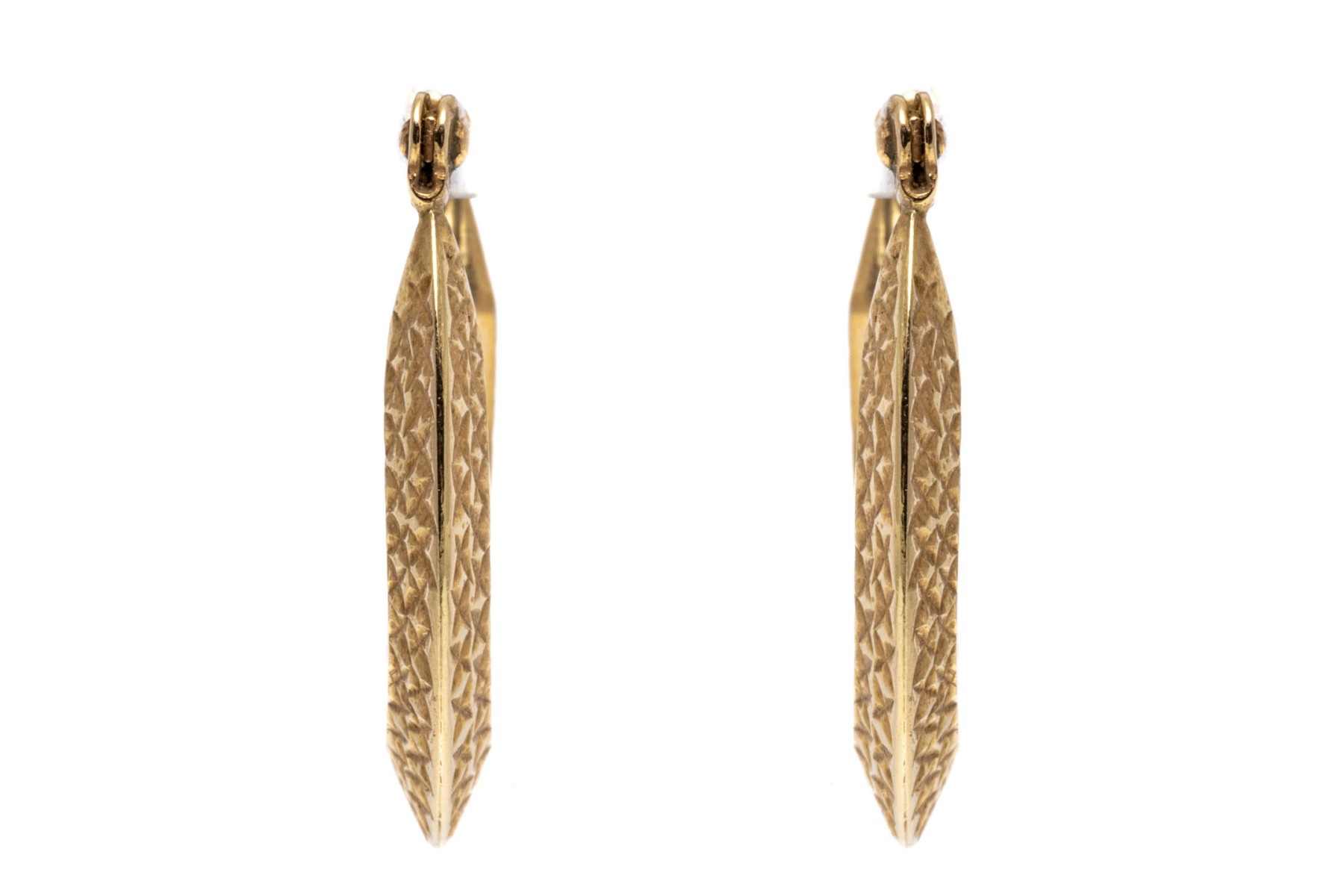 14K yellow gold elongated hoop earrings. The earrings have a diamond cut that creates an eye-catching shimmer. Leaver post backing.