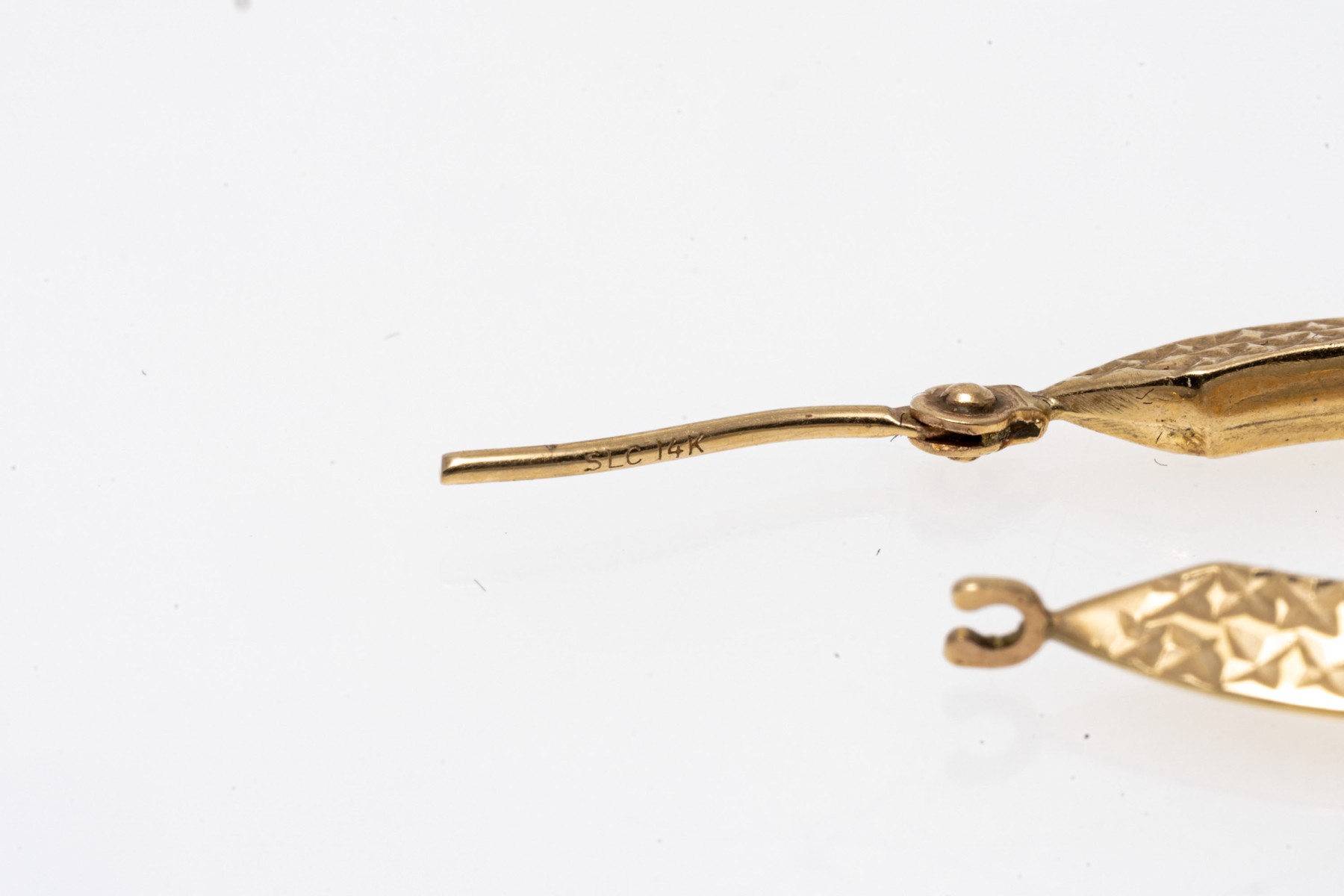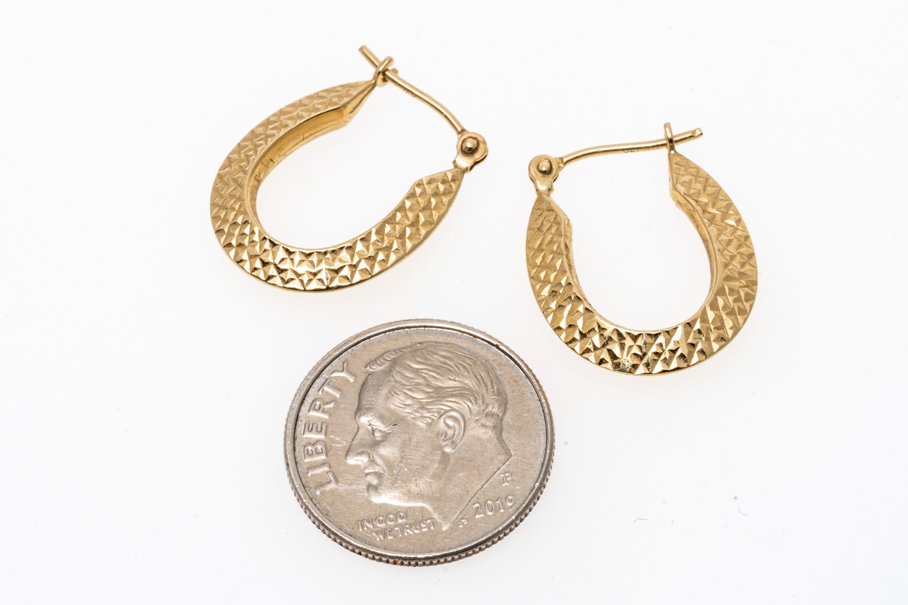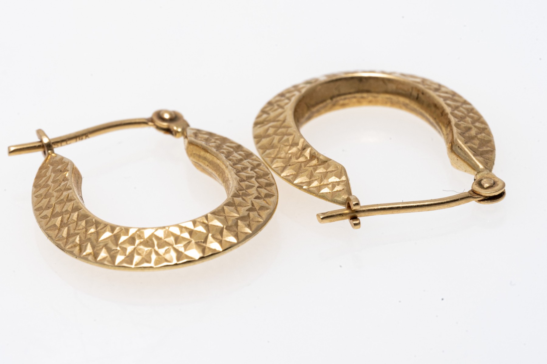 14K yellow gold elongated hoop earrings. The earrings have a diamond cut that creates an eye-catching shimmer. Leaver post backing.