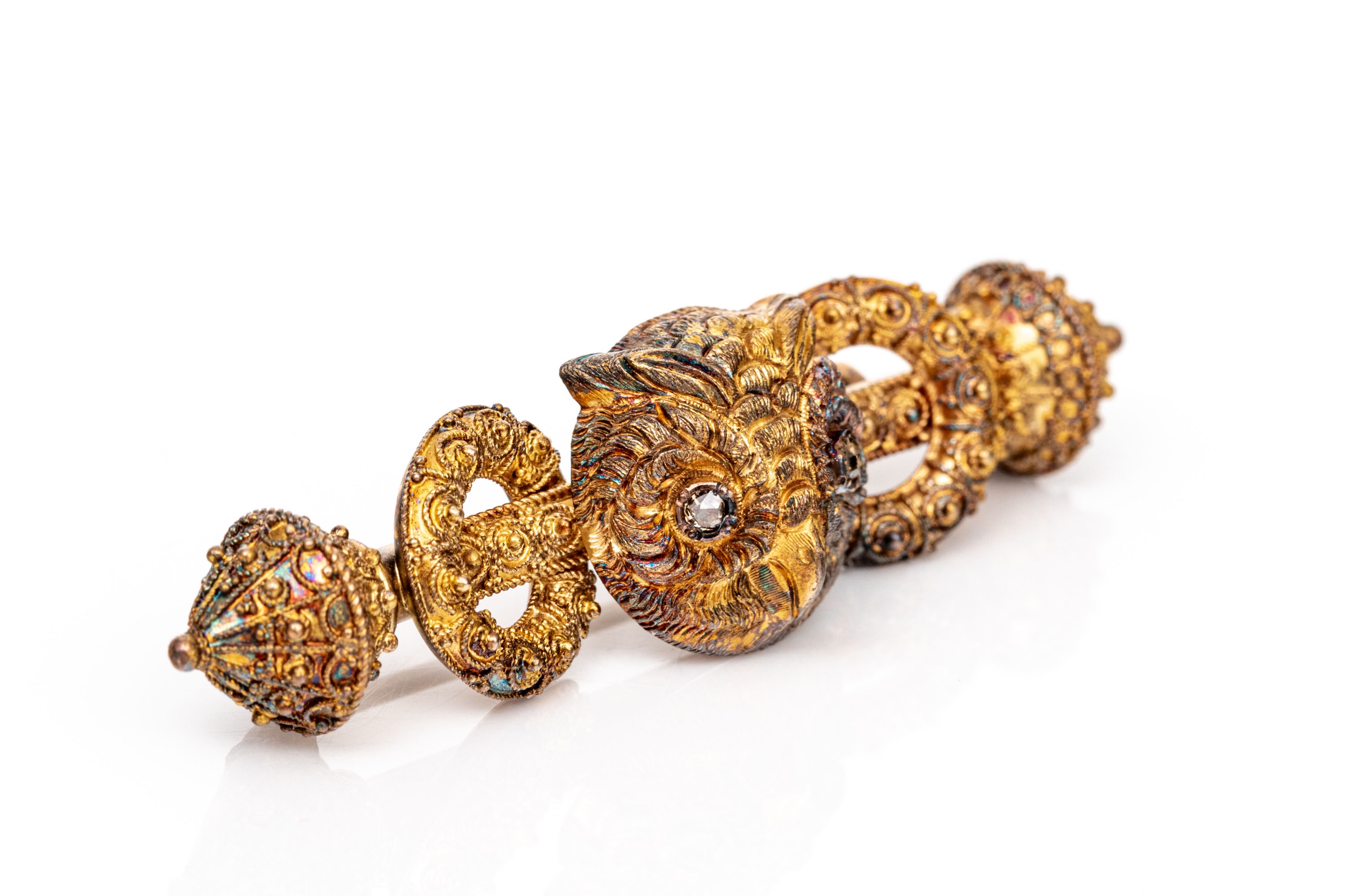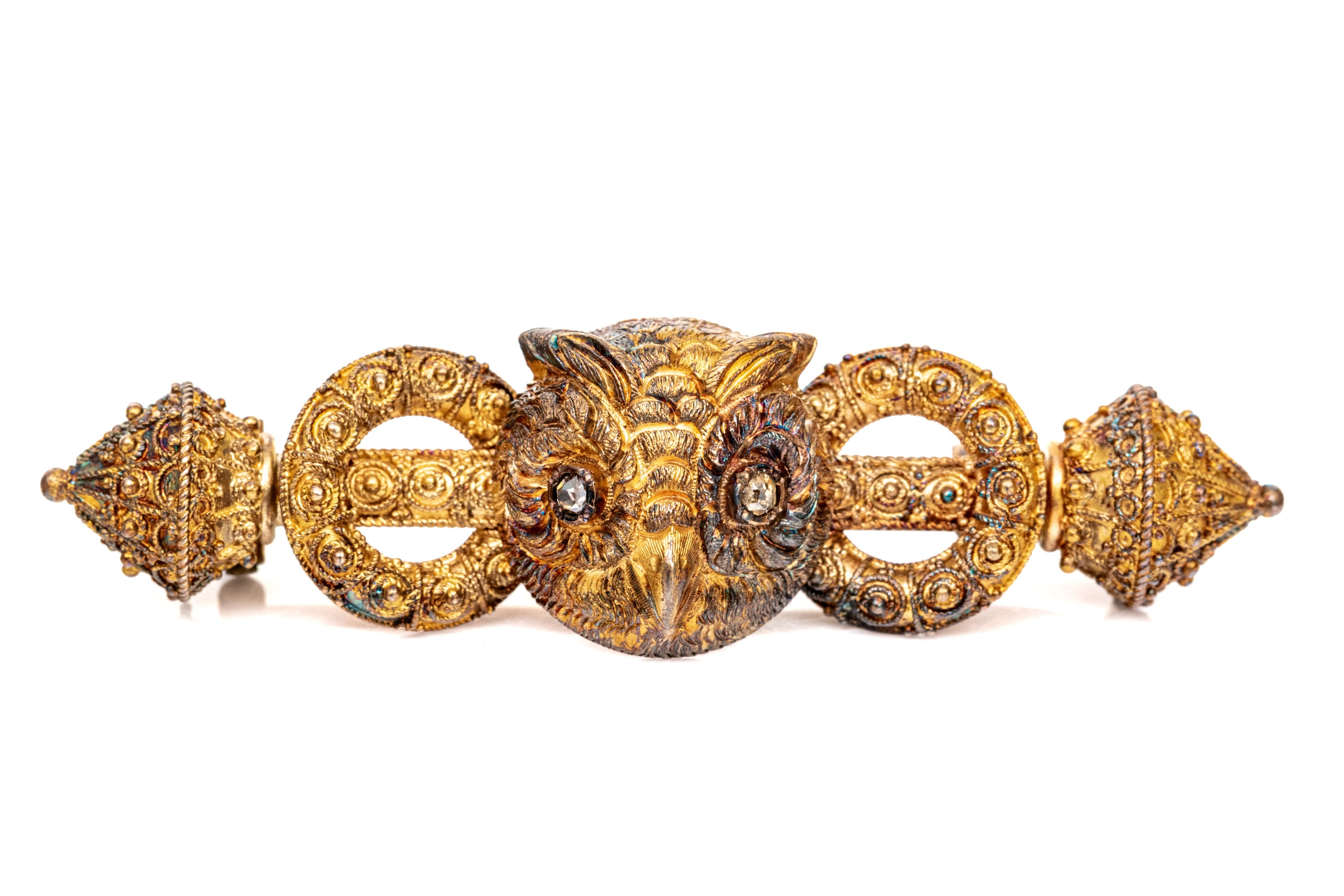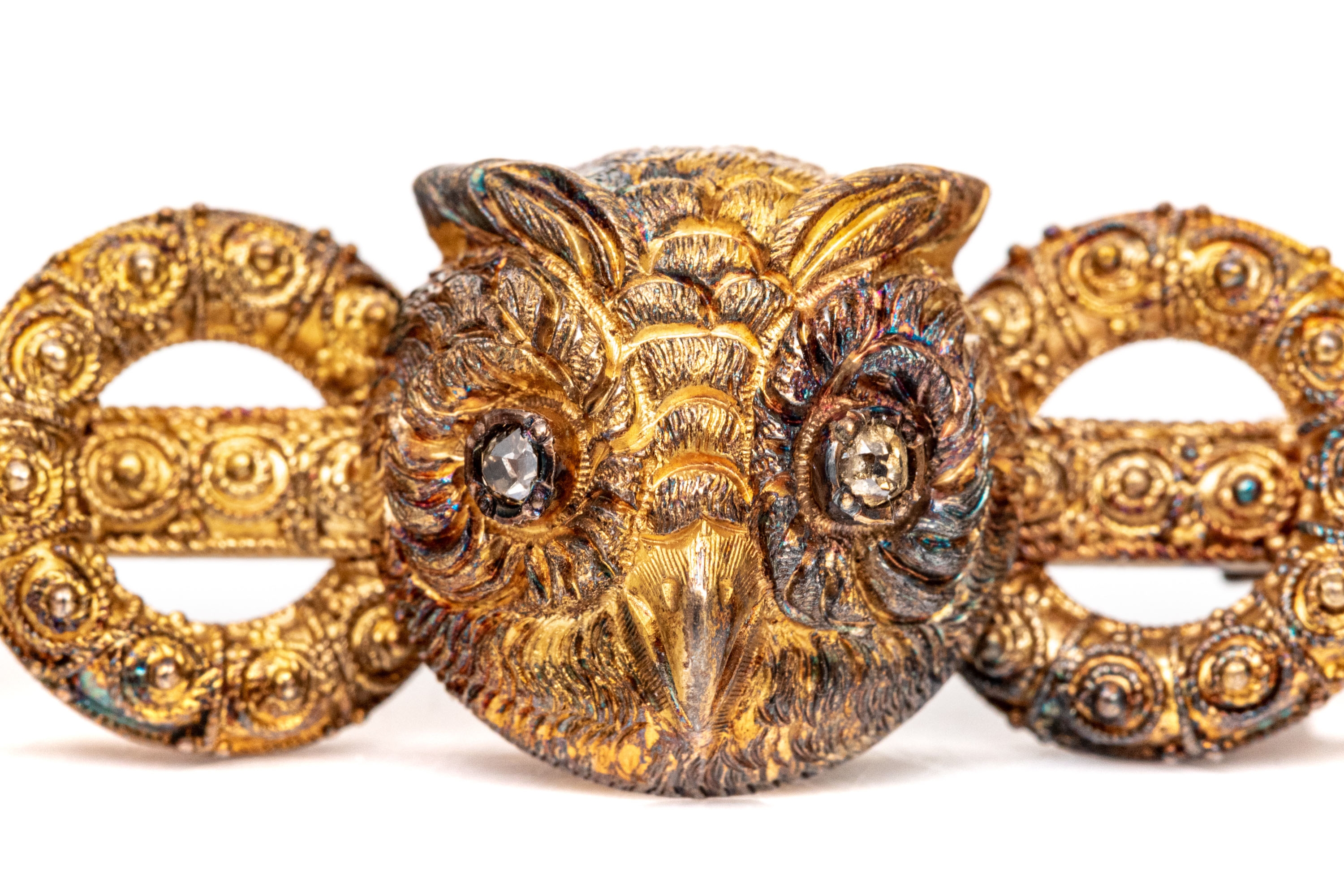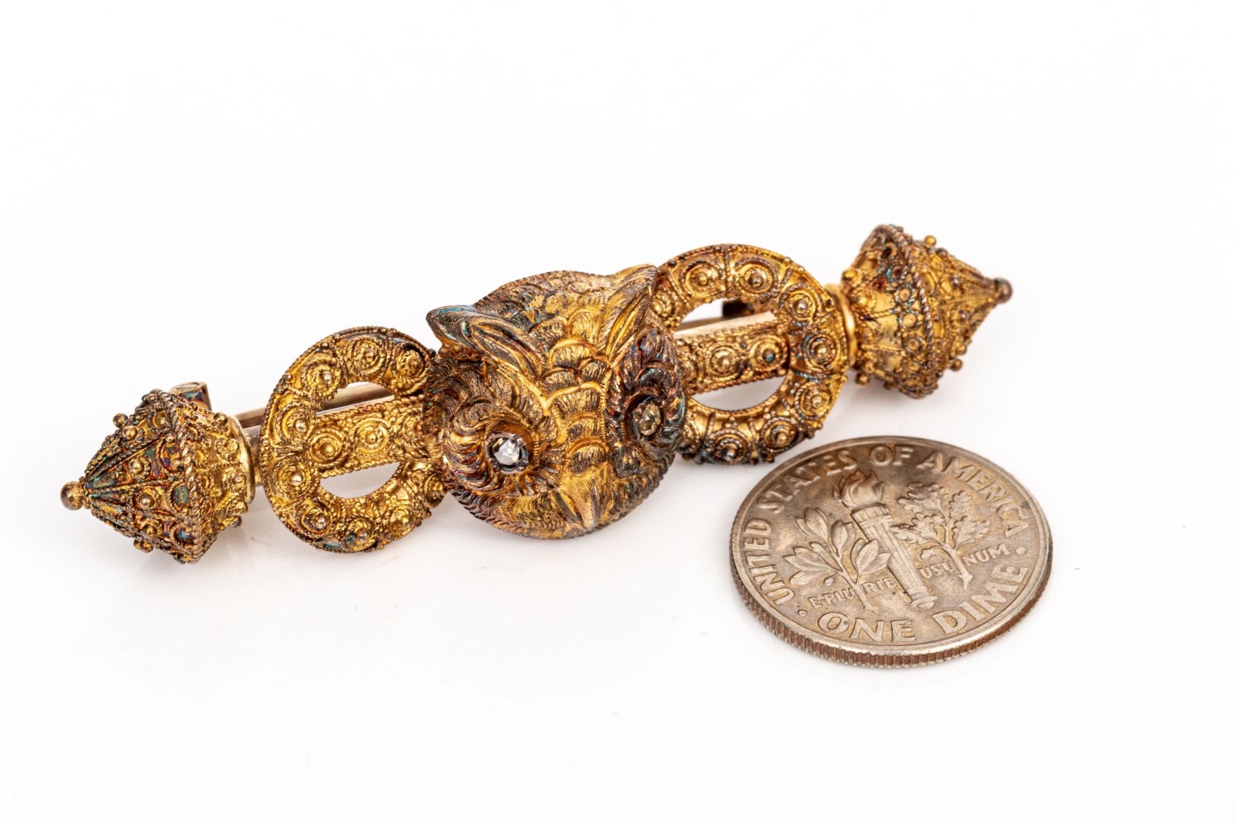 14k gold antique beautiful ornate owl motif brooch with rose cut diamond eyes. Ths fabulous brooch is a bar style, with heavily patterned cone ends, which lead into circles and finishing with an owl headed center.