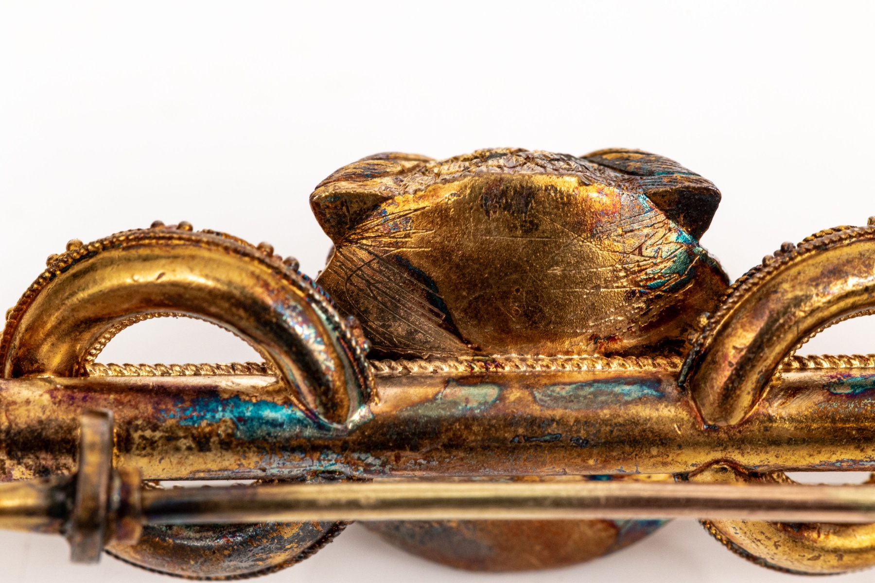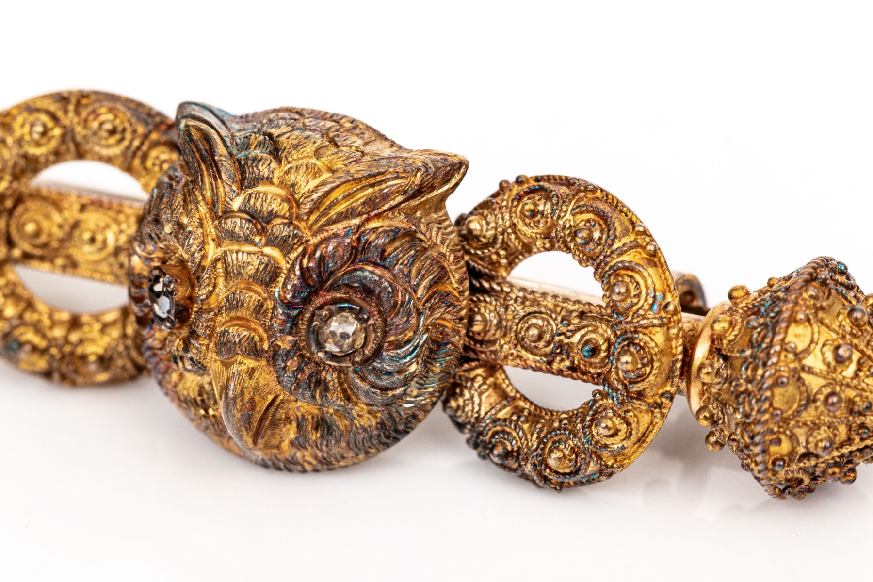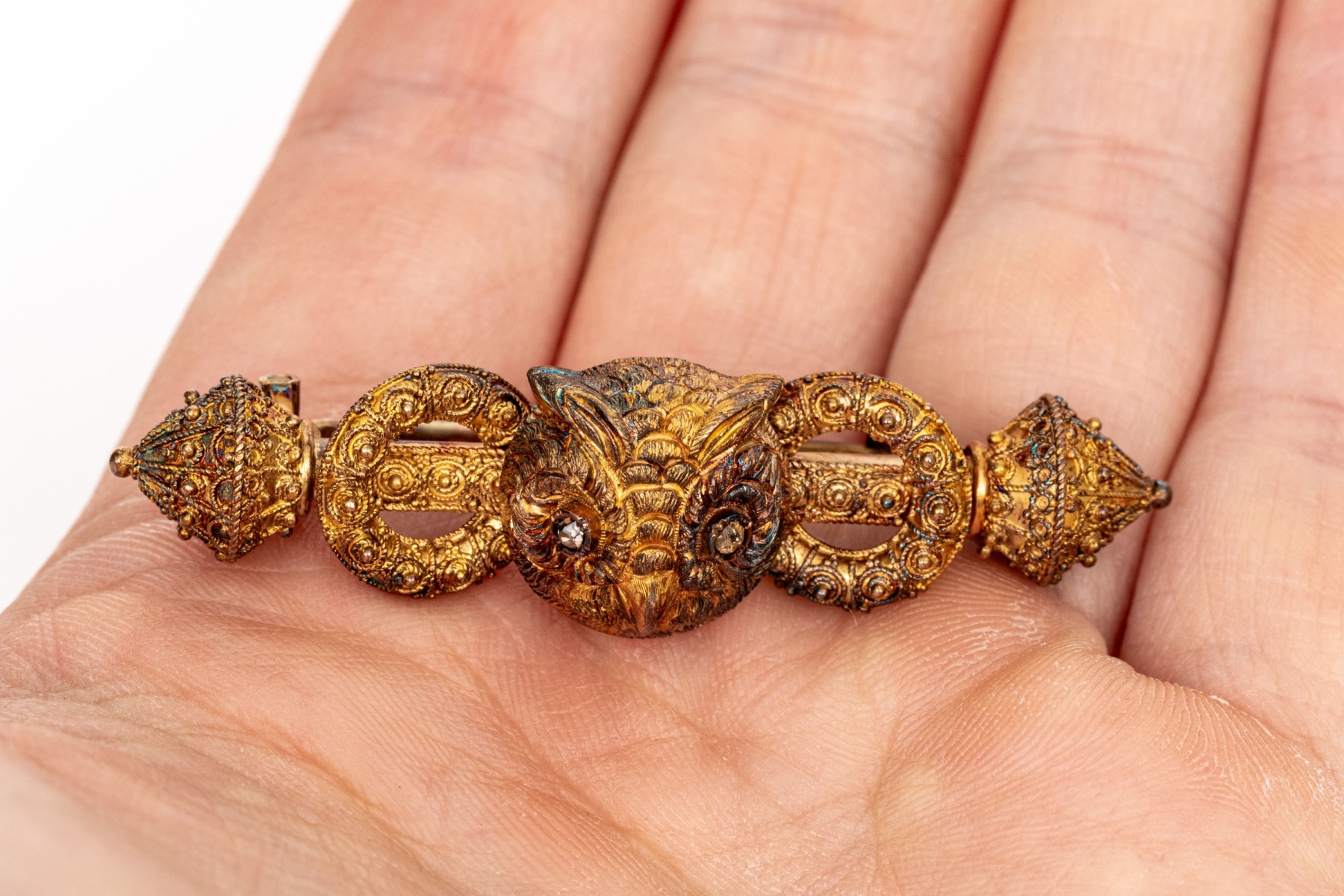 14k gold antique beautiful ornate owl motif brooch with rose cut diamond eyes. Ths fabulous brooch is a bar style, with heavily patterned cone ends, which lead into circles and finishing with an owl headed center.