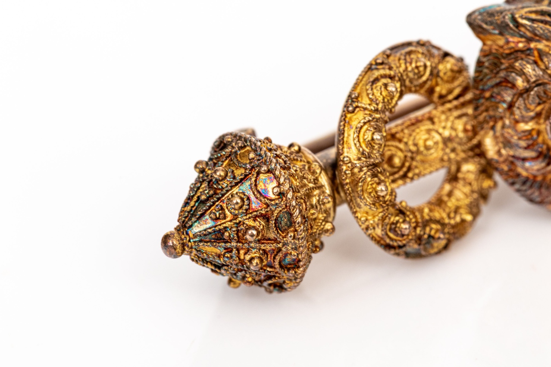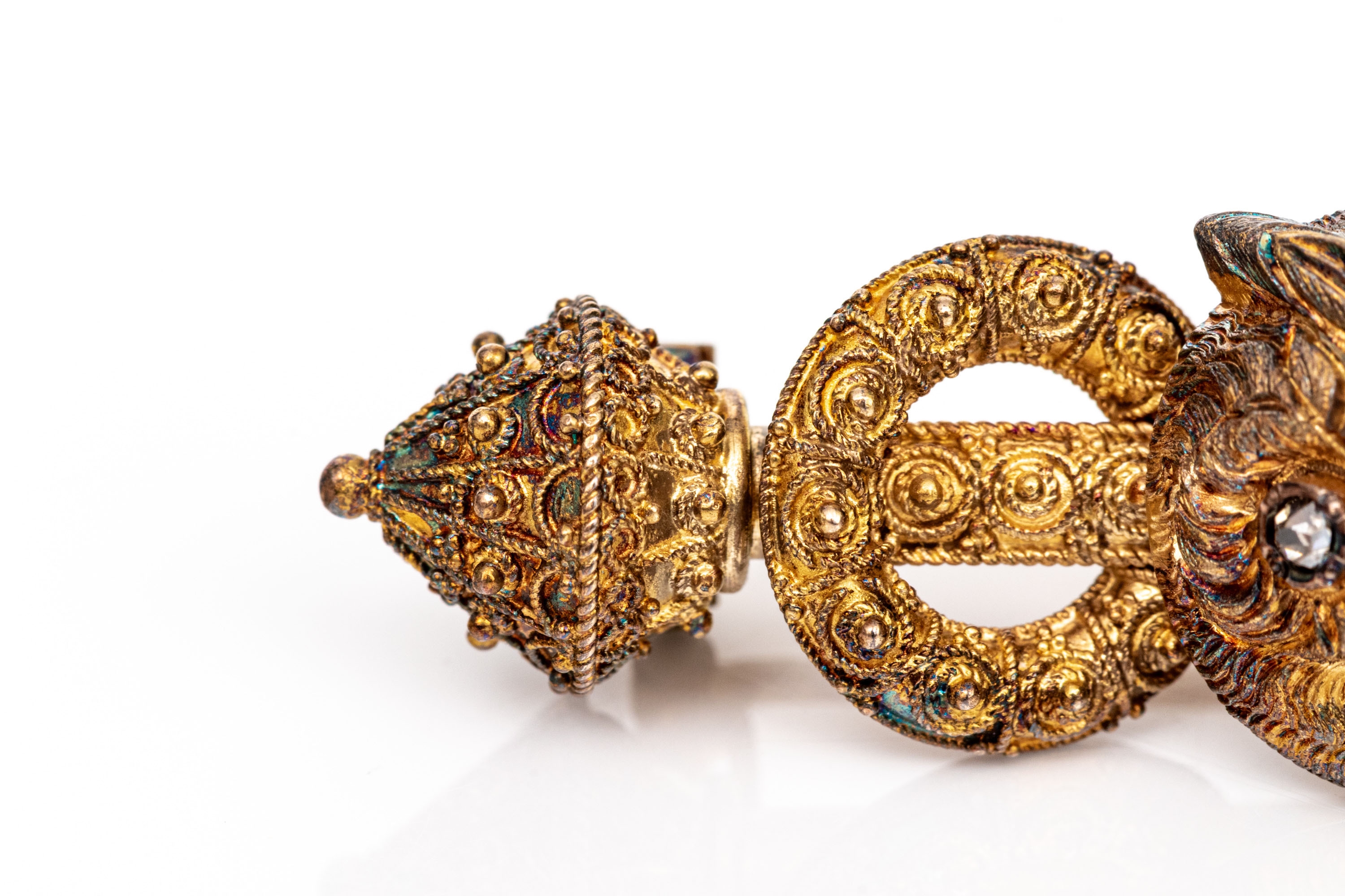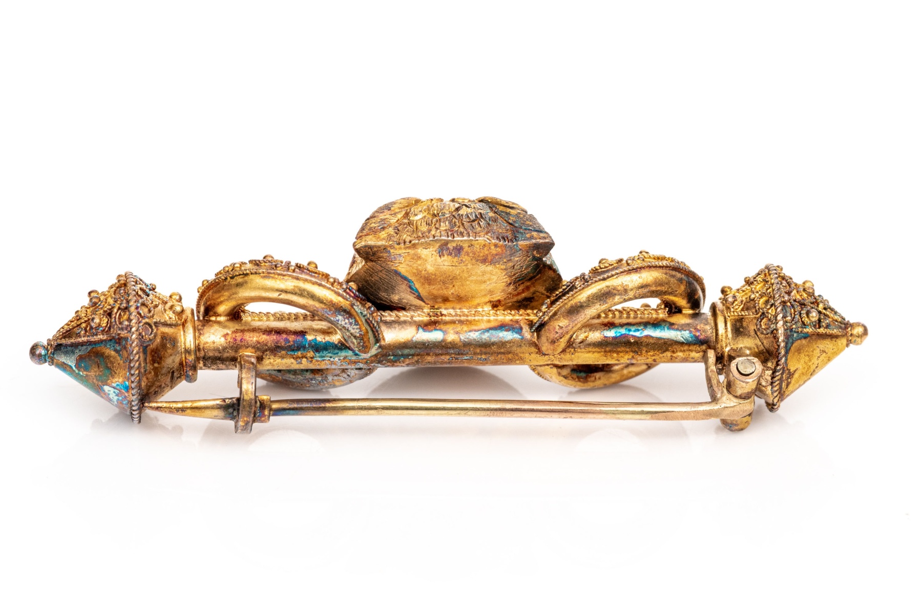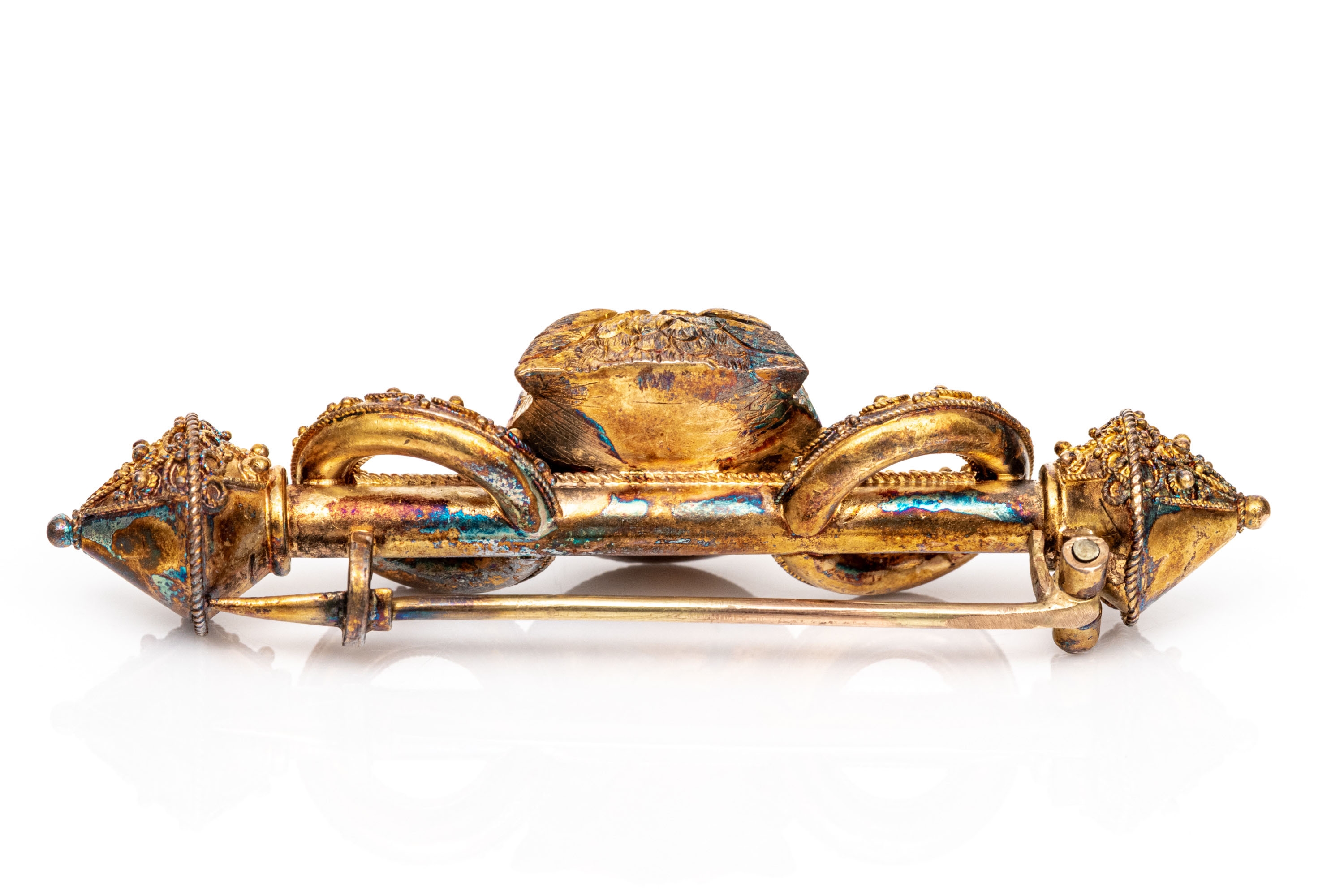 14k gold antique beautiful ornate owl motif brooch with rose cut diamond eyes. Ths fabulous brooch is a bar style, with heavily patterned cone ends, which lead into circles and finishing with an owl headed center.