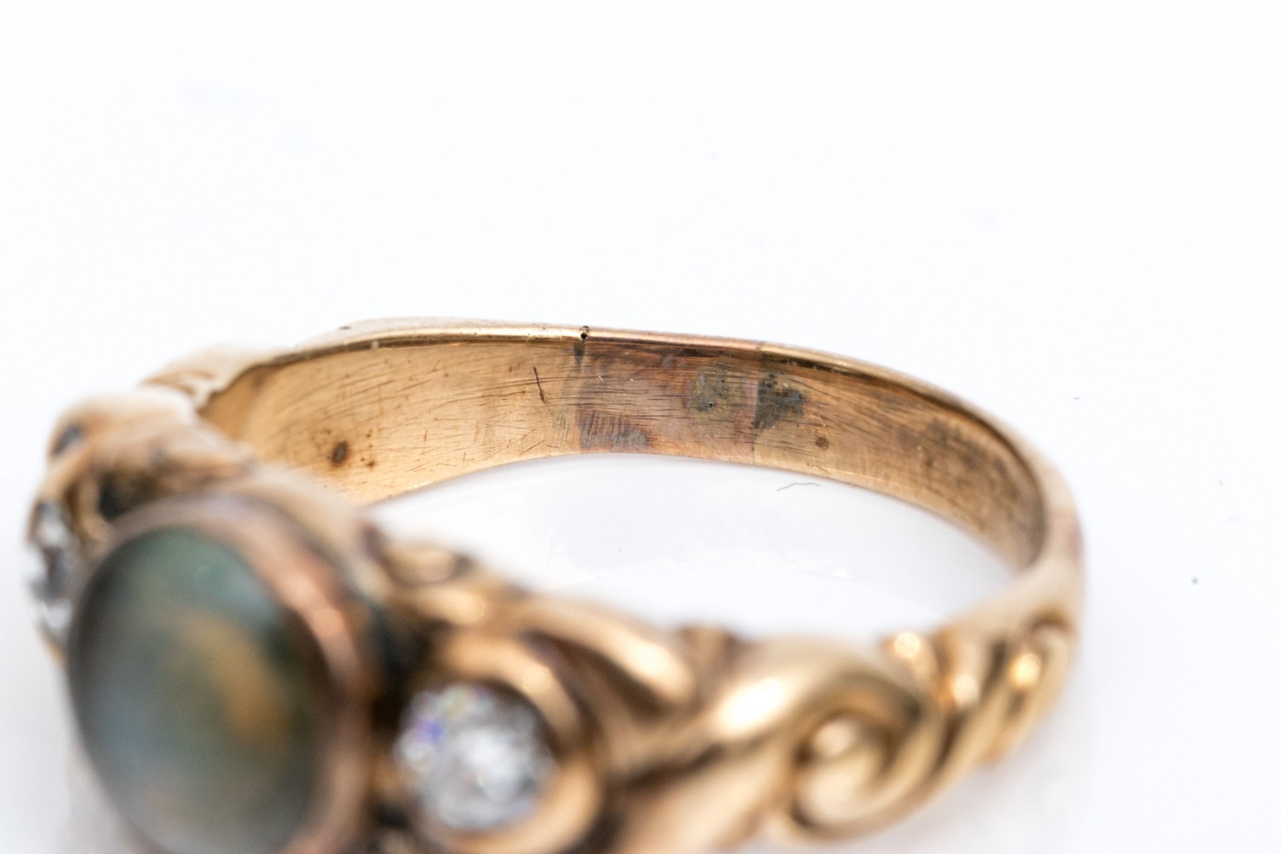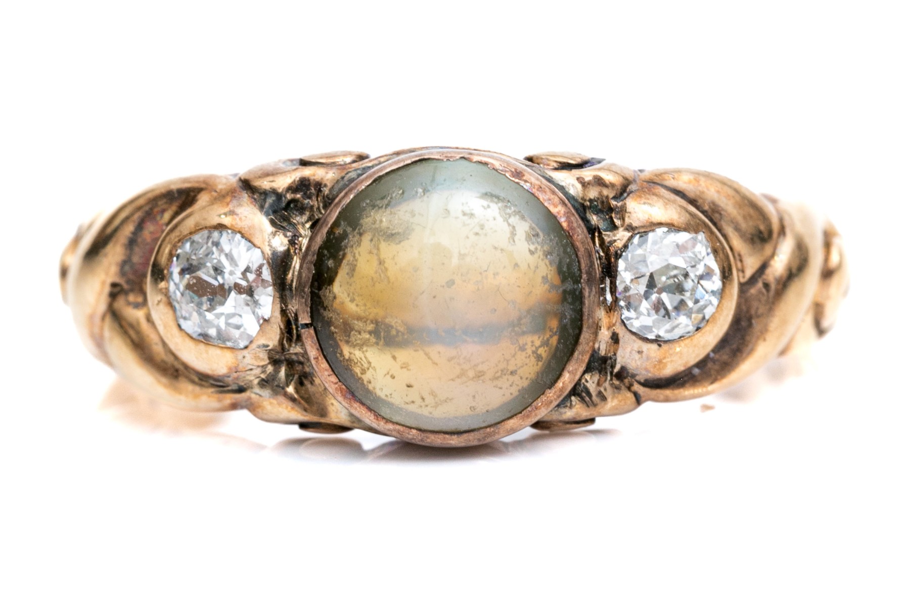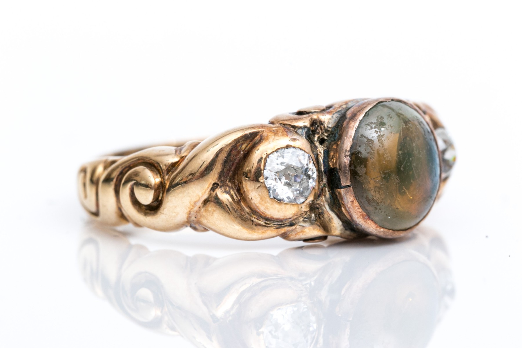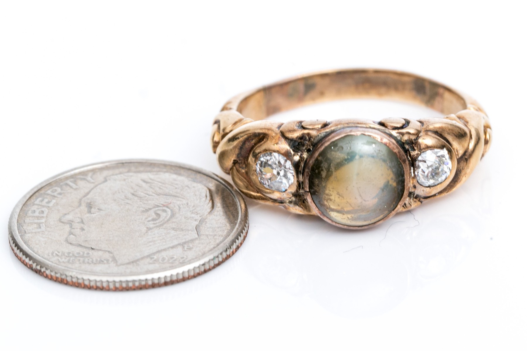 14K gold beautiful antique cats eye chrysoberyl and diamond ring, app. 0.17 TCW, size 6.5, bezel set