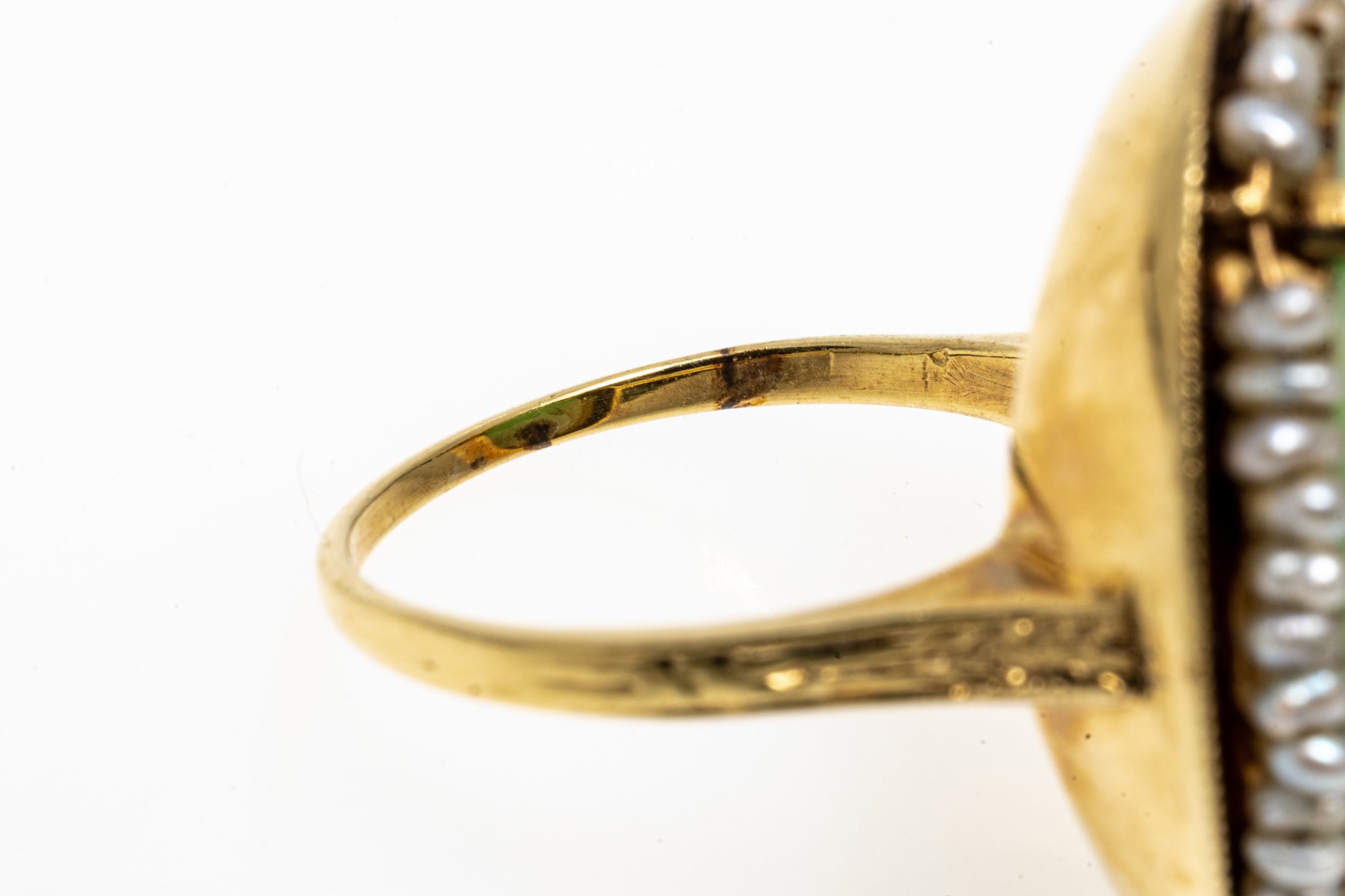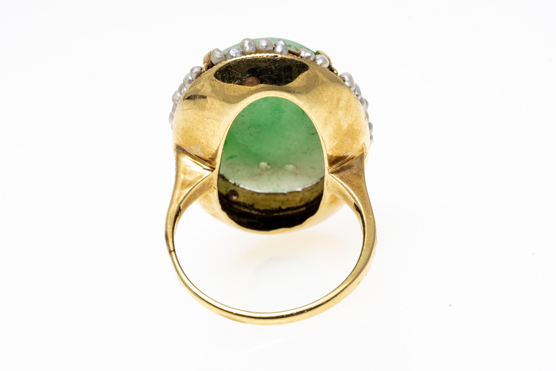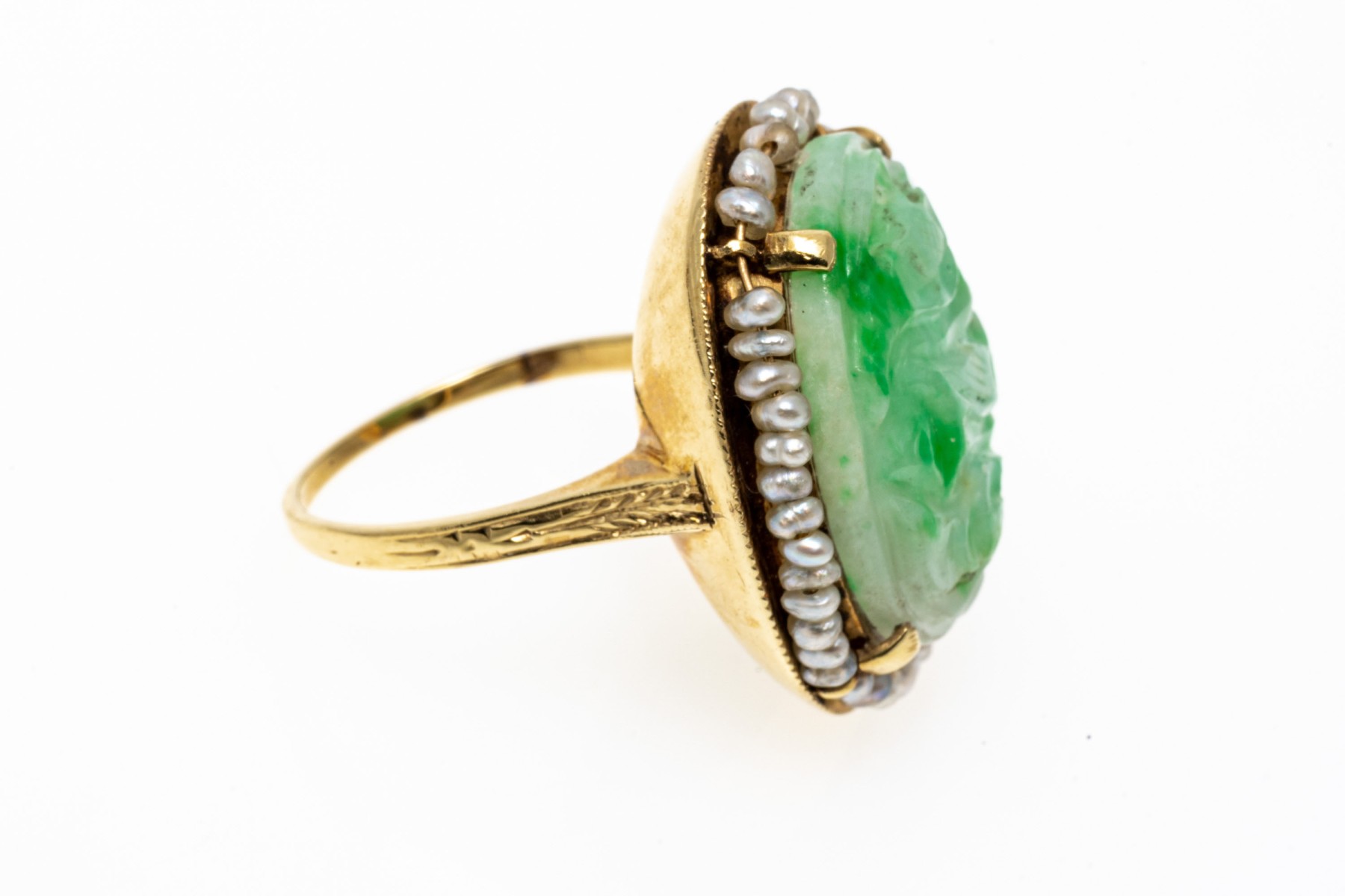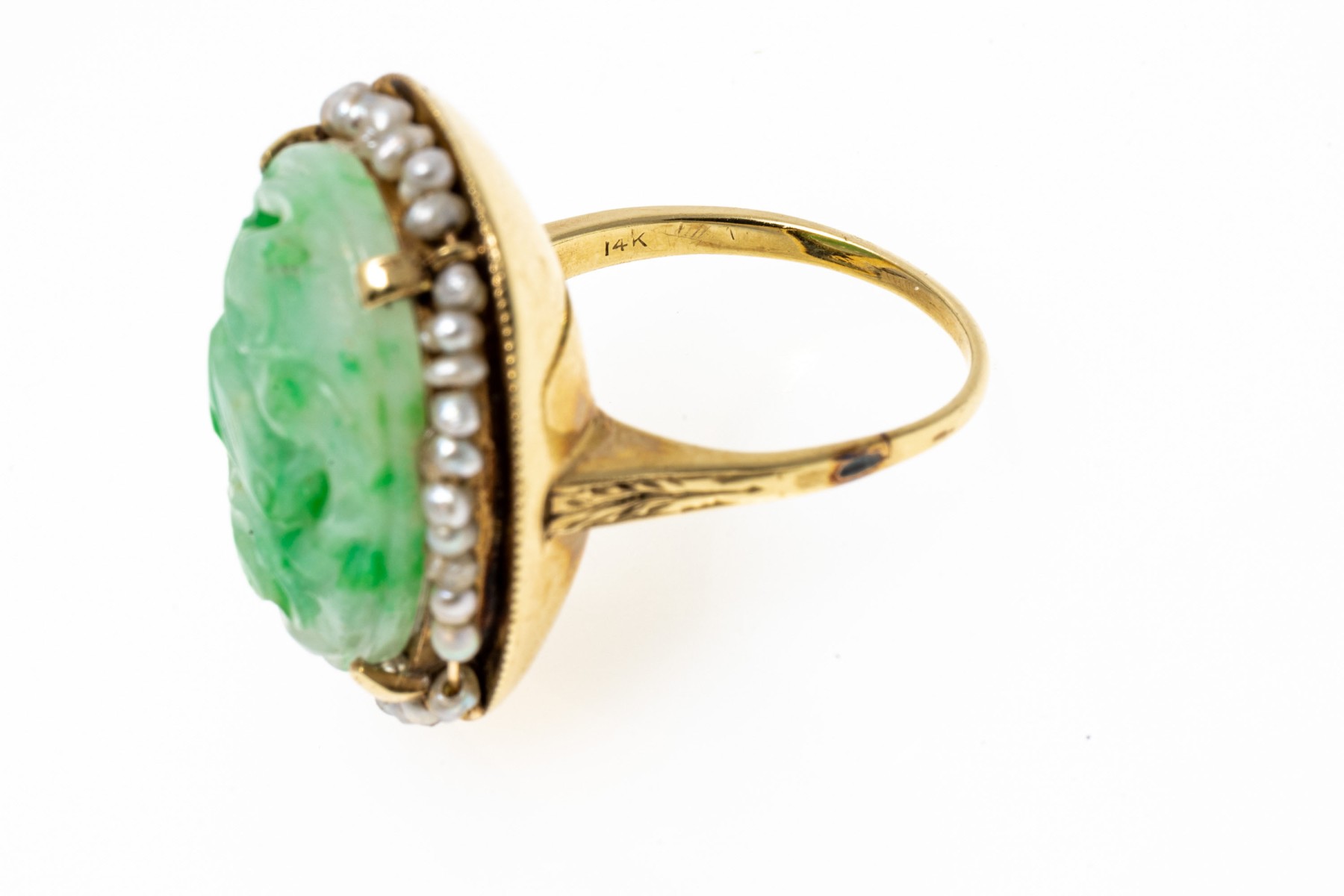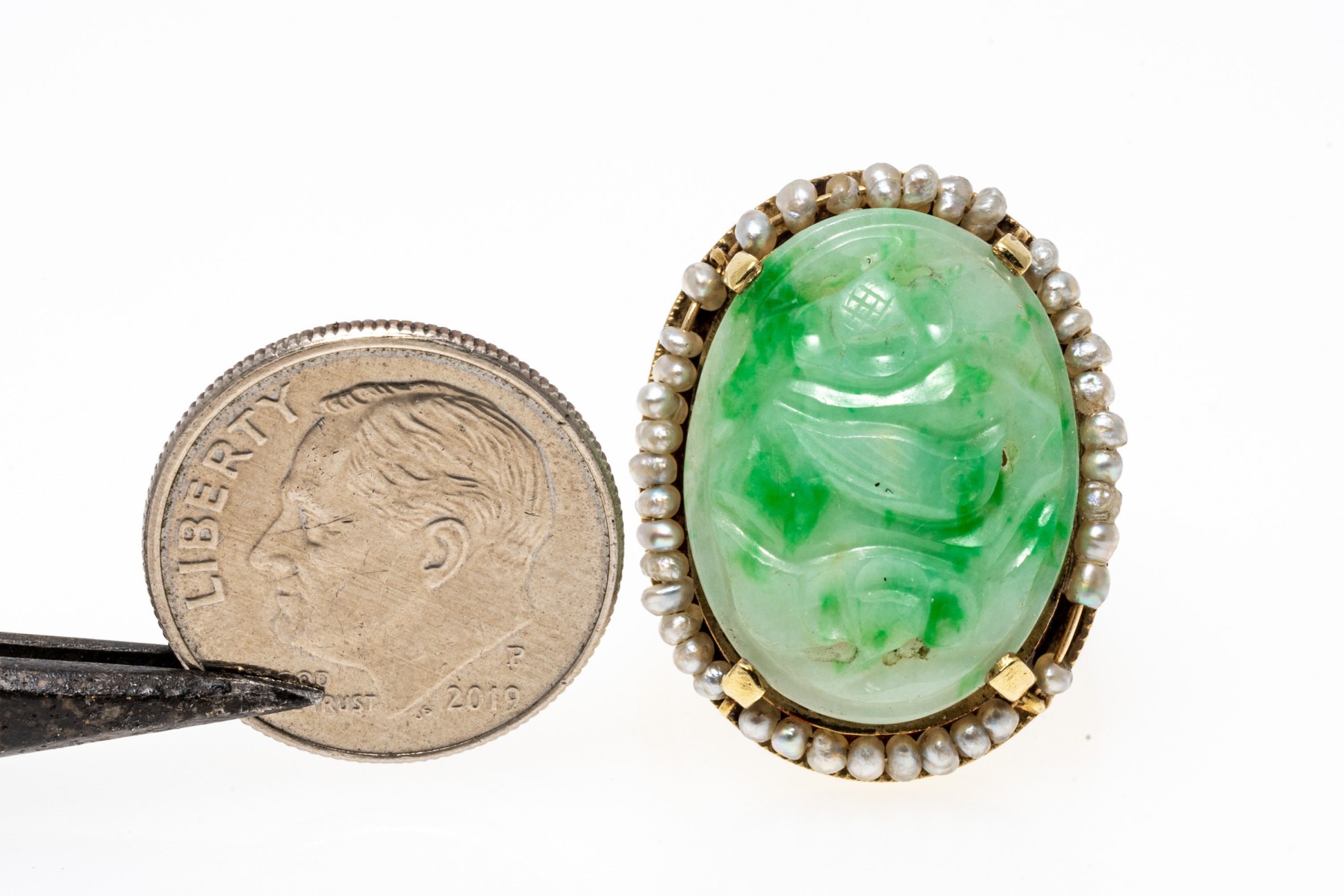 14k yellow gold beautiful vintage pierced green jadeite jade and seed pearl framed ring, size 6