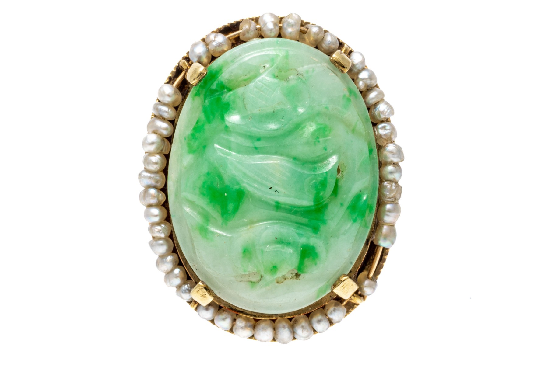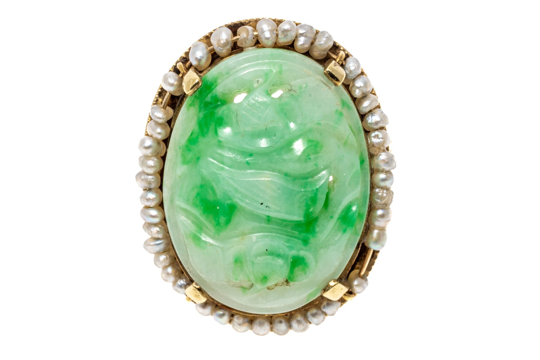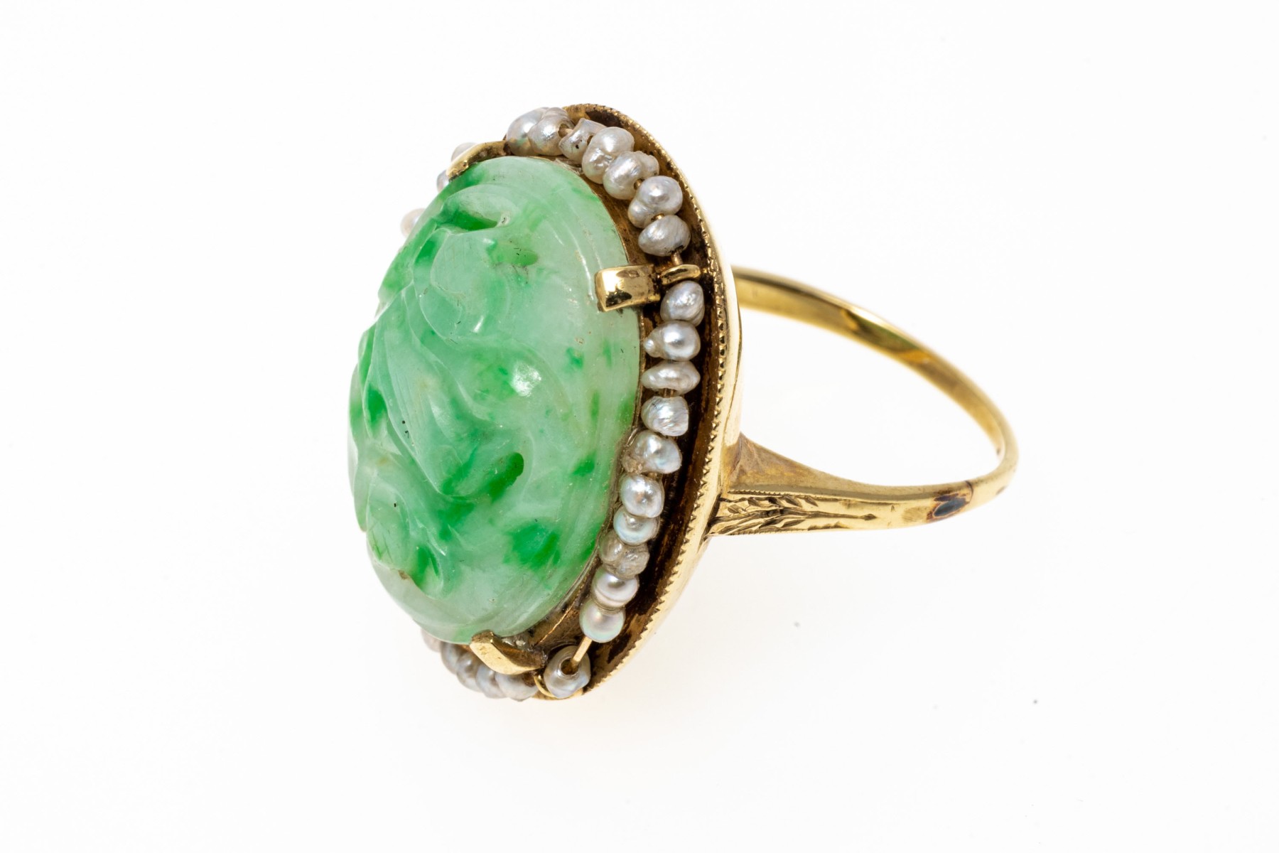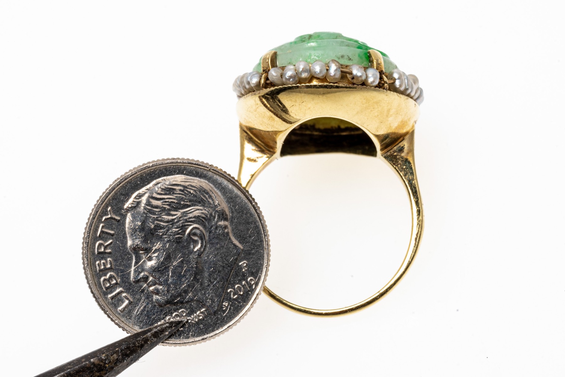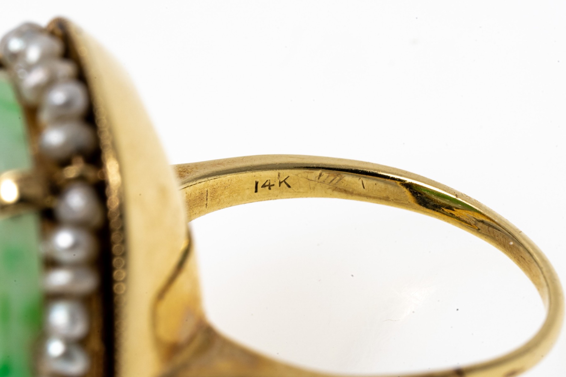 14k yellow gold beautiful vintage pierced green jadeite jade and seed pearl framed ring, size 6