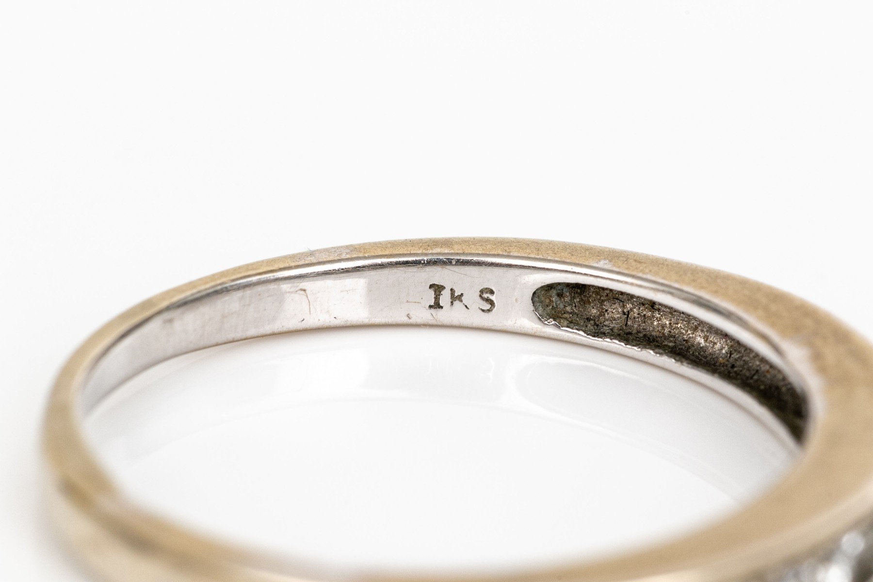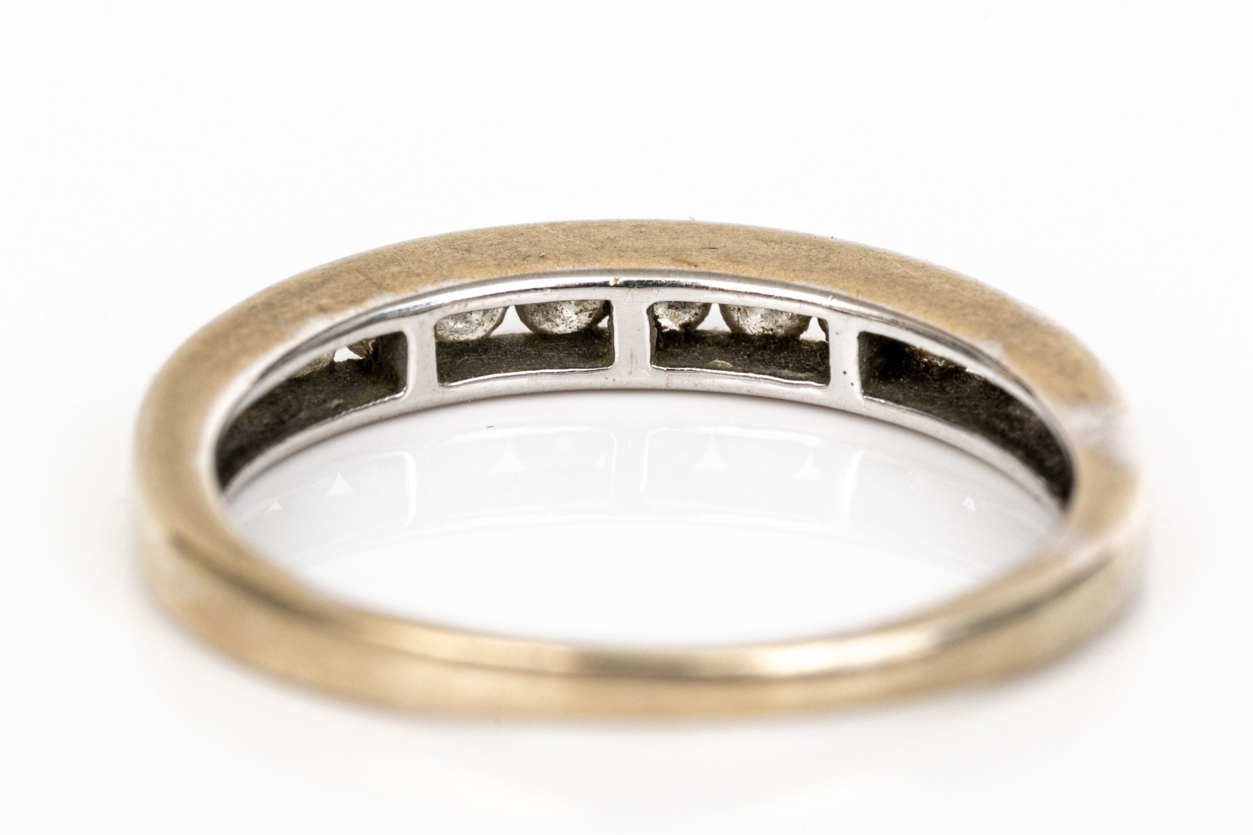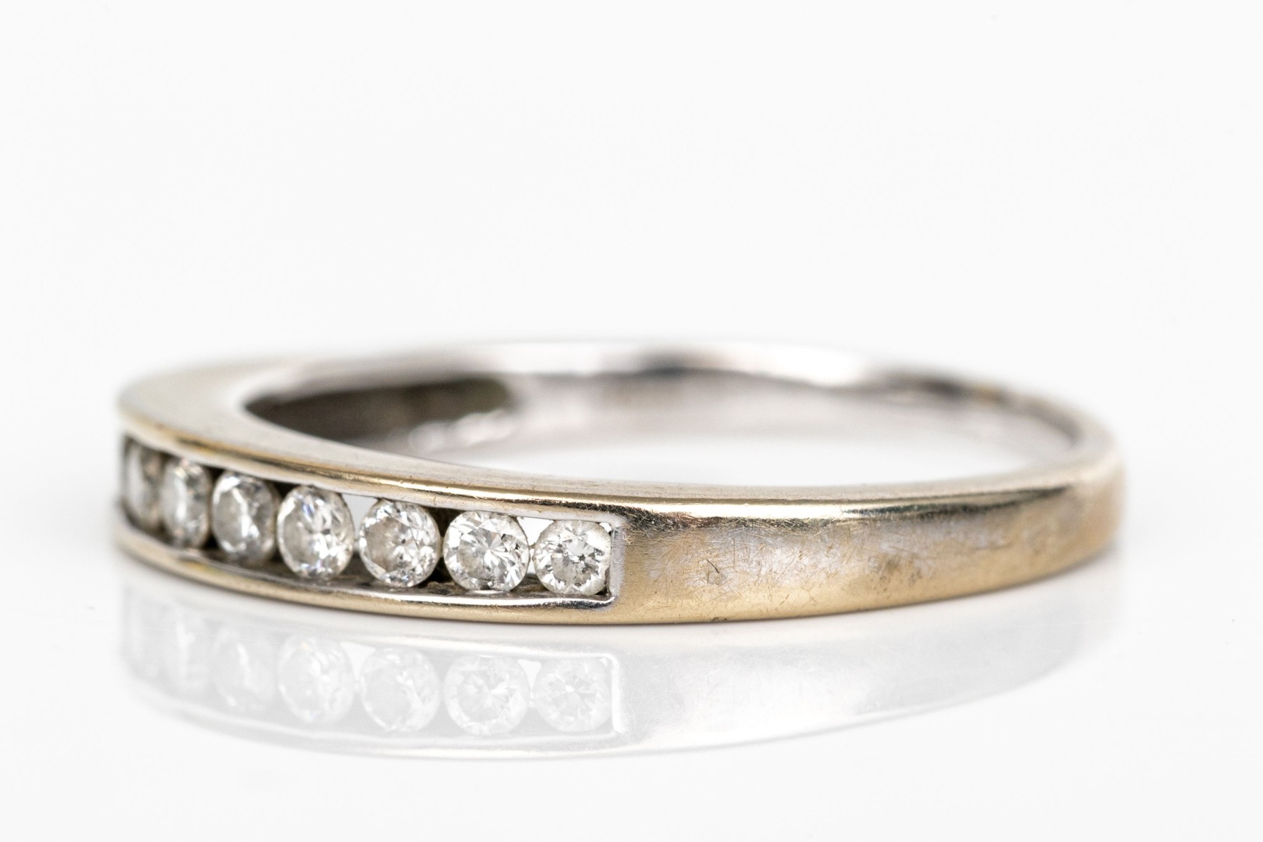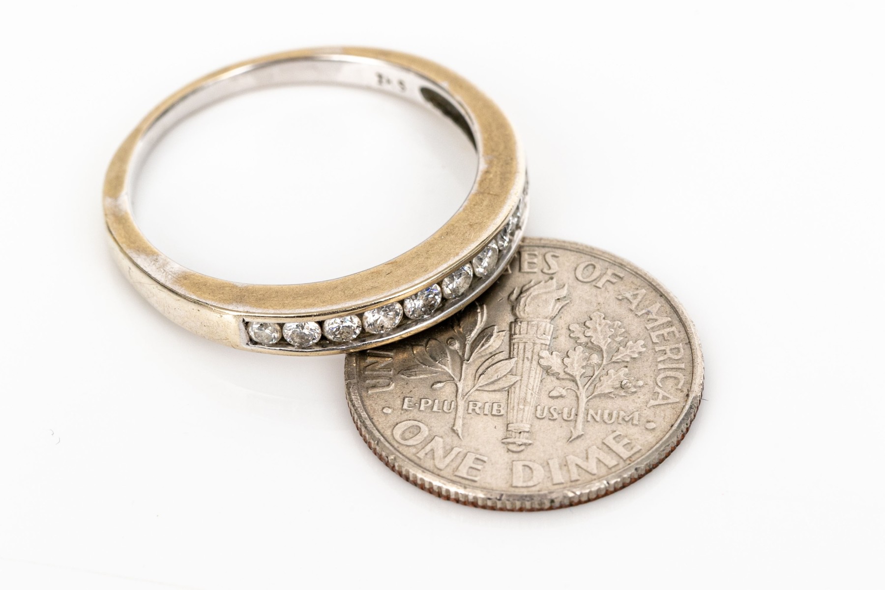 14k gold channel set round faceted diamond band ring, app. 0.24 TCW, size 7.5. The diamonds are SI2 to I1, J color