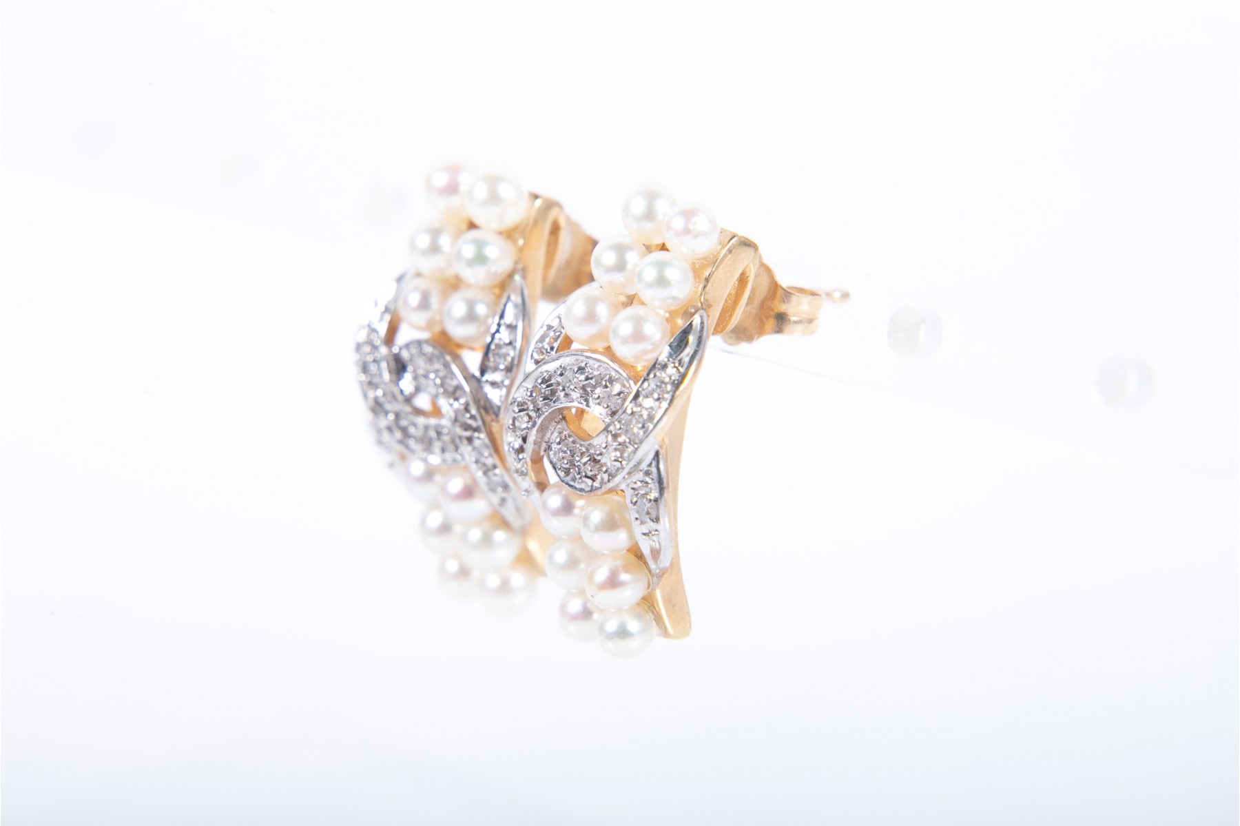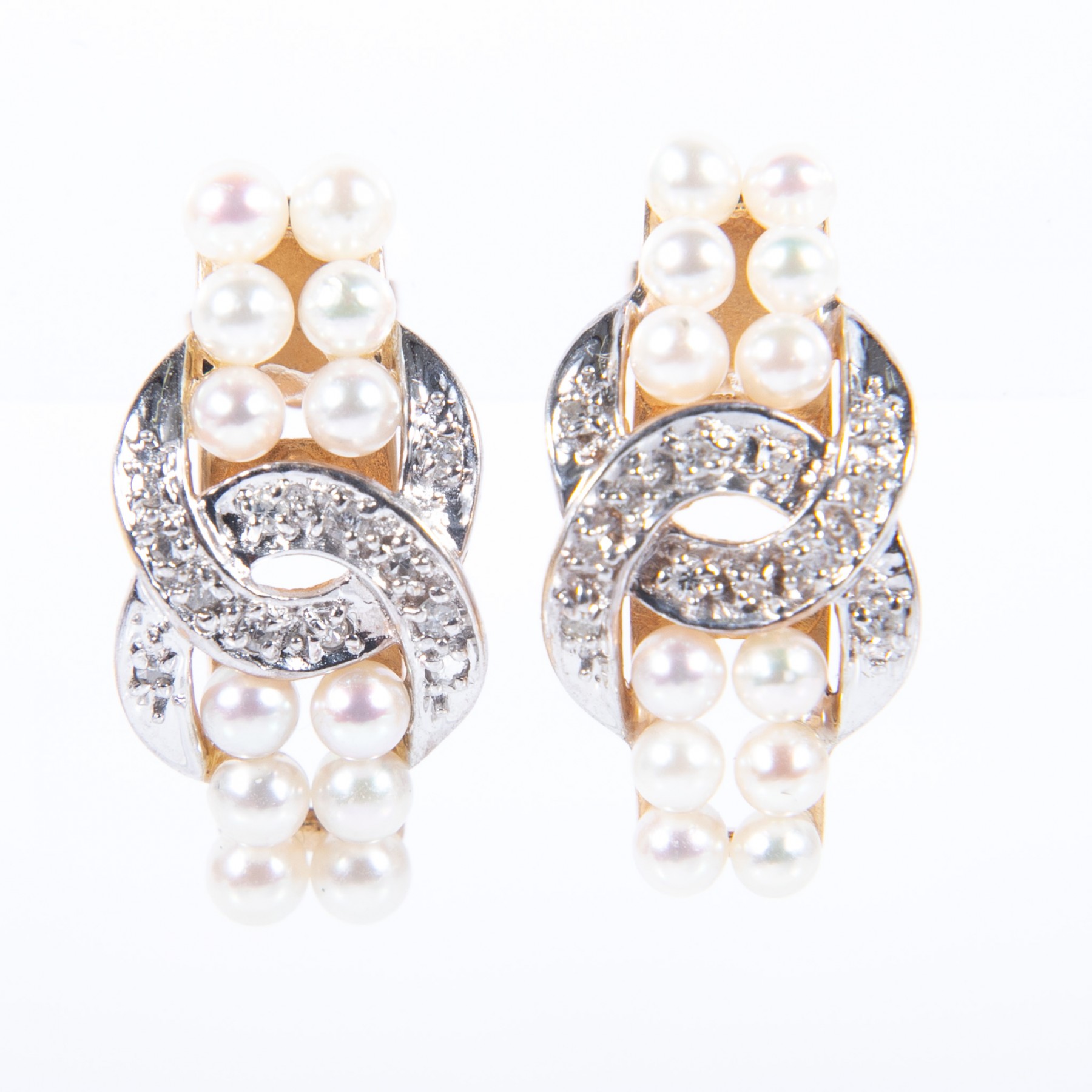 A gorgeous pair of gently curved rectangular studs sporting two vertical rows of white cultured pearls interrupted at the center with intertwining circle motifs in white gold with round diamonds.