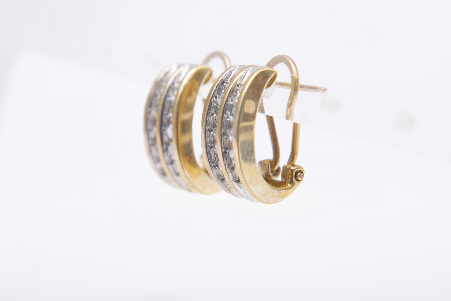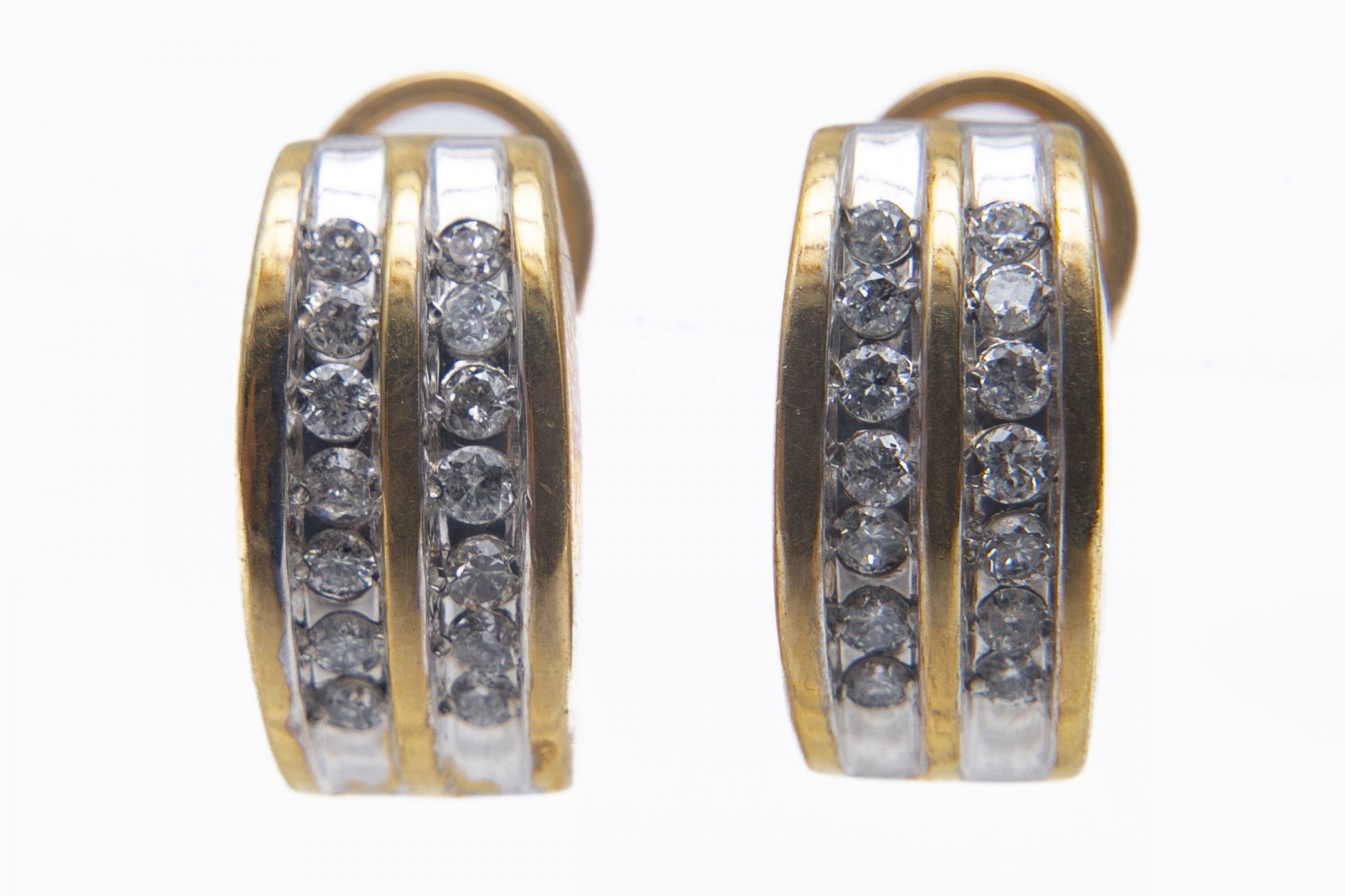 A wonderful pair of huggie J-curve earrings displaying smooth yellow gold borders around recessed white gold channels of diamonds.