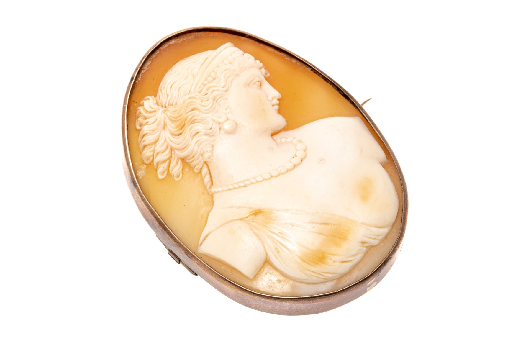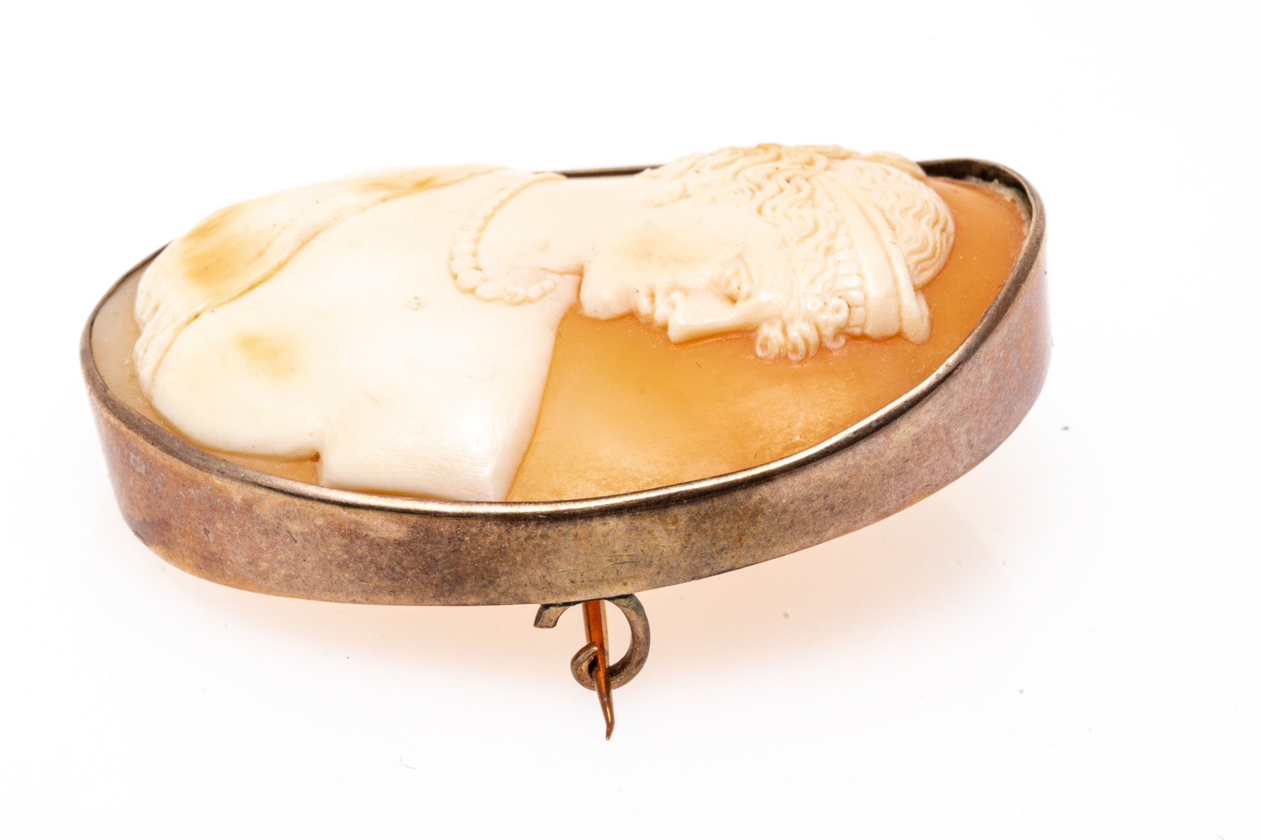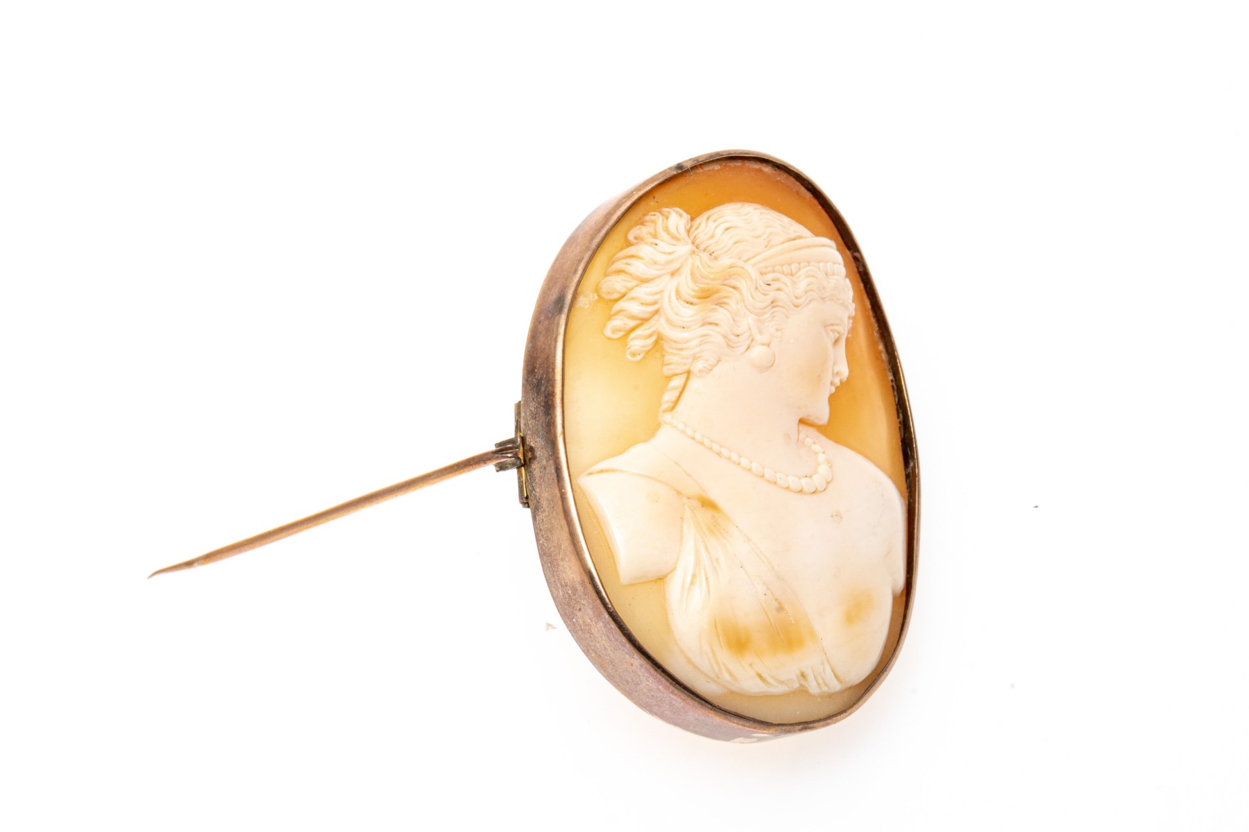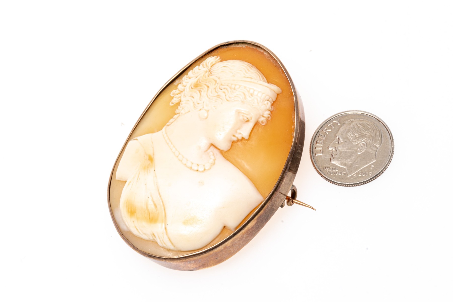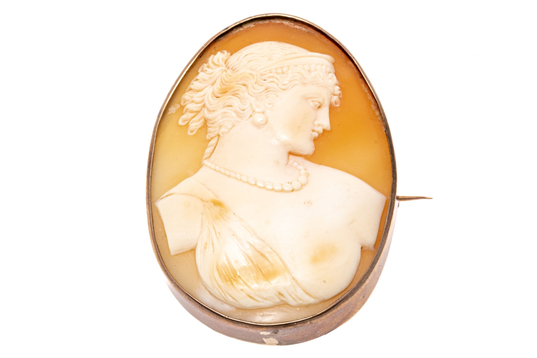 14k gold handsome antique cameo brooch, with a lovely right facing profile with a draped bust and finished with a simple frame