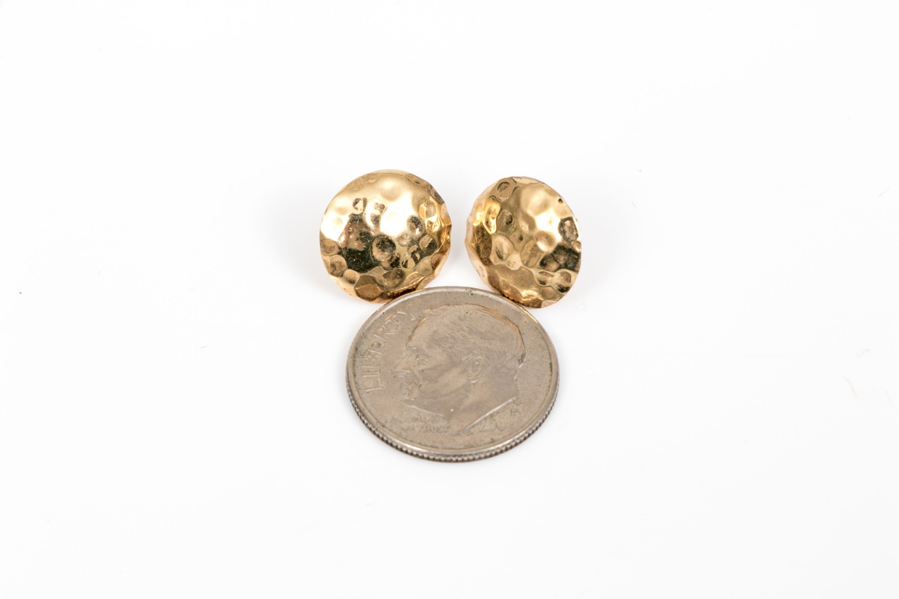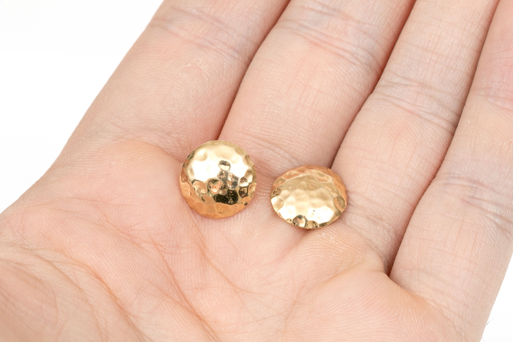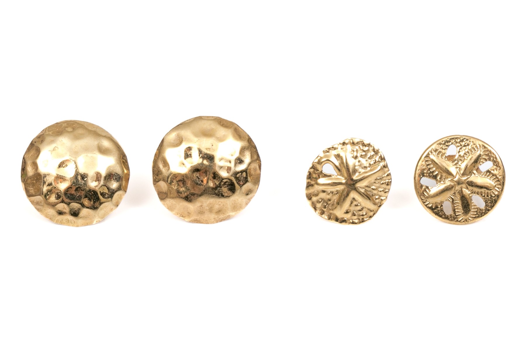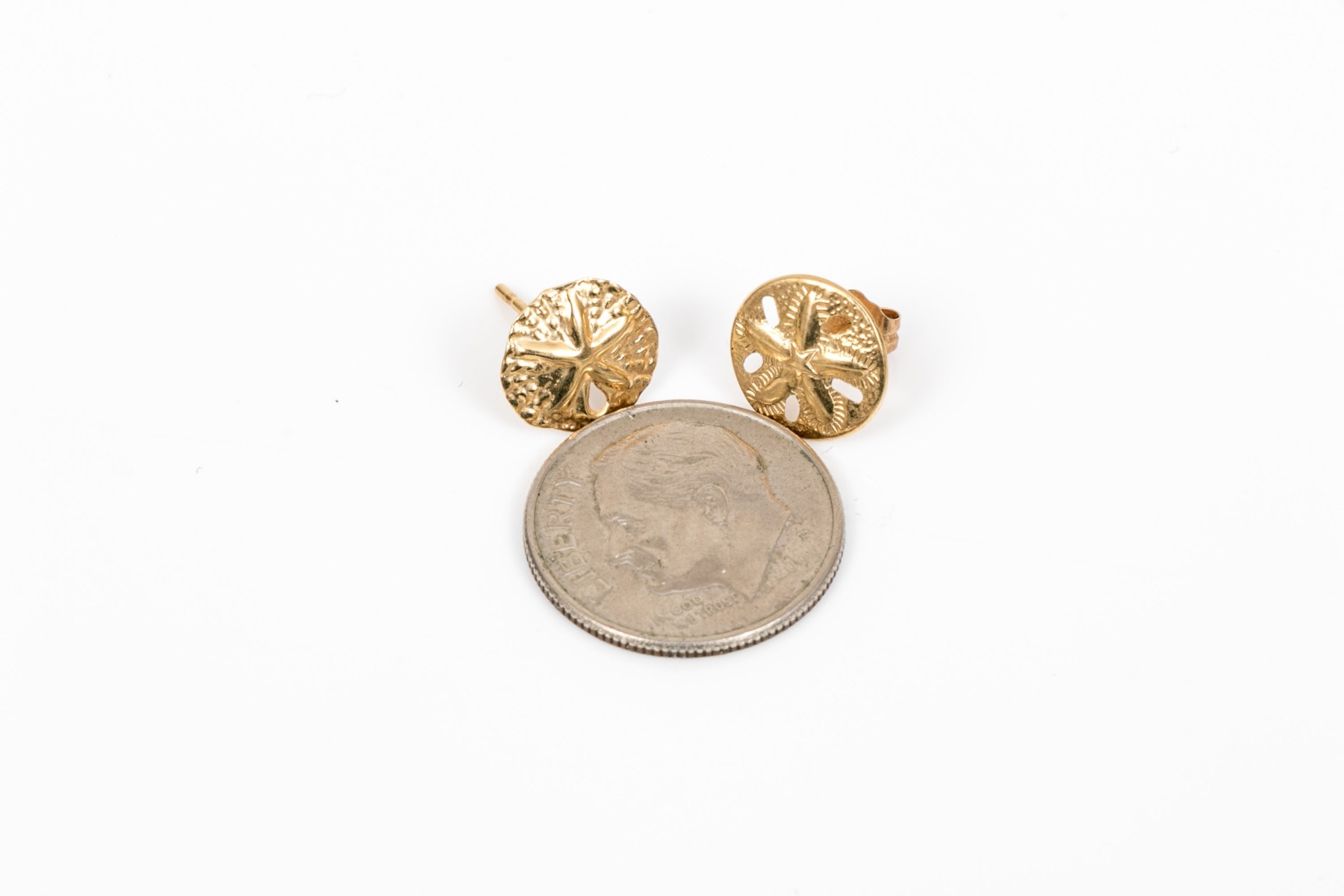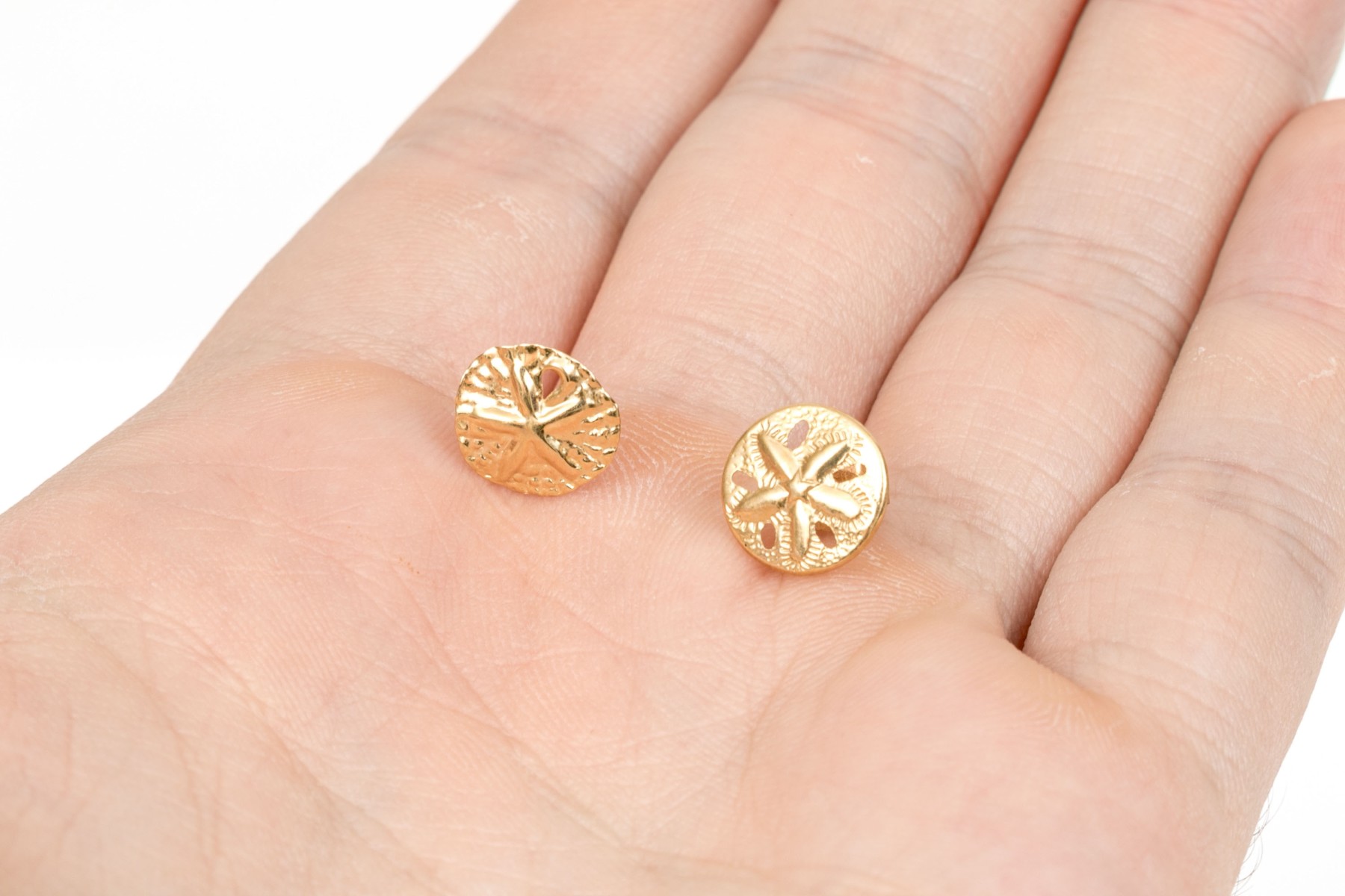 14k gold pair of two round motif stud earrings, hammered and sand dollar motifs; finished with posts and clutches