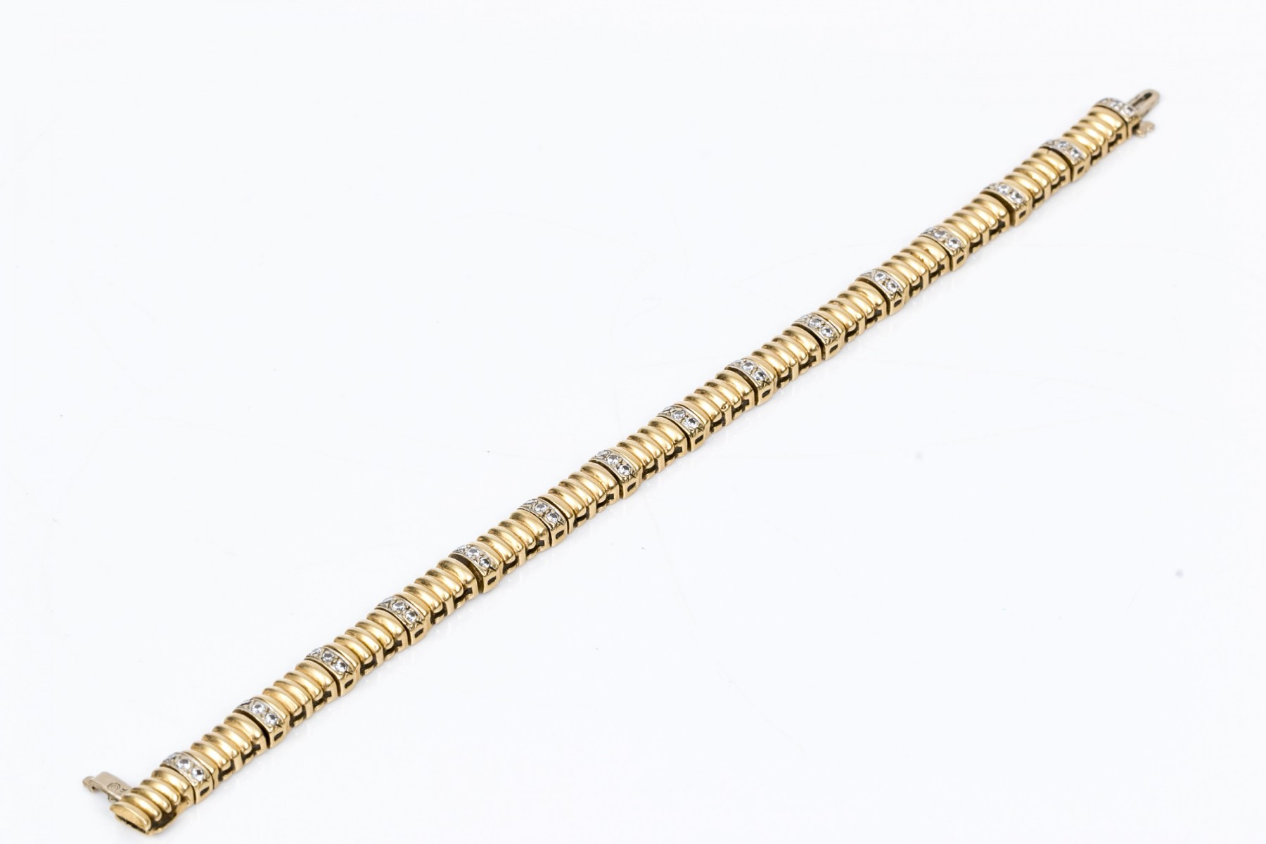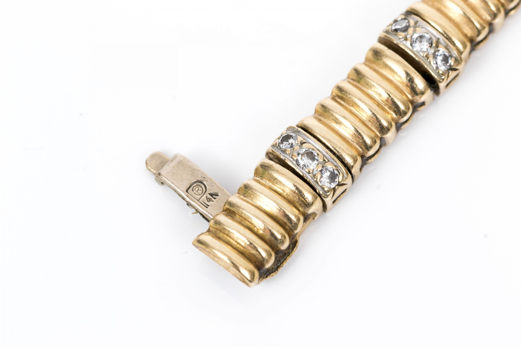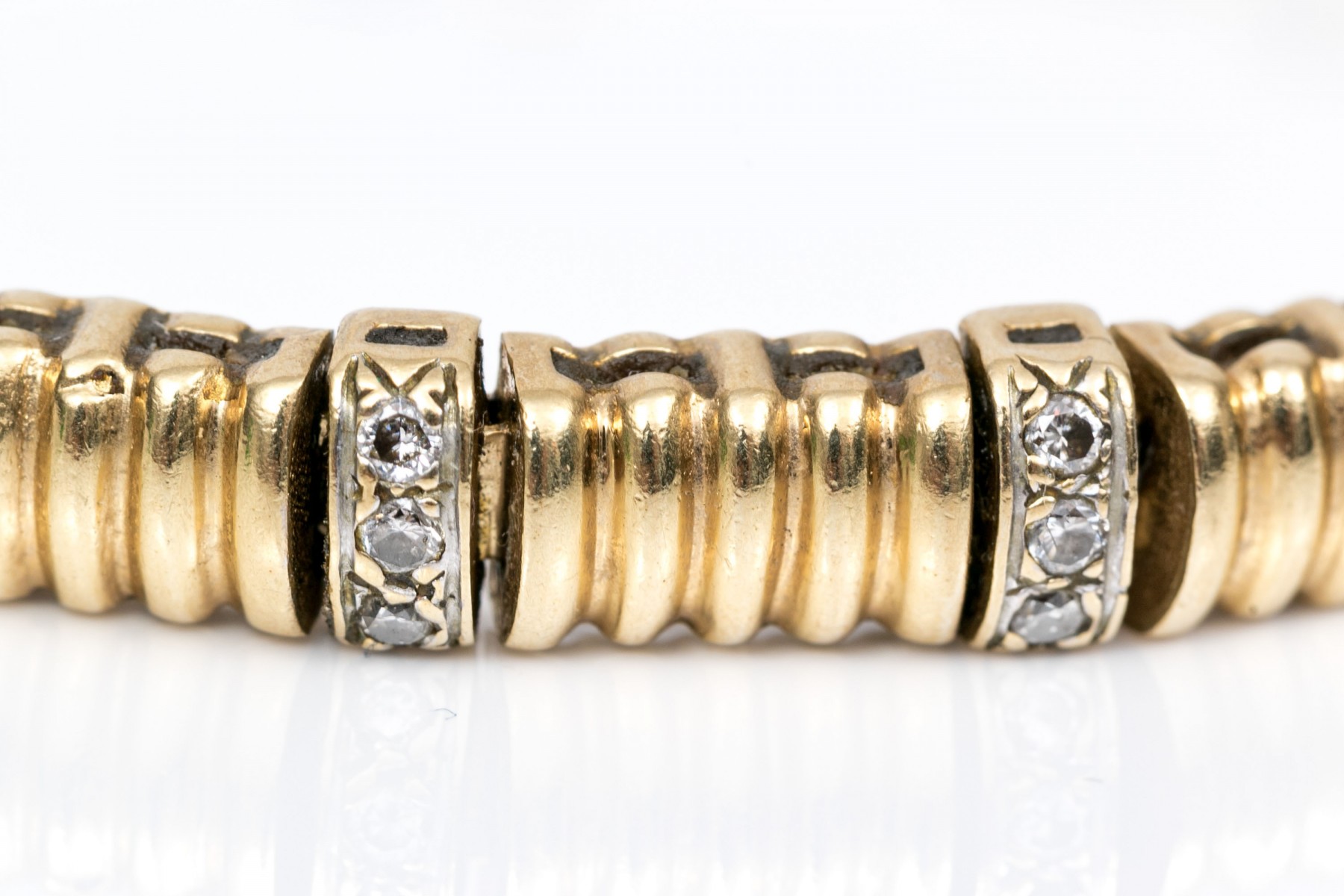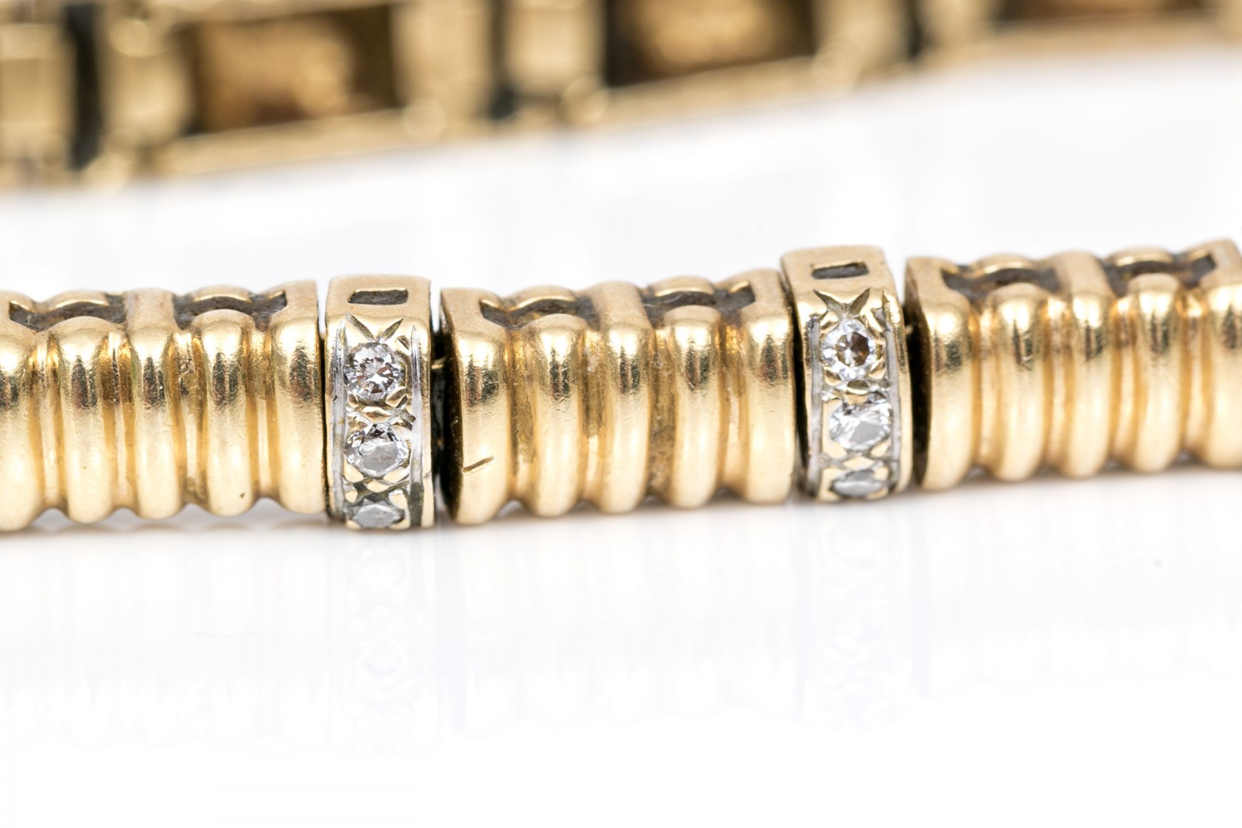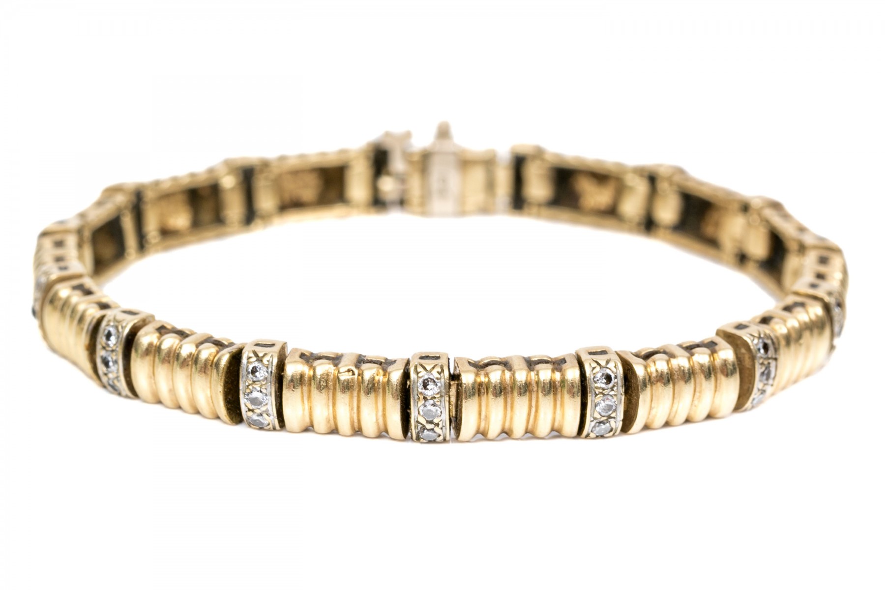 14k gold link and diamond line bracelet. This stylish bracelet features high polished, ribbed links, alternating with stacks of round faceted diamonds, approximately 0.45 TCW, prong set. The bracelet is finished by a hidden box style clasp and a foldover safety