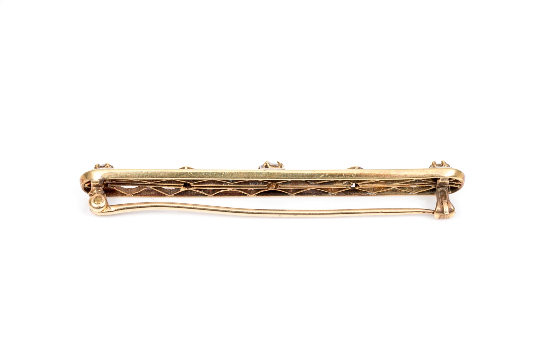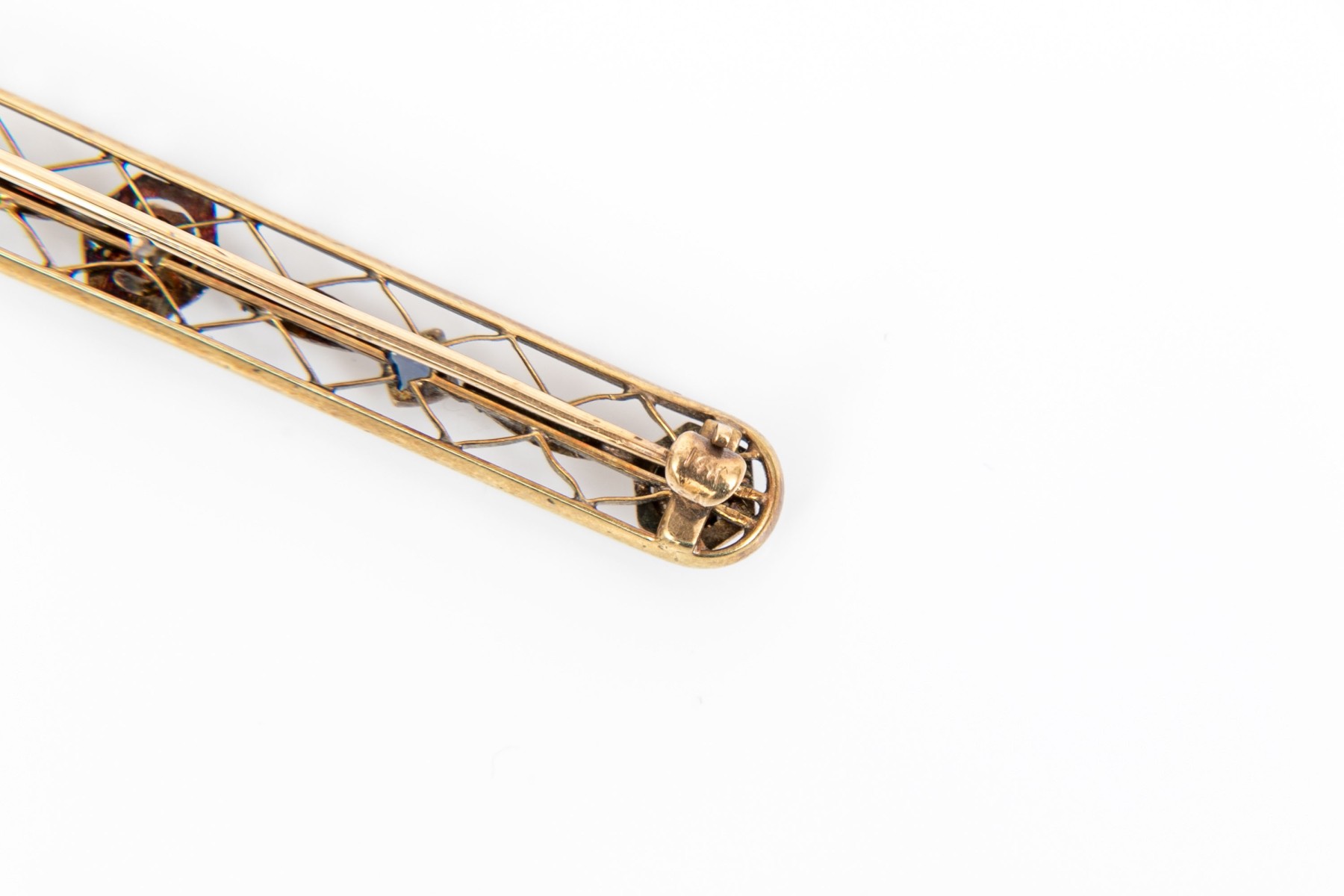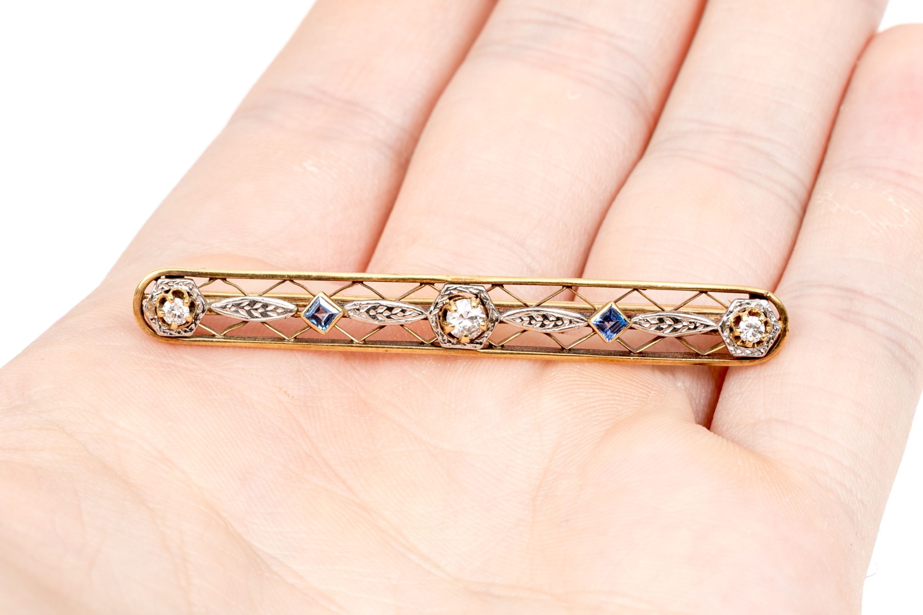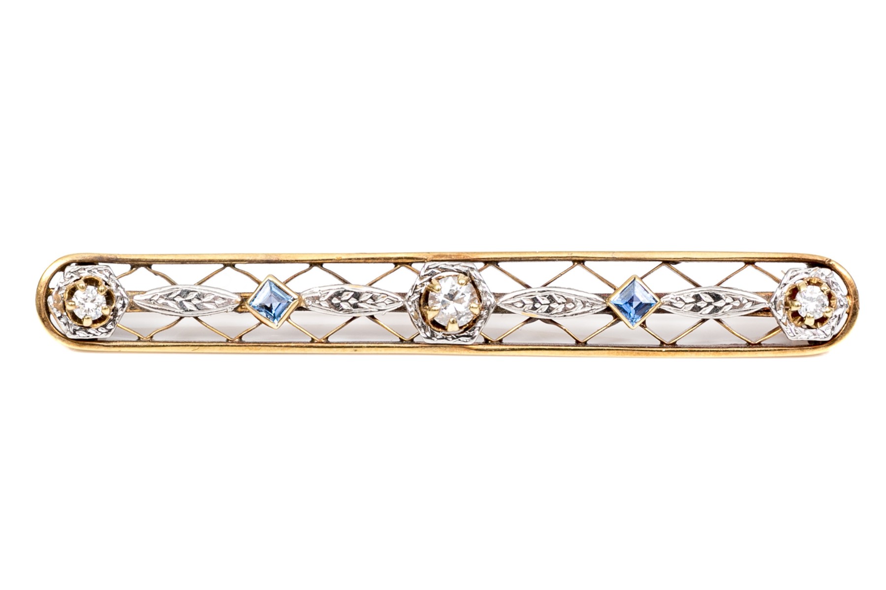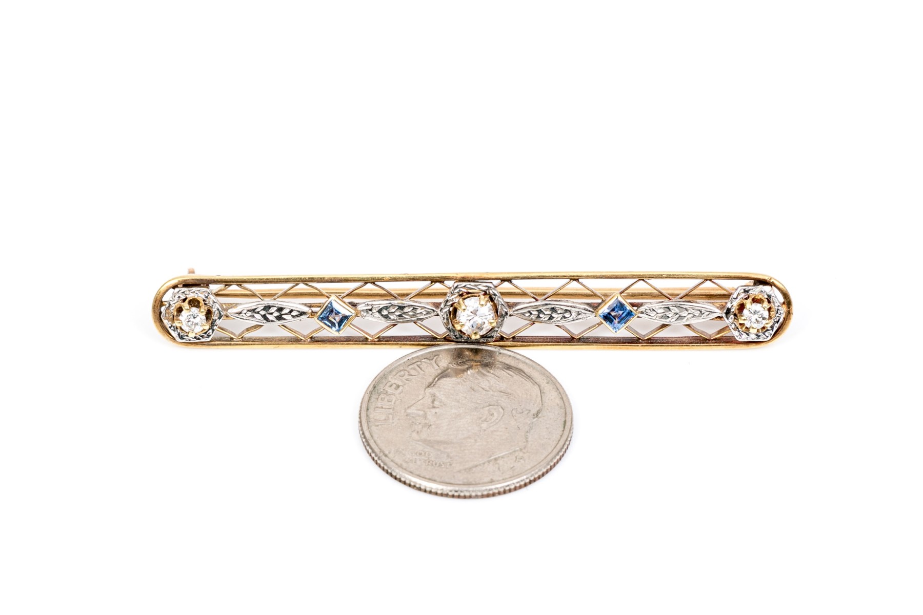 14k gold vintage lovely blue sapphire and diamond lattice bar pin; sapphire weight is app. 0.20 TCW, diamonds are app. 0.14 TCW