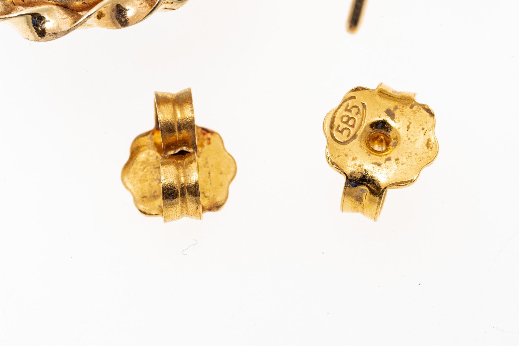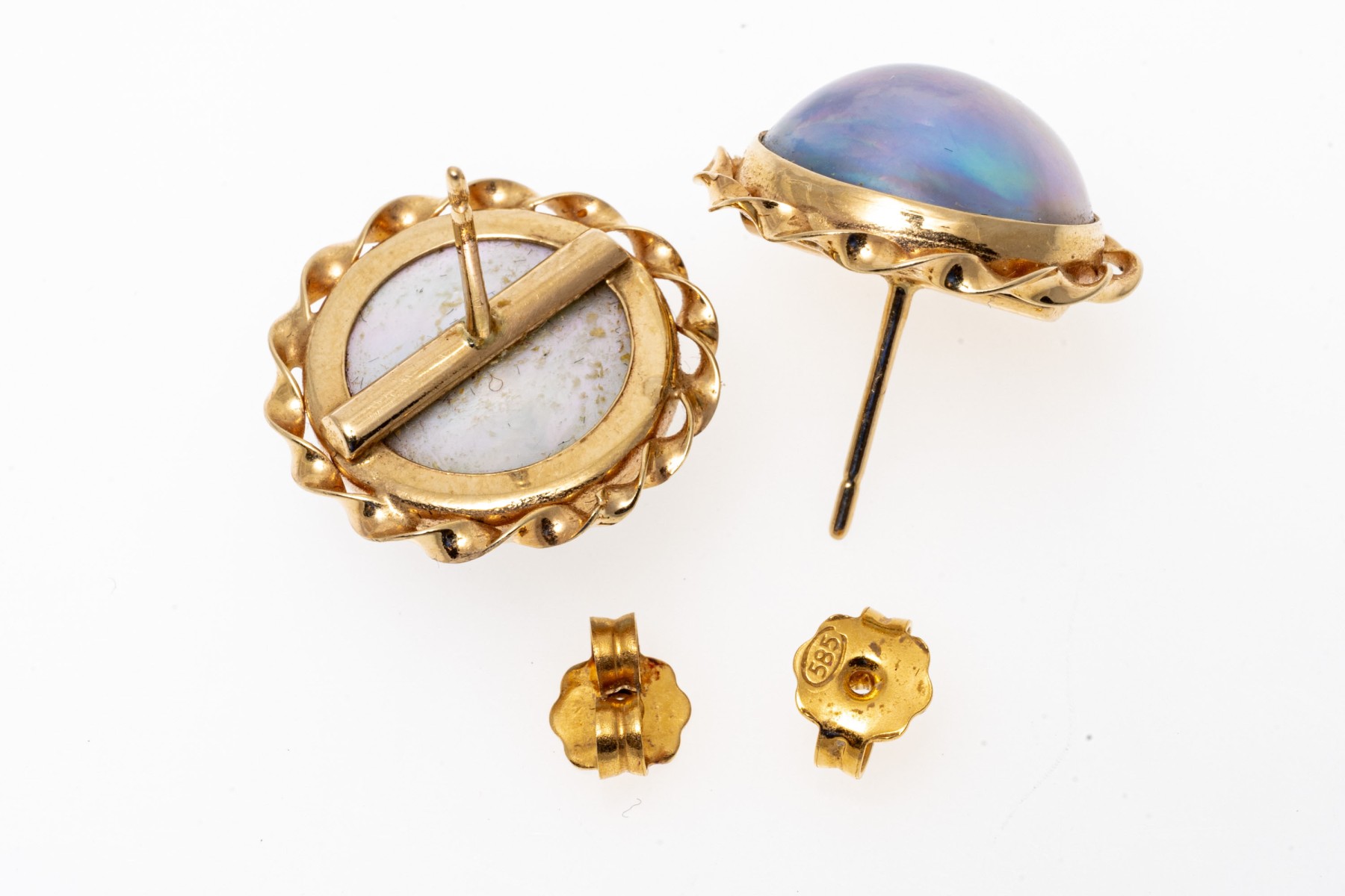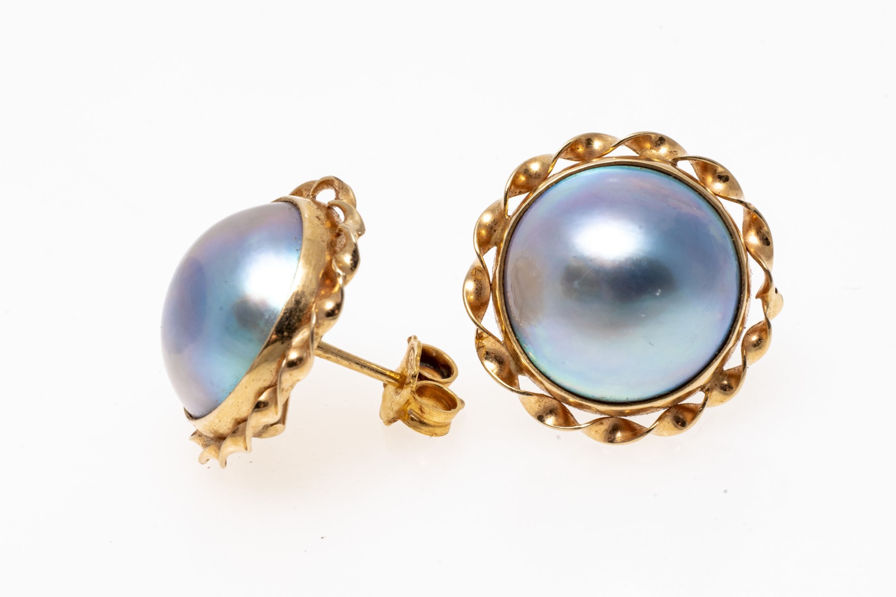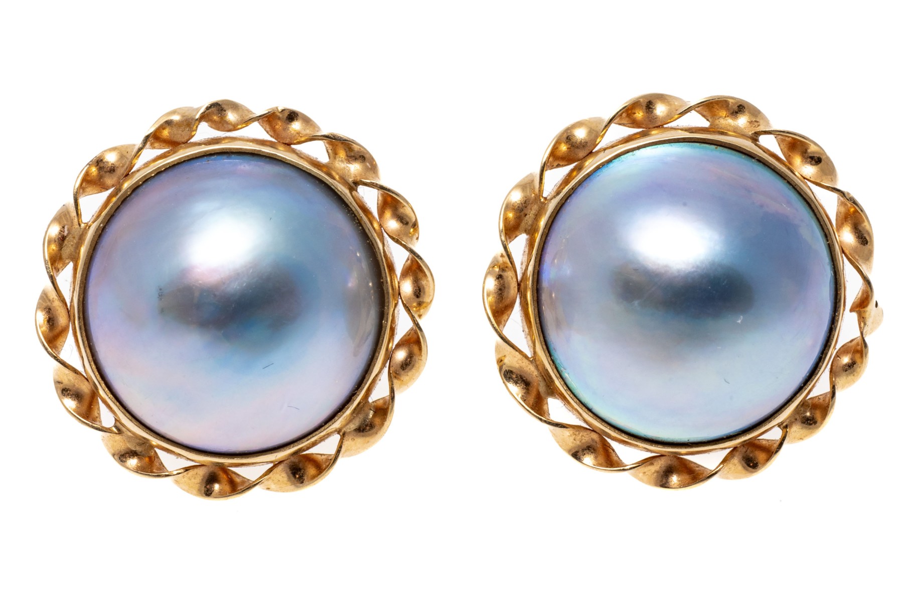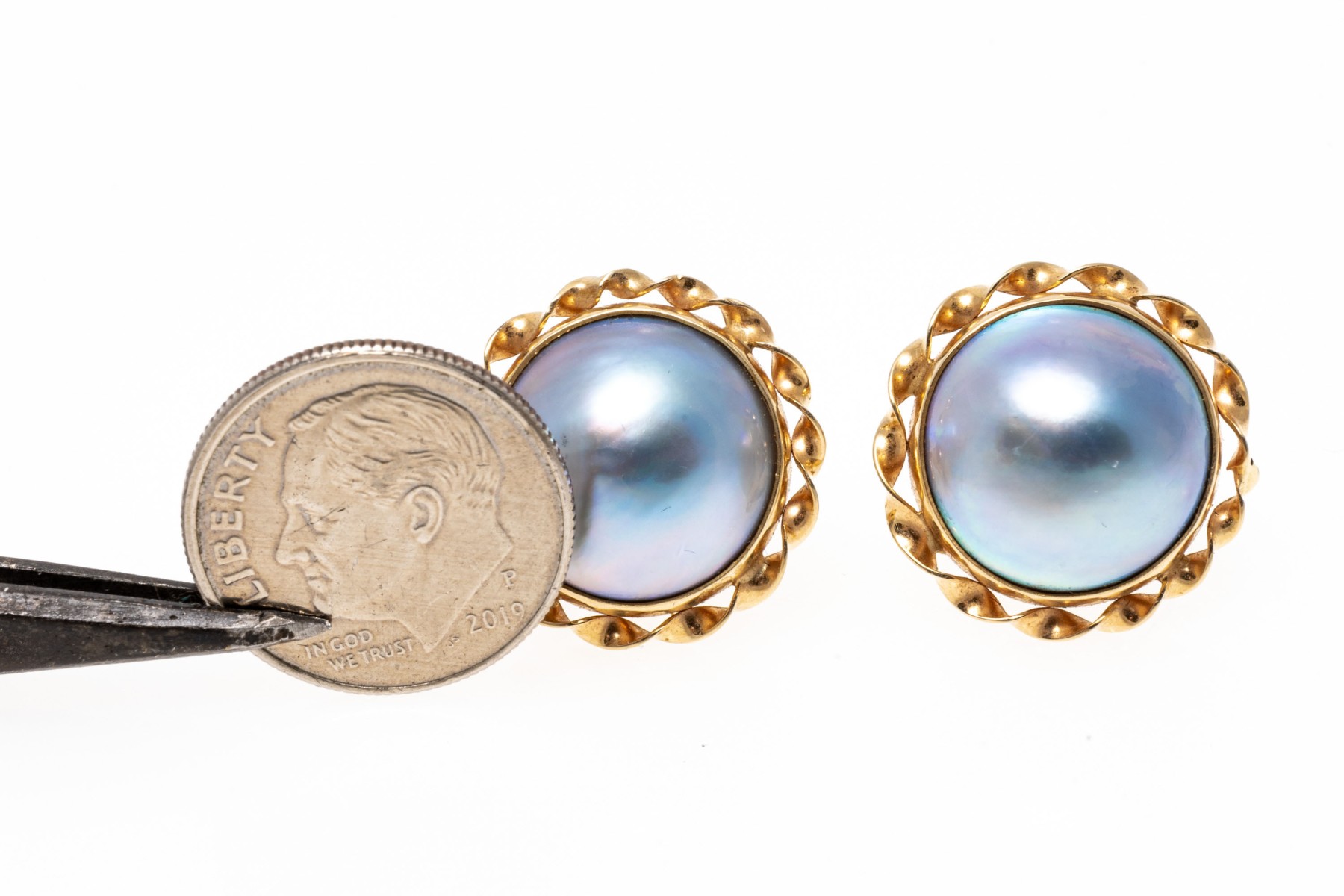 A pair of 14K yellow gold earrings displaying grey toned 13mm mabe pearls within a polished twist style frame. Post and clutch backings.