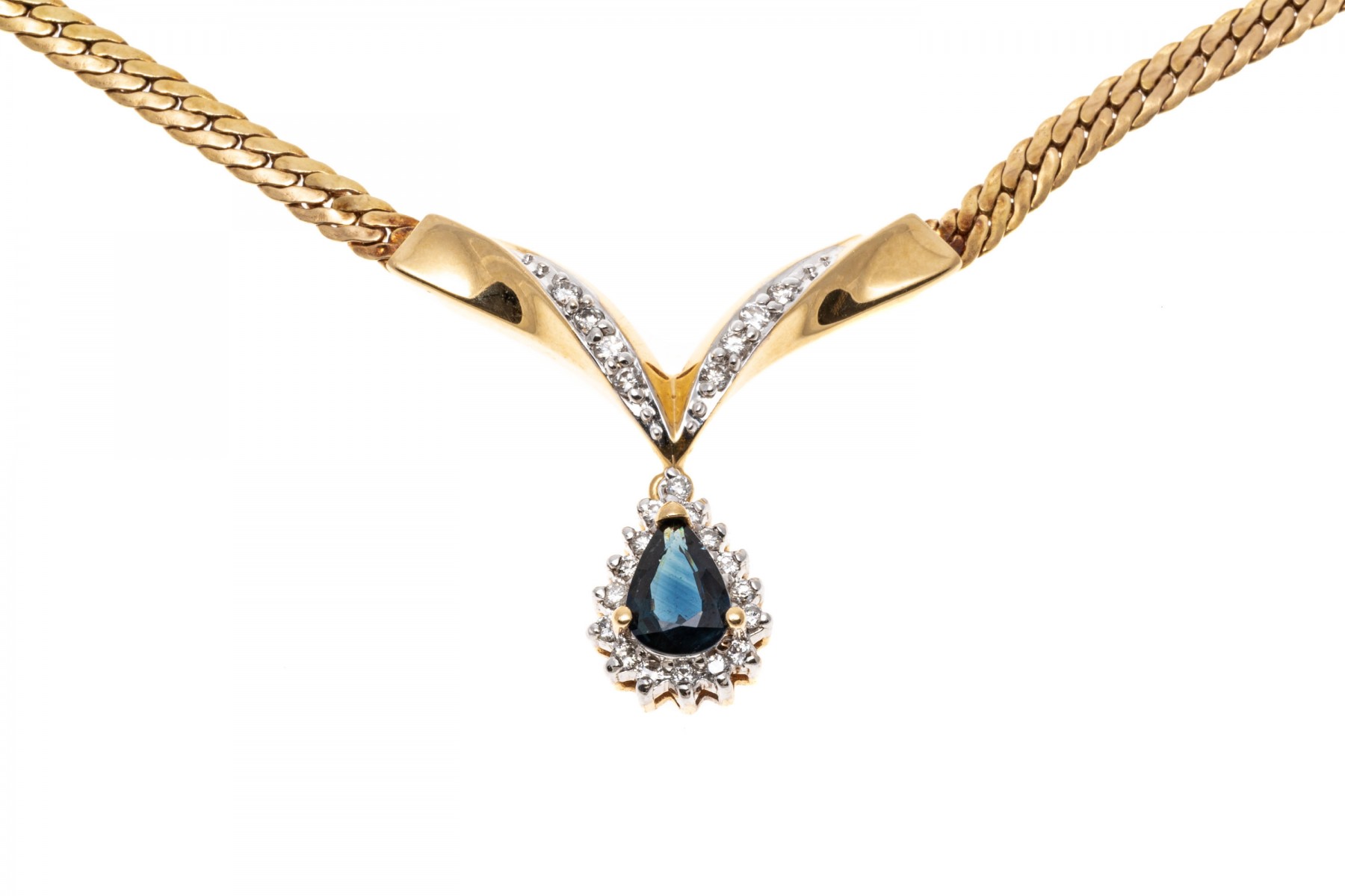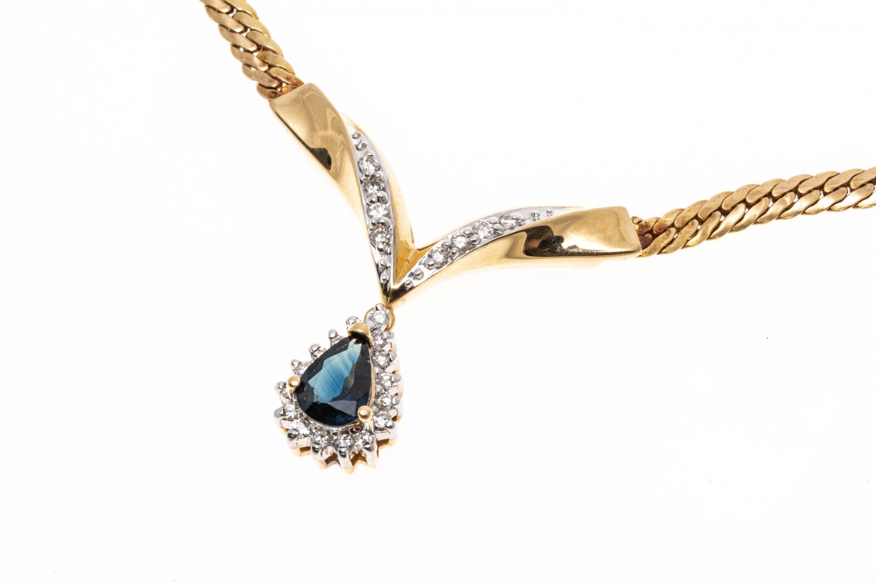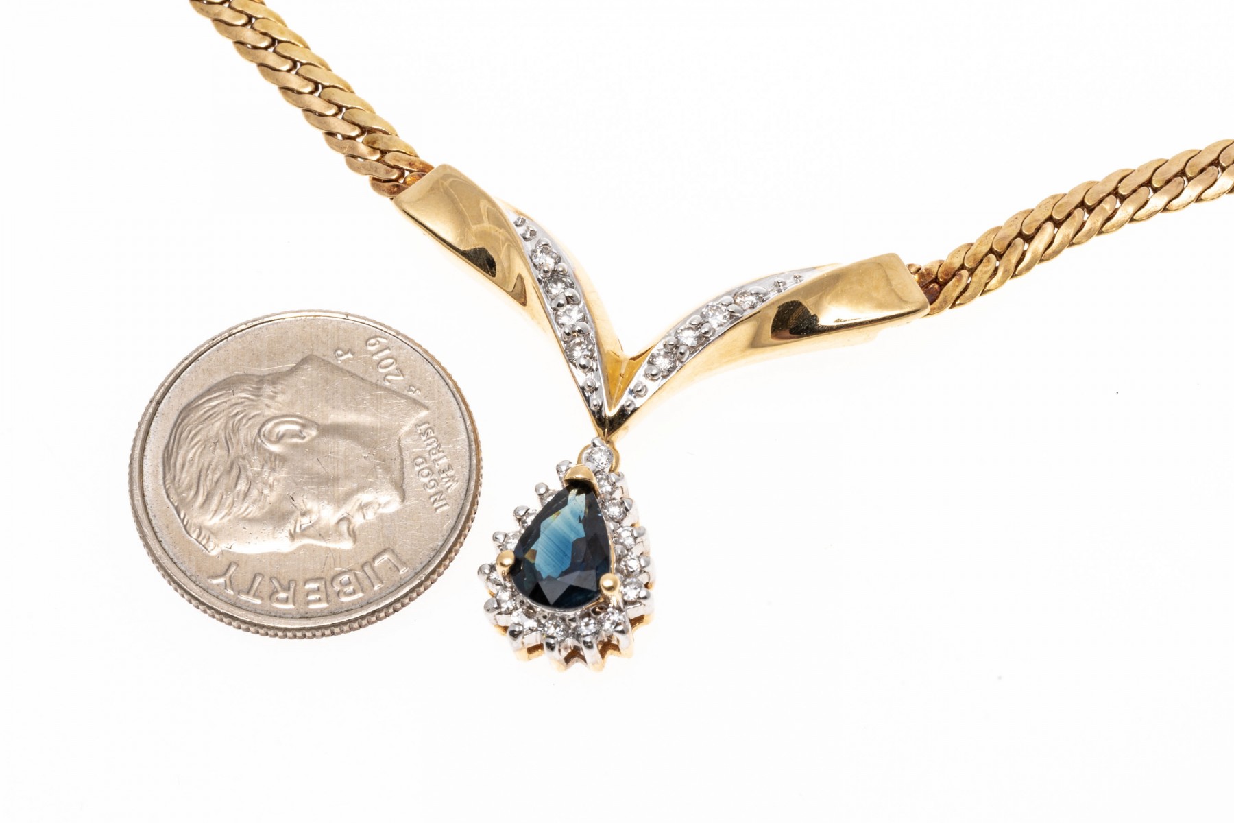 14K yellow gold, diamond and sapphire necklace. This necklace features herringbone chain with centered chevron charm set with diamonds in white gold. Suspended from the charm is a pear cut sapphire in a diamond halo. The sapphire is approximately 0.57 cts and the diamonds are approximately 0.43 TCW. Lobster claw style clasp.