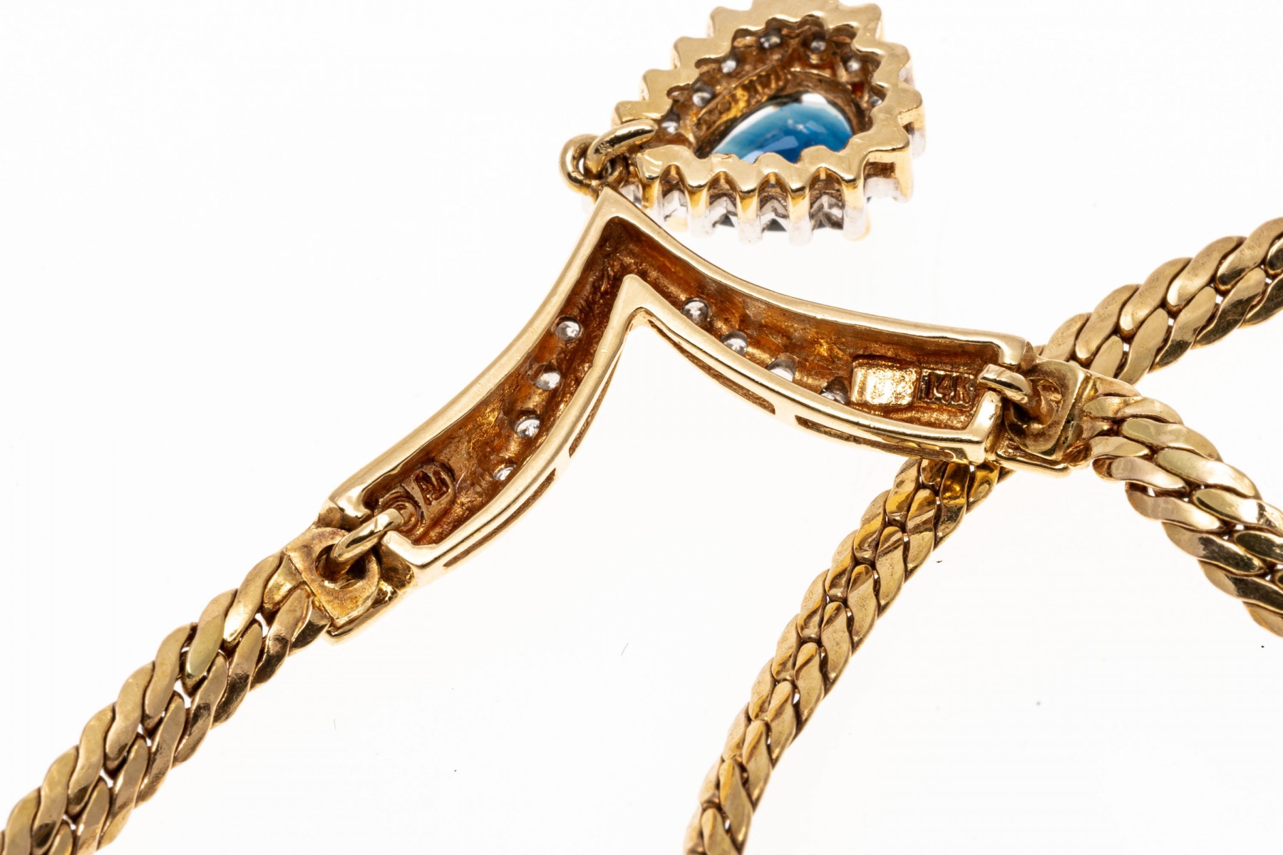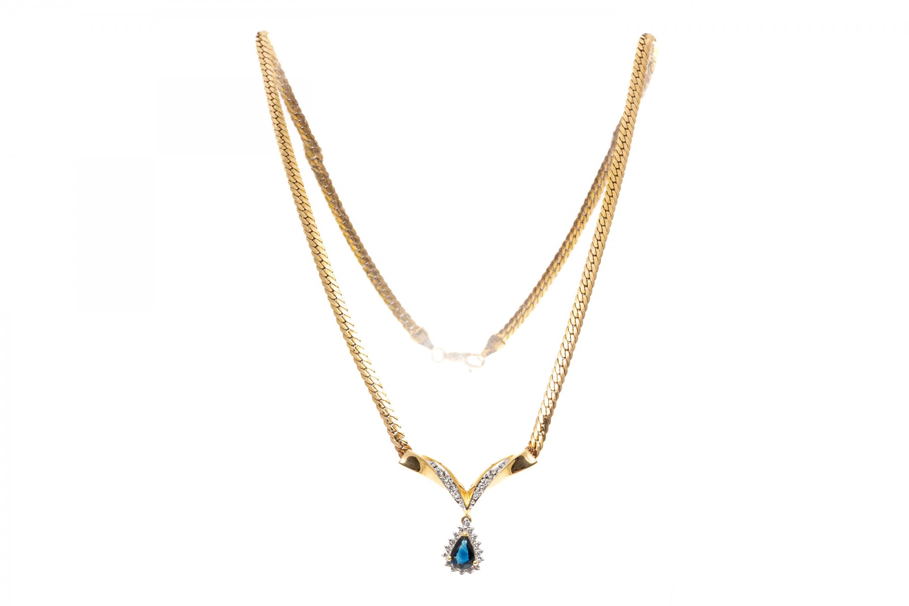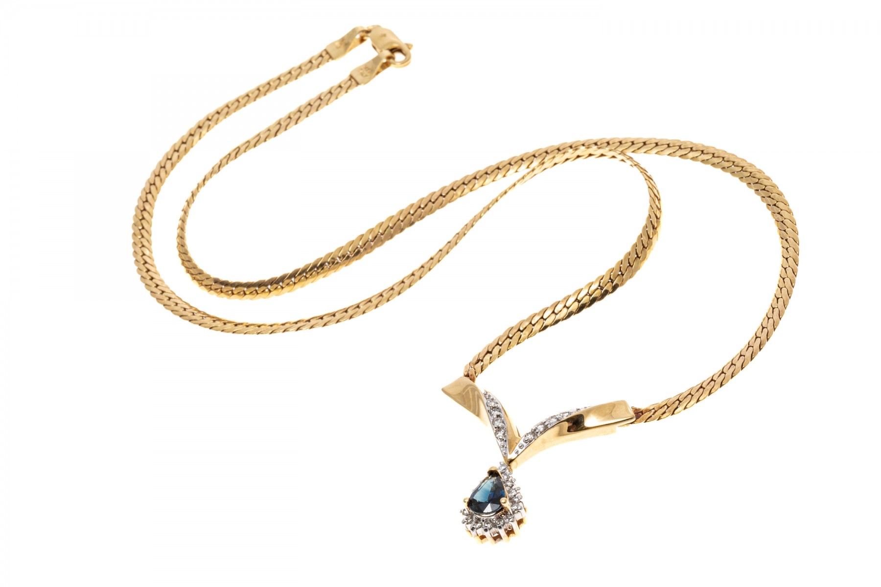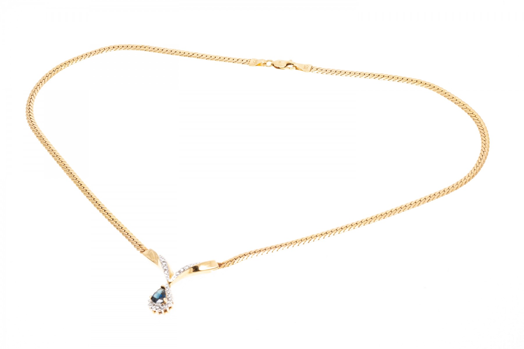 14K yellow gold, diamond and sapphire necklace. This necklace features herringbone chain with centered chevron charm set with diamonds in white gold. Suspended from the charm is a pear cut sapphire in a diamond halo. The sapphire is approximately 0.57 cts and the diamonds are approximately 0.43 TCW. Lobster claw style clasp.