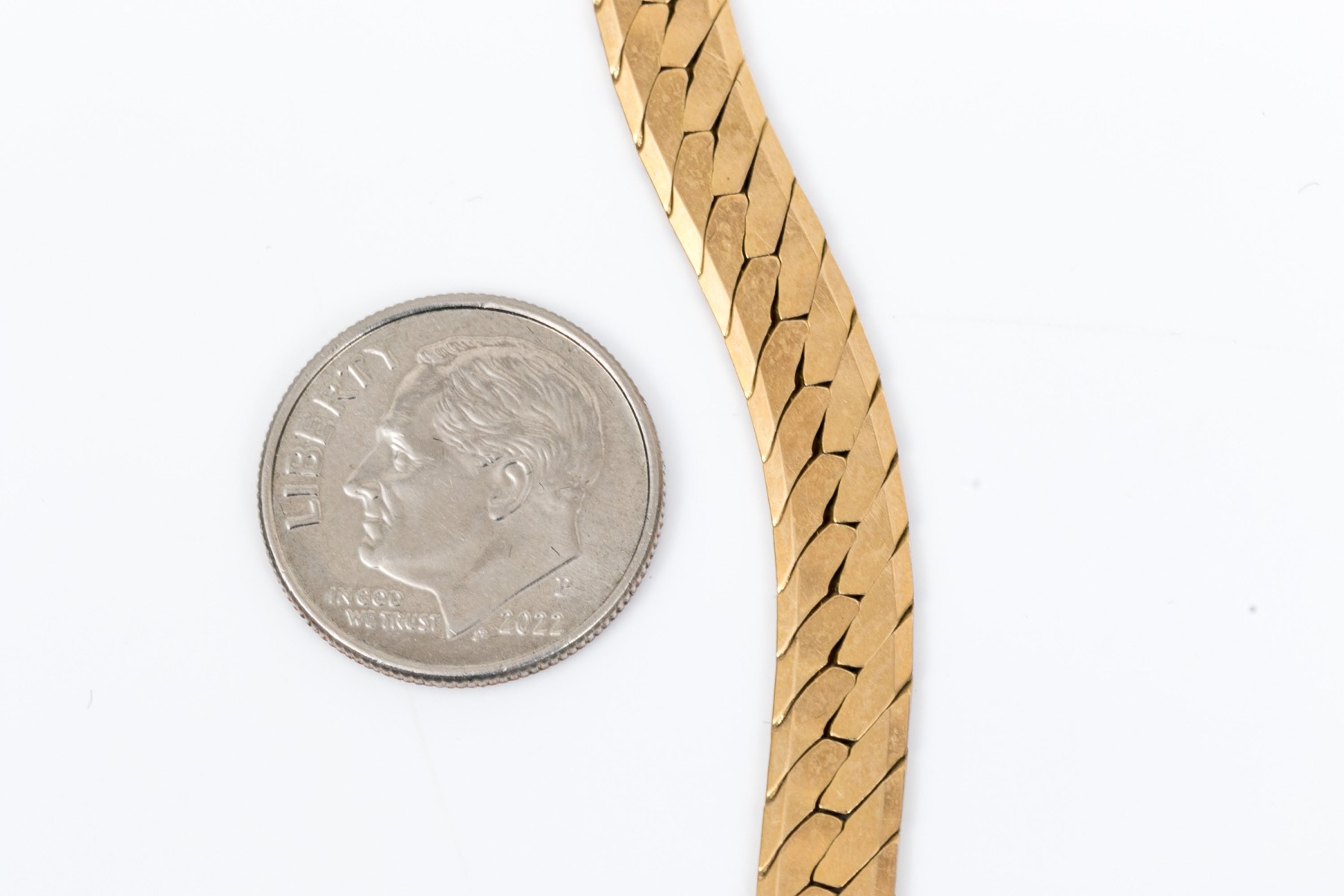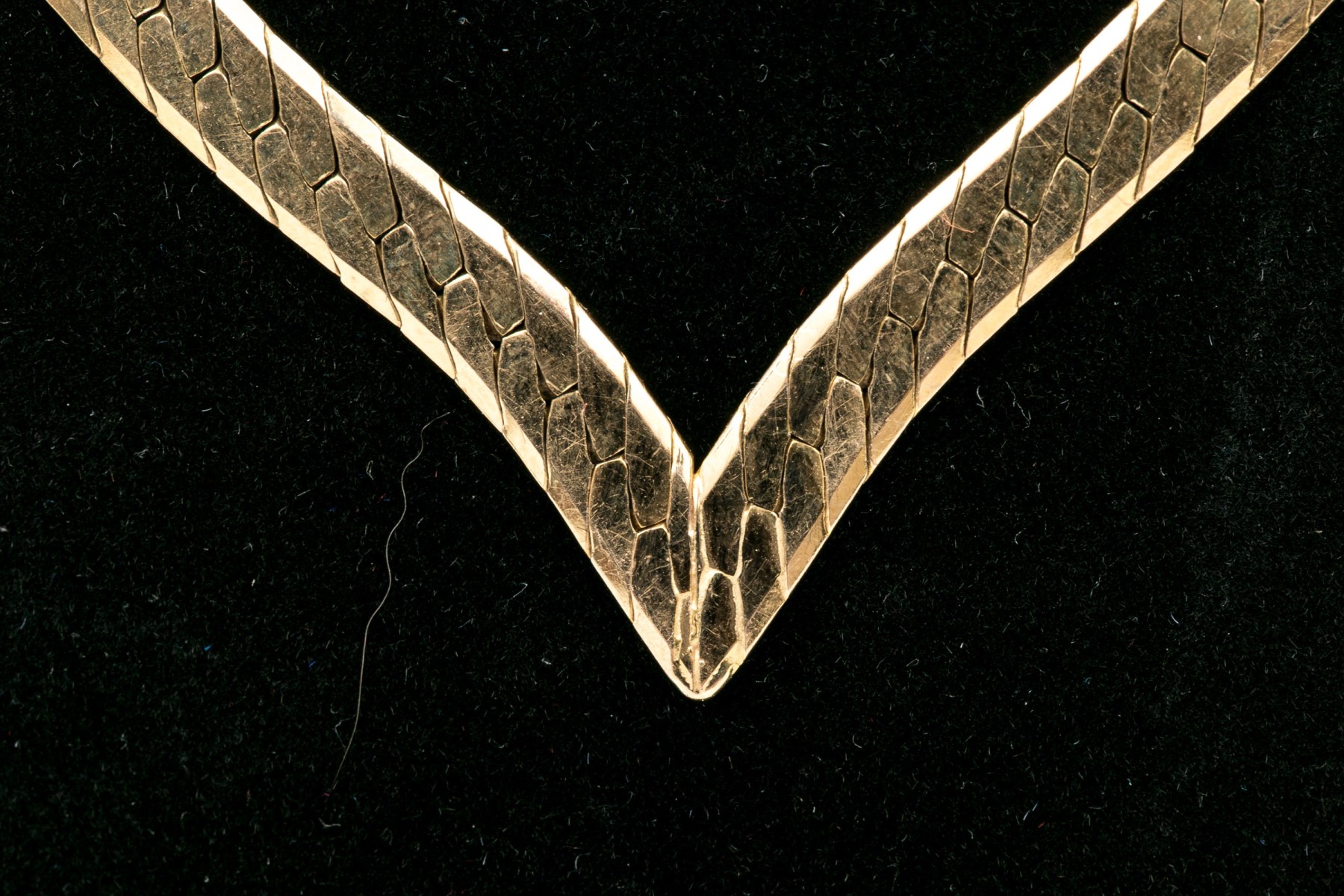Stunning 14K yellow gold herringbone chain necklace. The necklace has a chevron design with a bright polished finish. Lobster claw style clasp.