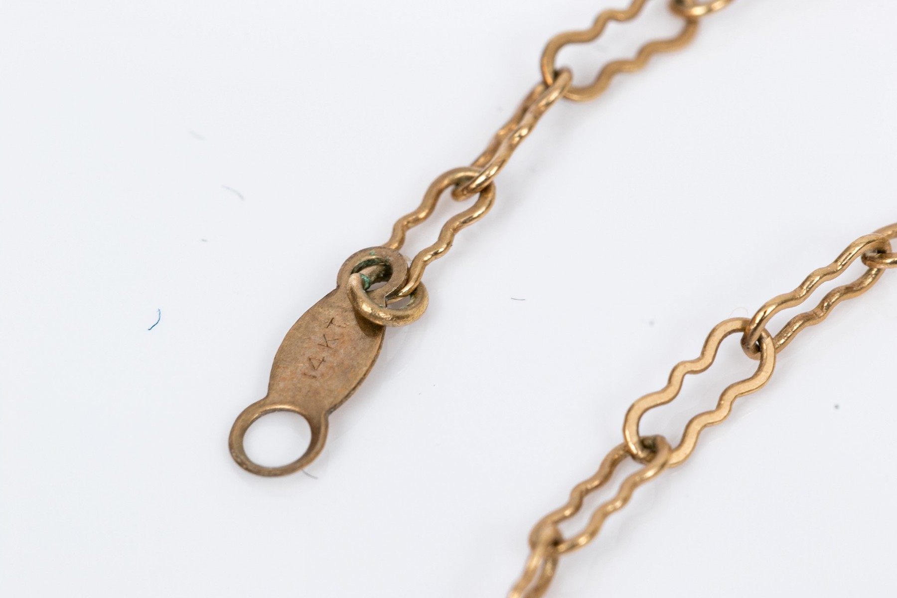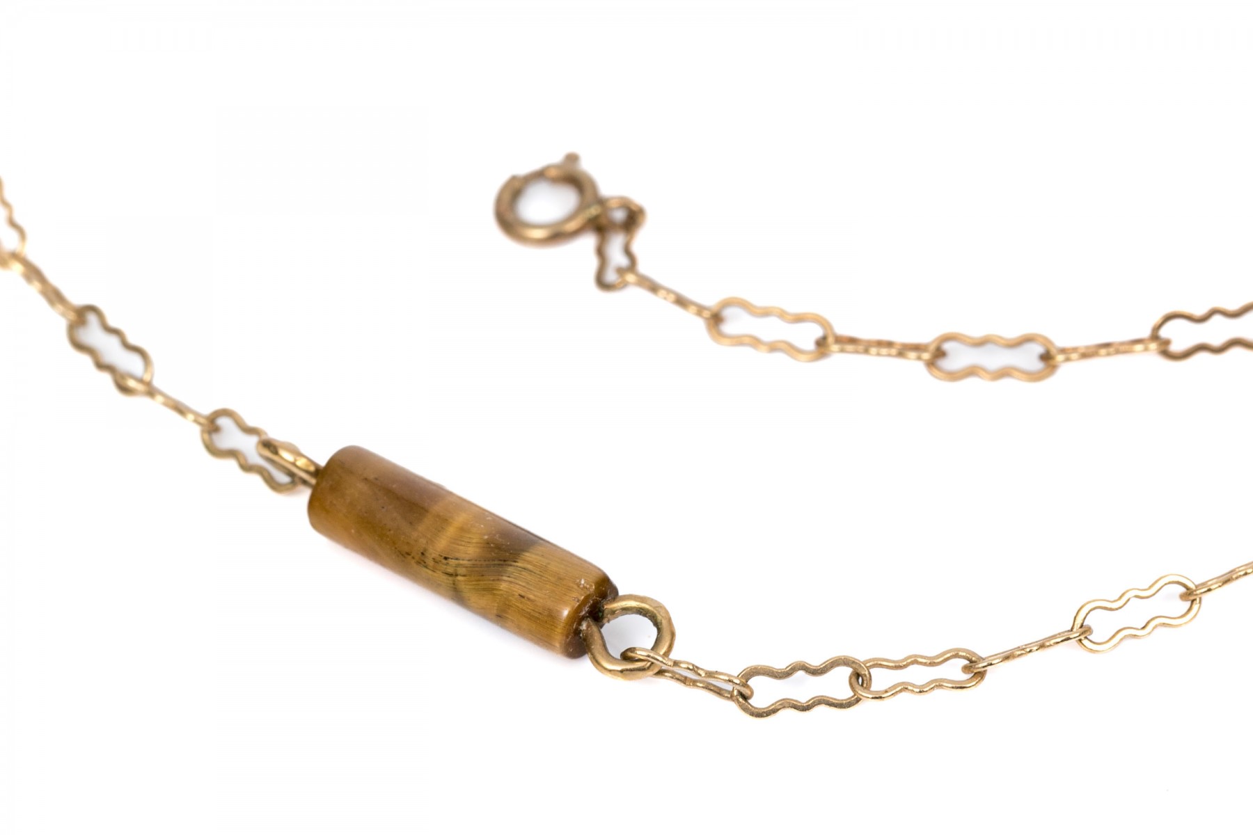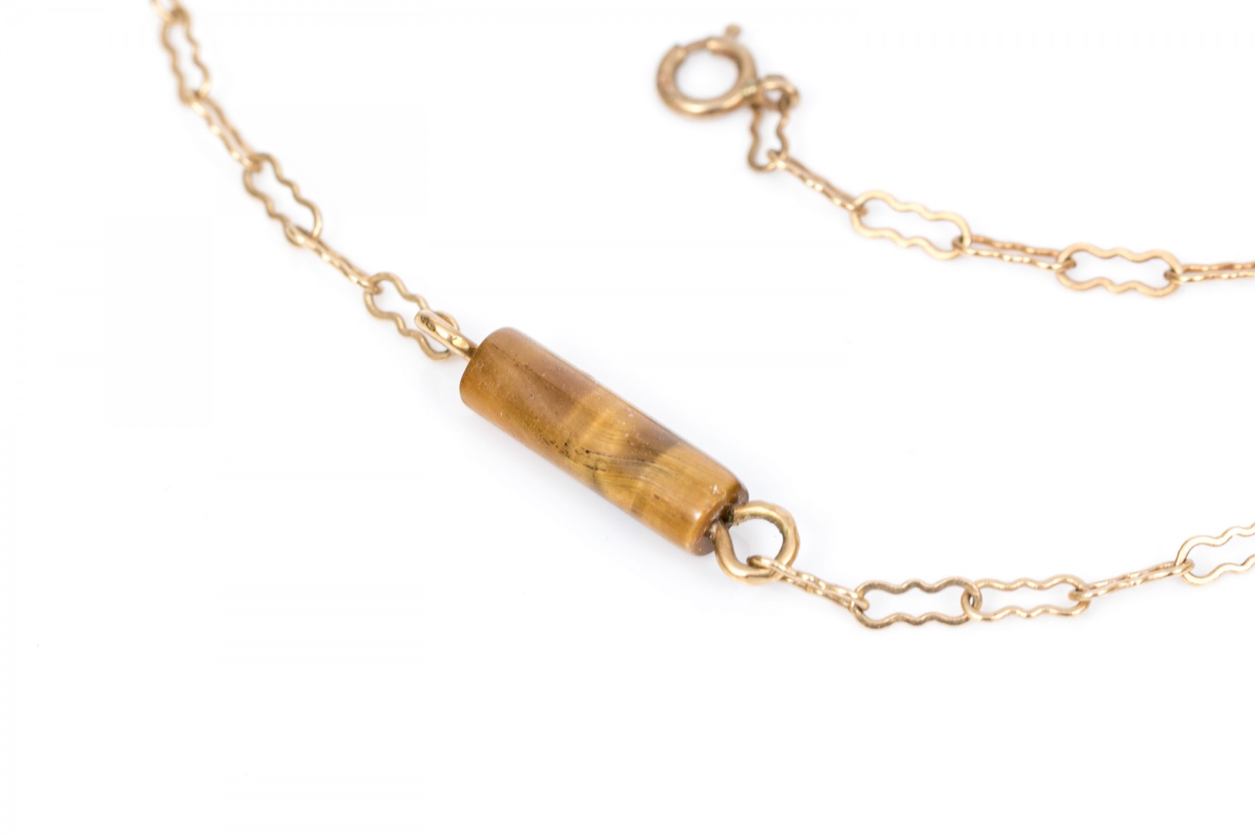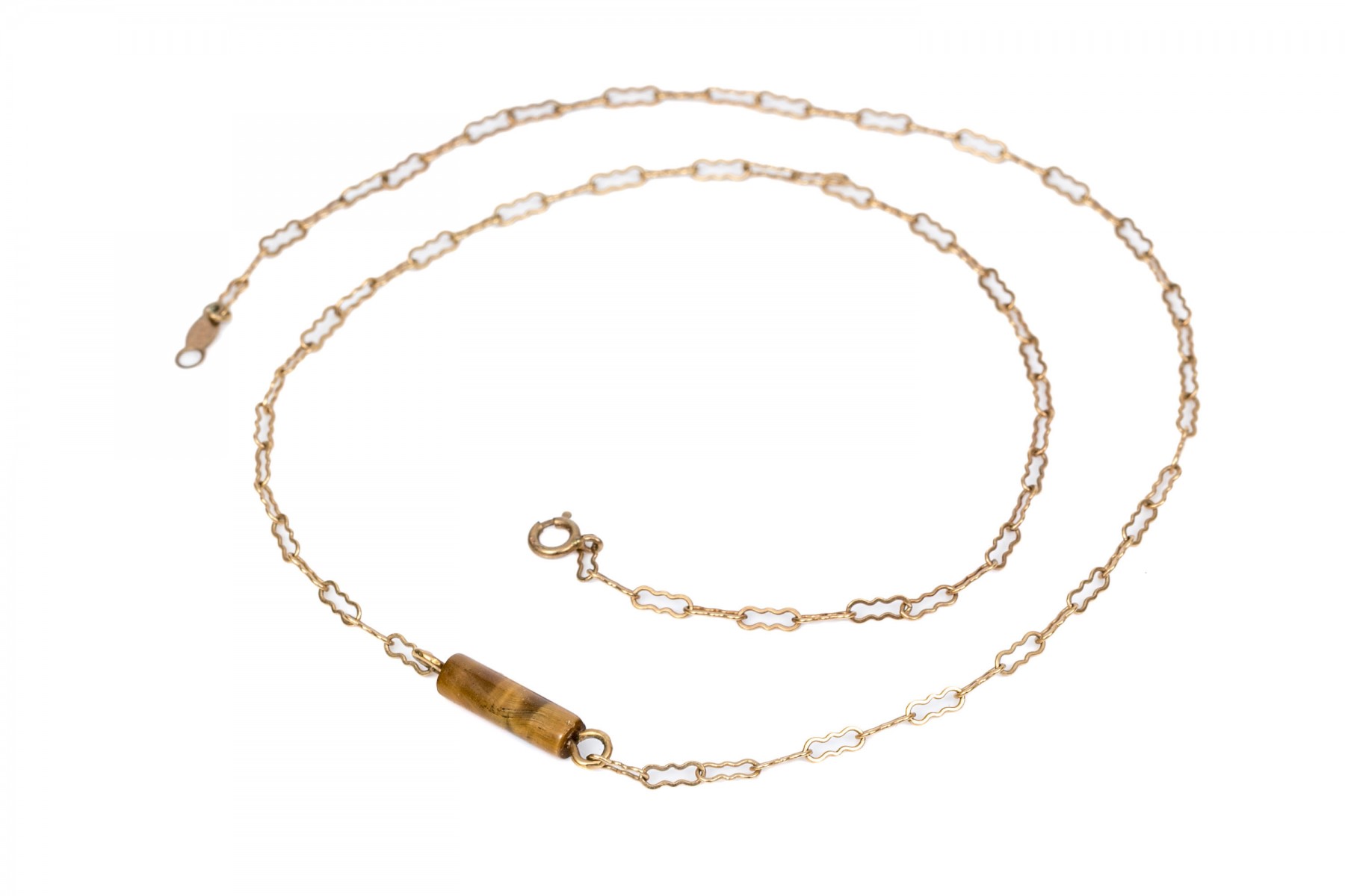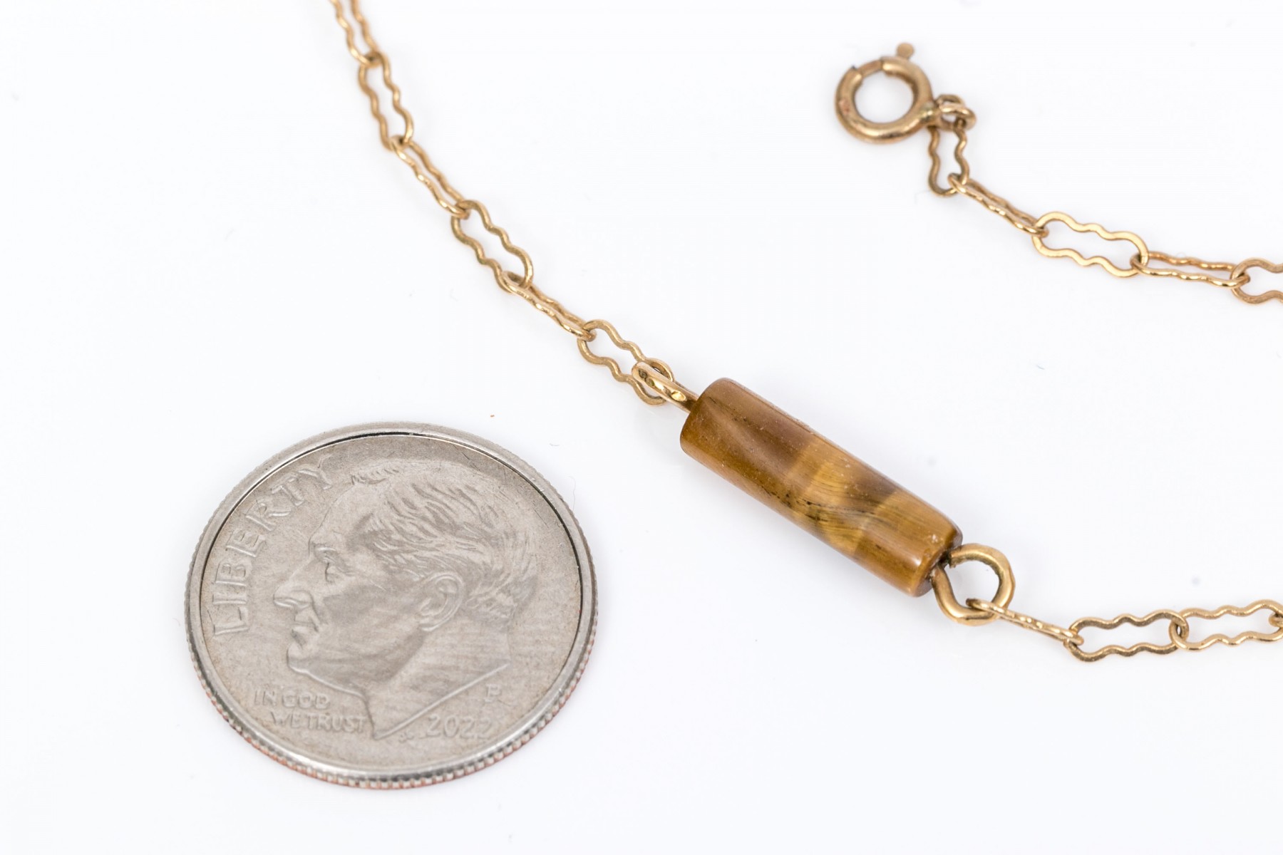 14K yellow gold link chain necklace. These textured links display a centered barrel shaped tigers eye stone. Spring ring clasp