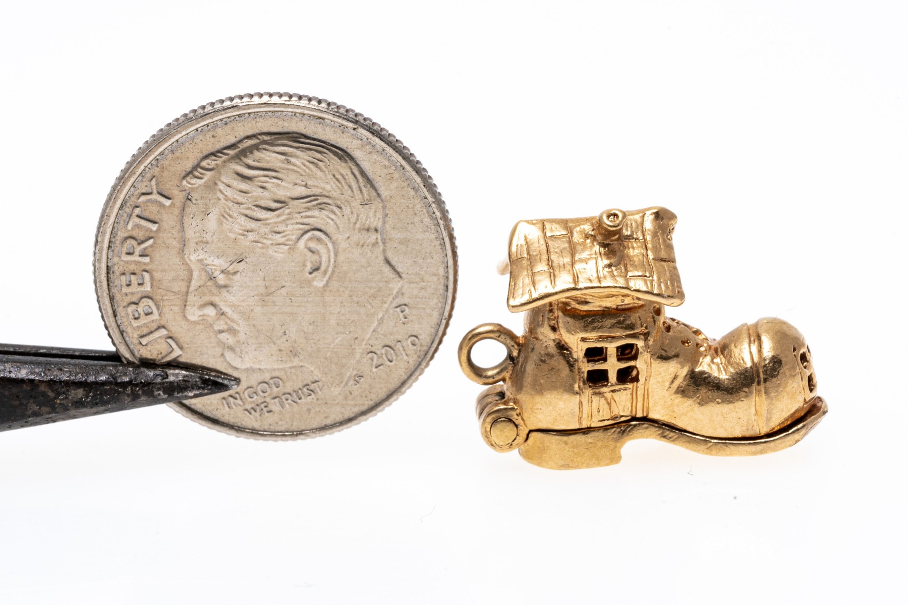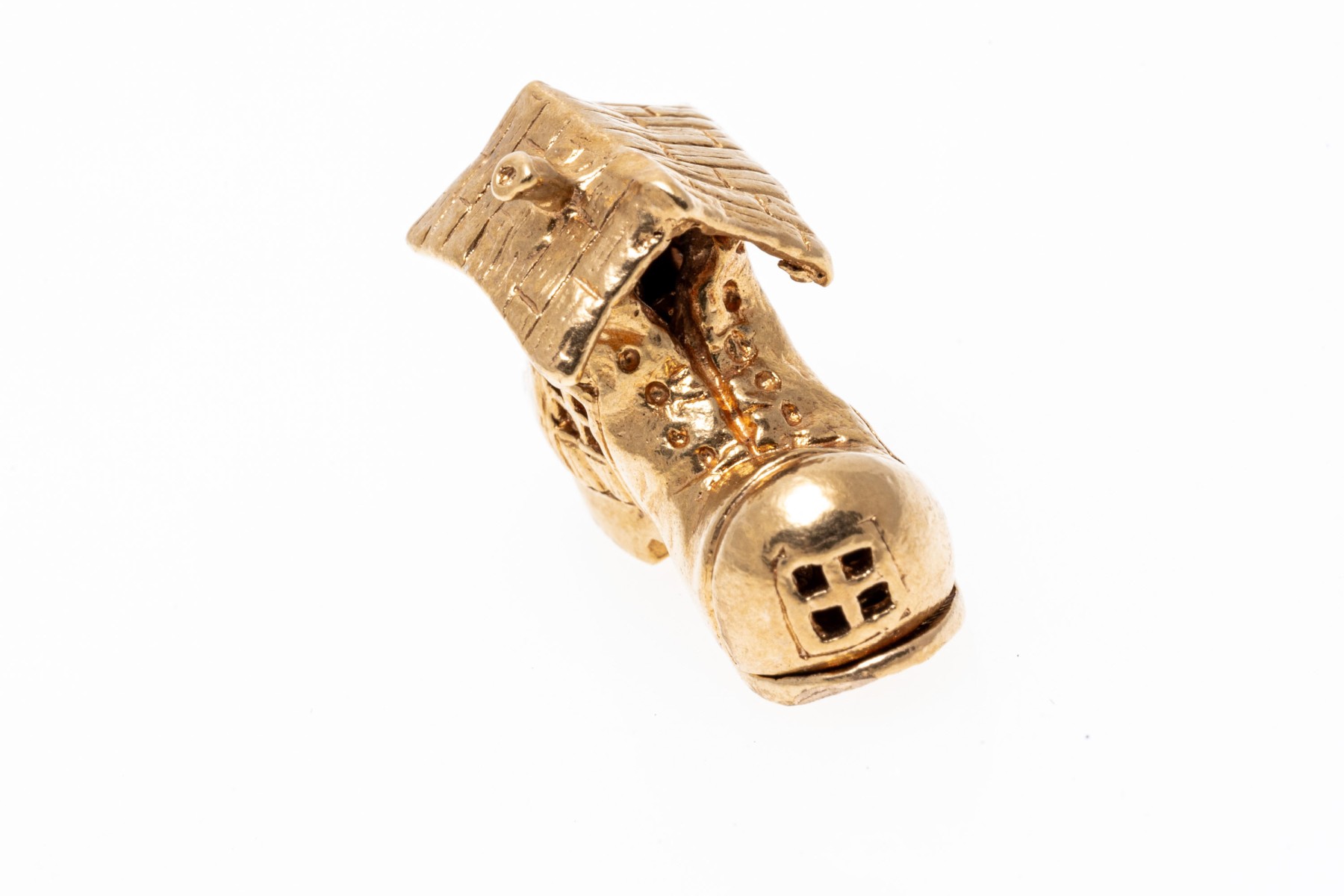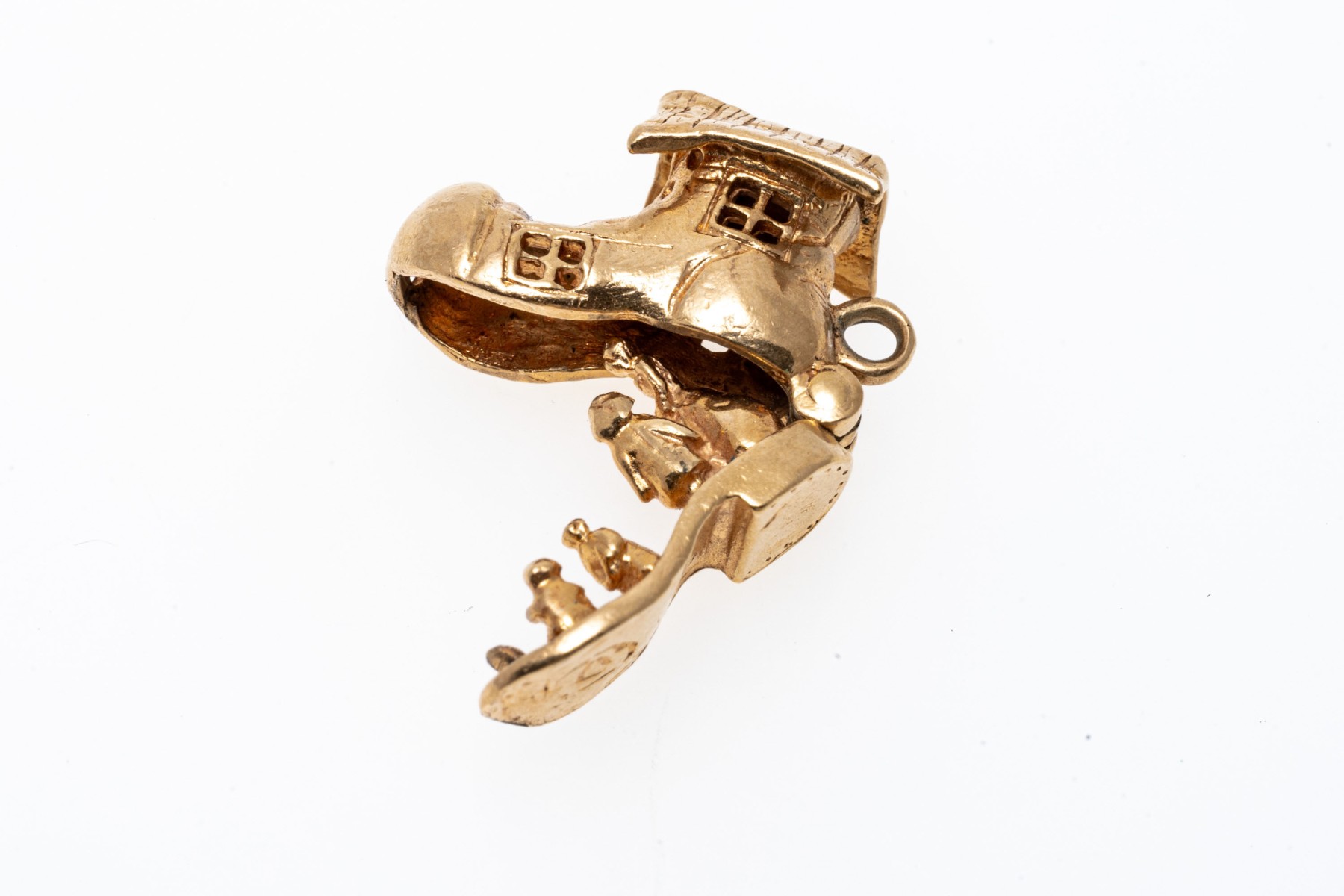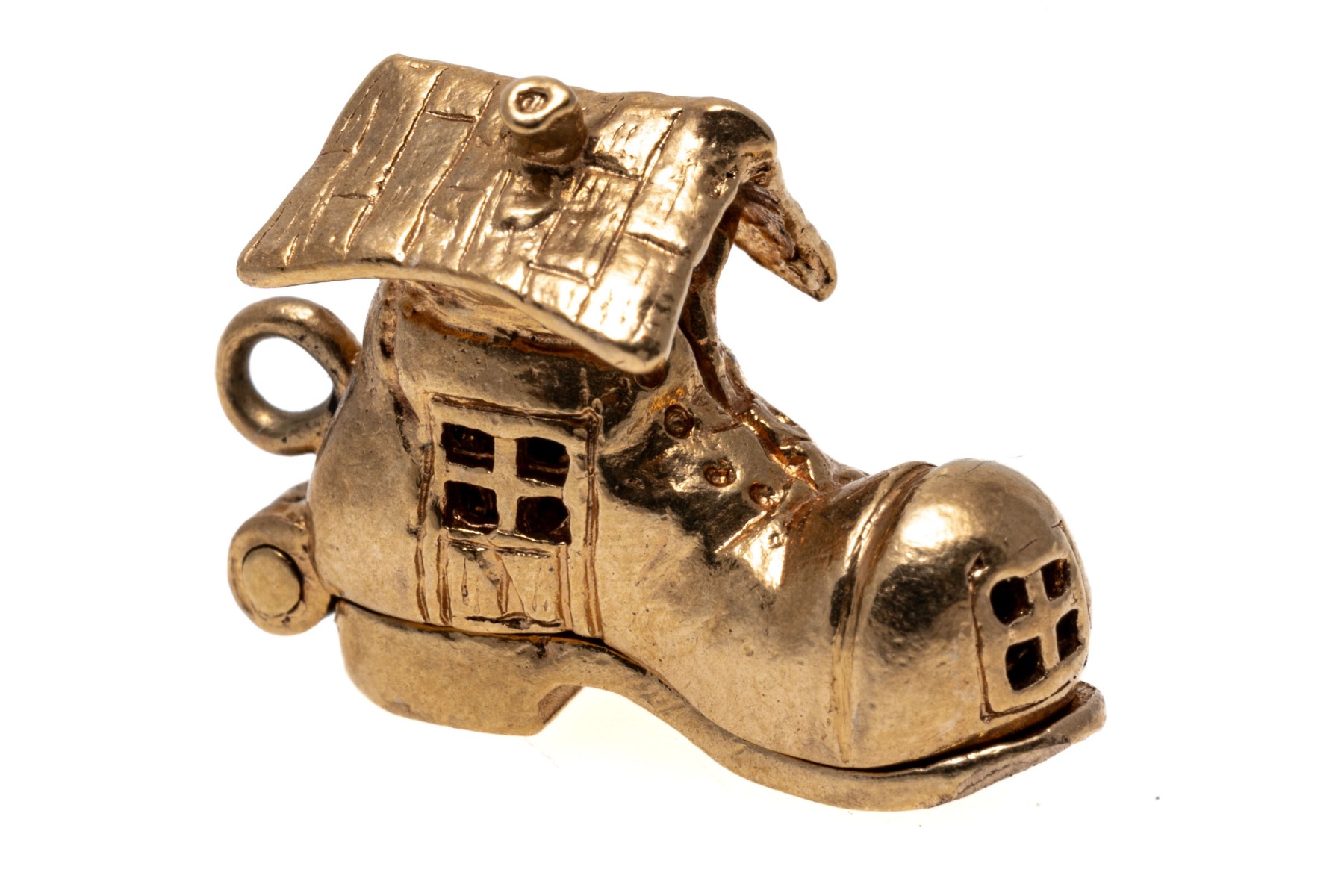 A whimsical yellow gold pendant or charm based off of the English nursery rhyme "There was an Old Woman Who Lived in a Shoe." The charm features a boot-shaped house with diminutive pierced windows, the shoe and sole opening with a hinge to reveal an old woman and her children within.