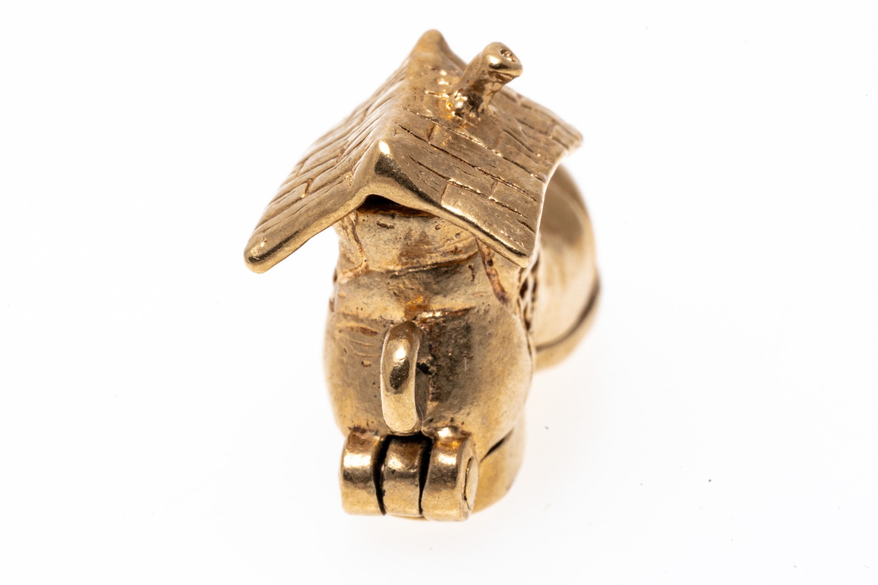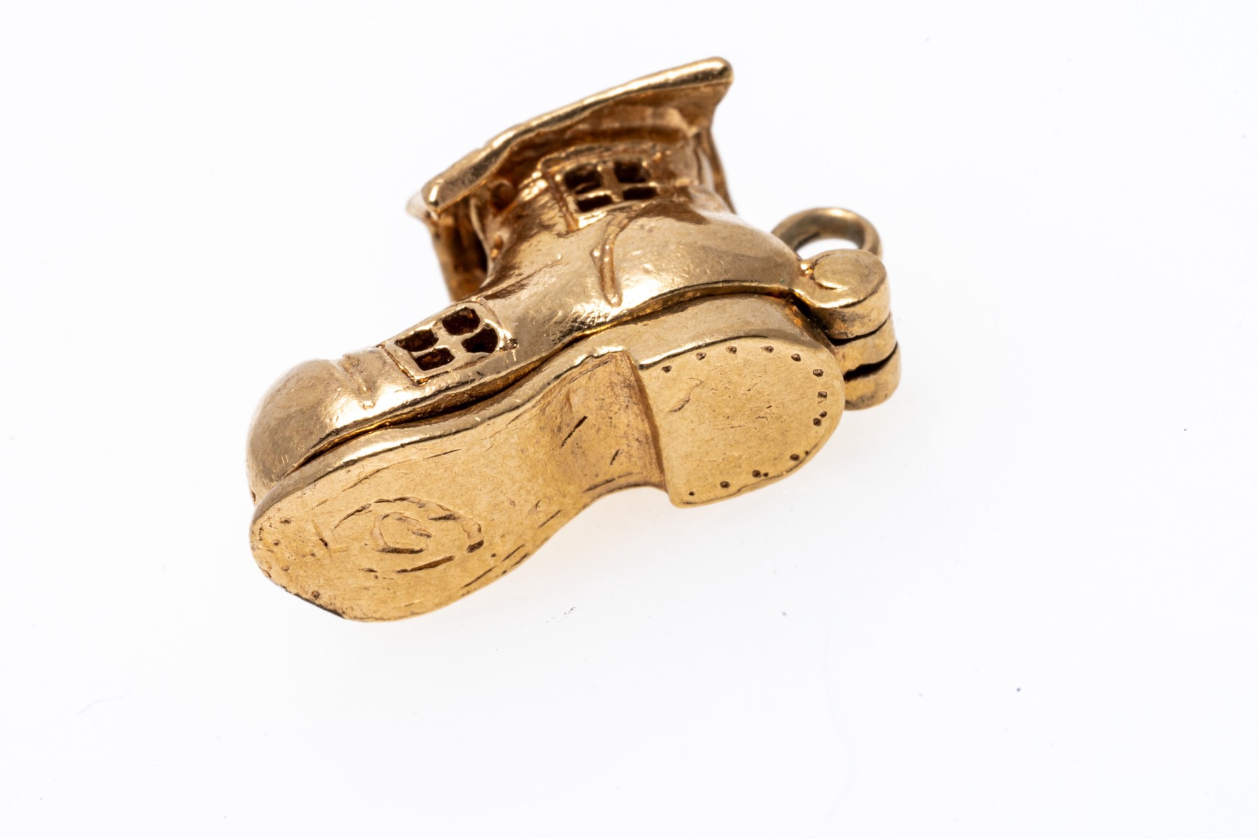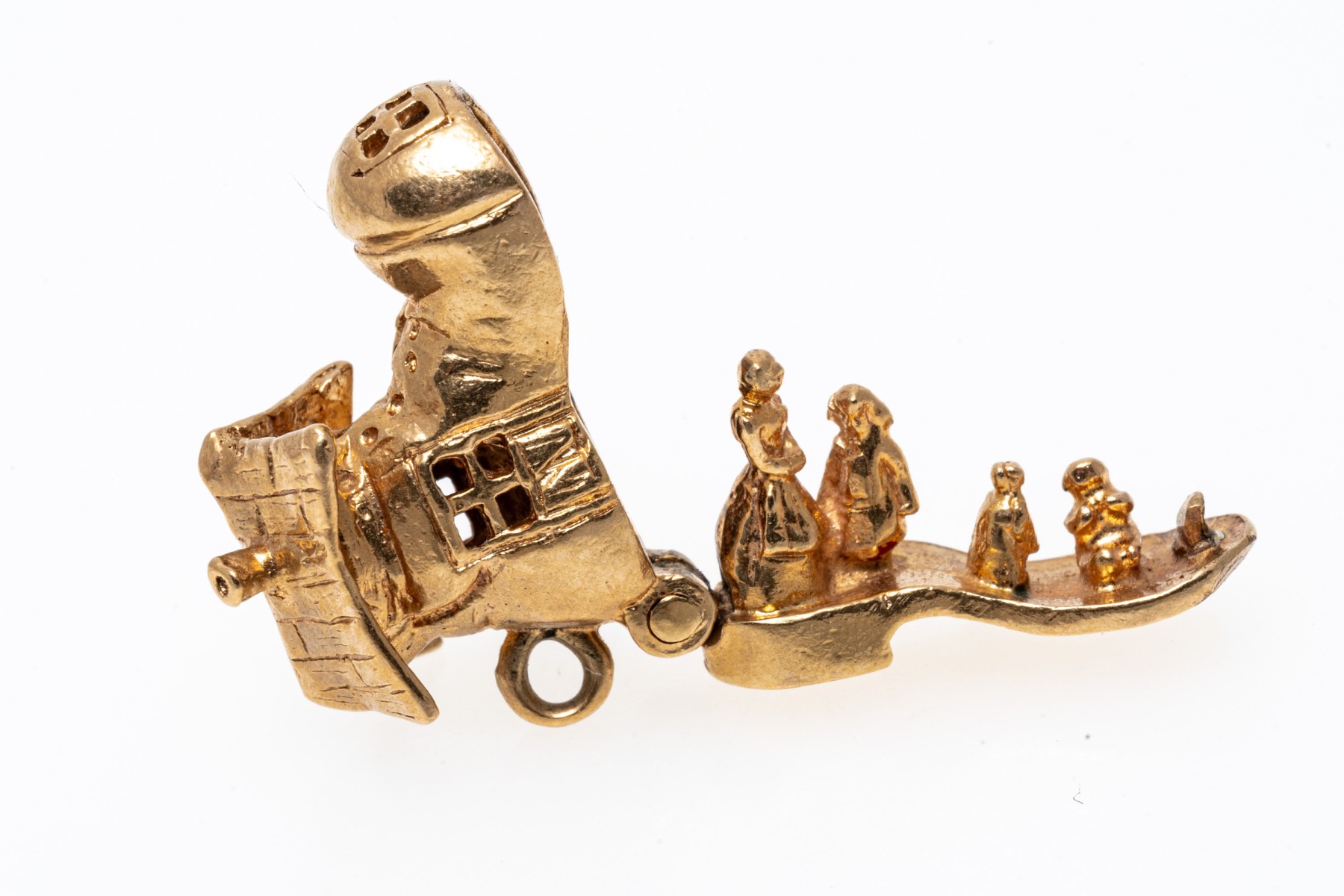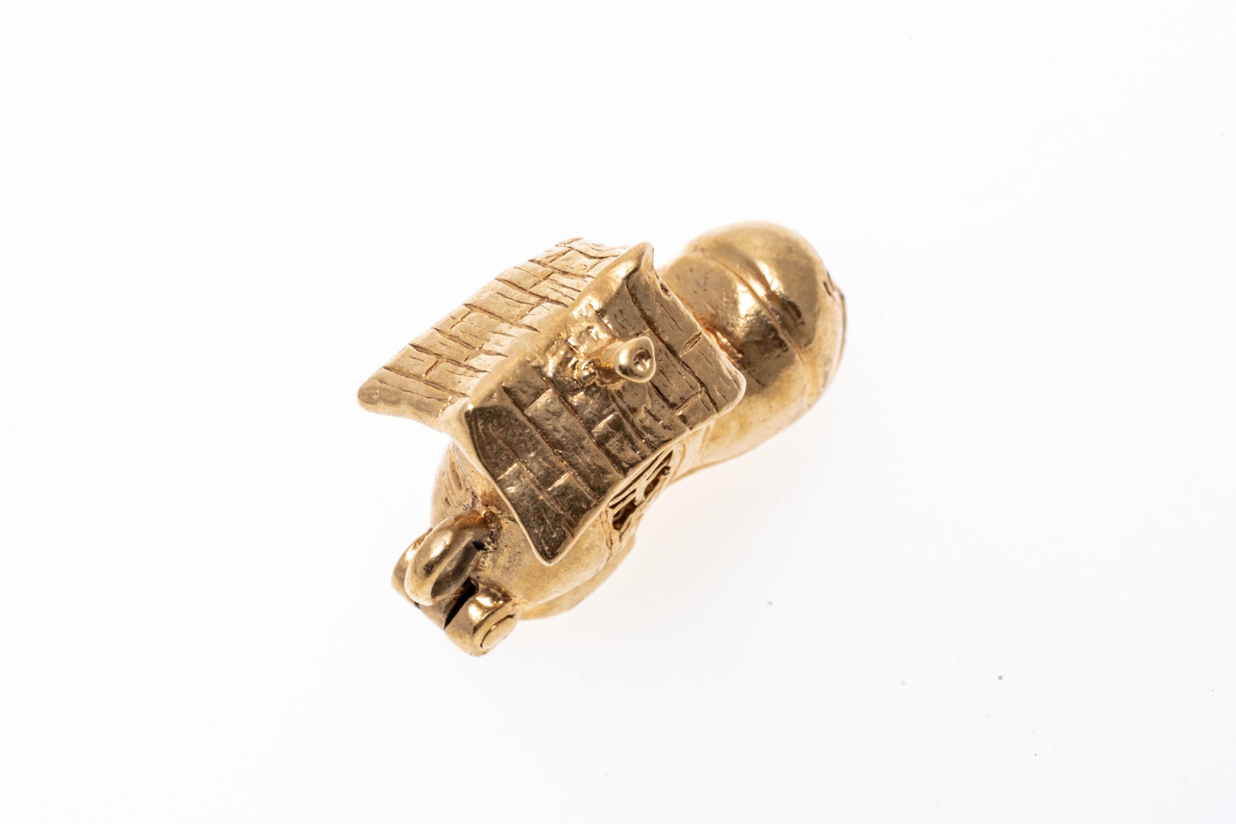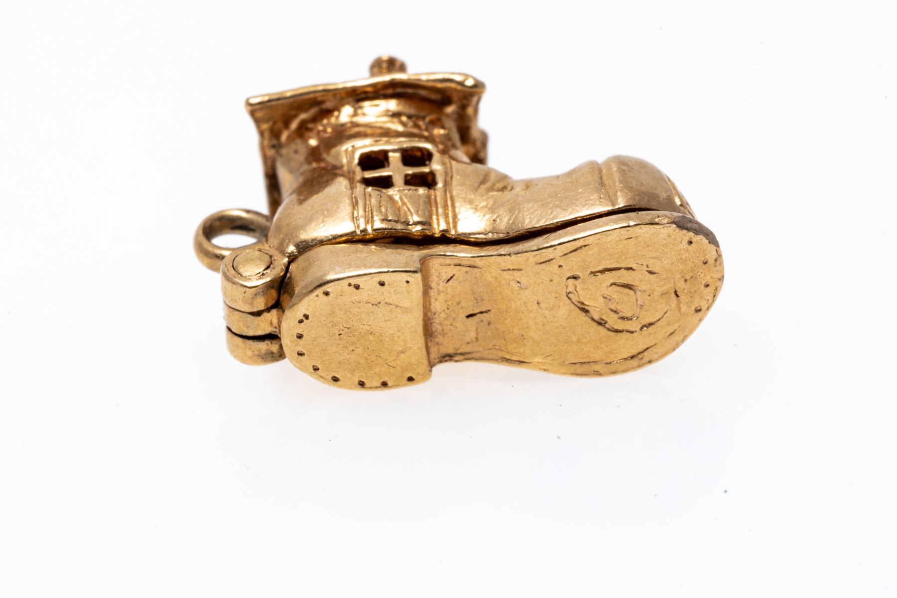 A whimsical yellow gold pendant or charm based off of the English nursery rhyme "There was an Old Woman Who Lived in a Shoe." The charm features a boot-shaped house with diminutive pierced windows, the shoe and sole opening with a hinge to reveal an old woman and her children within.