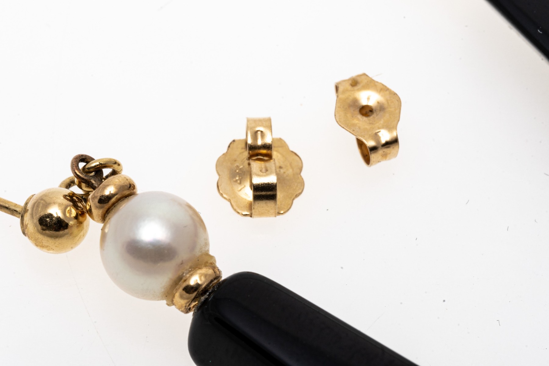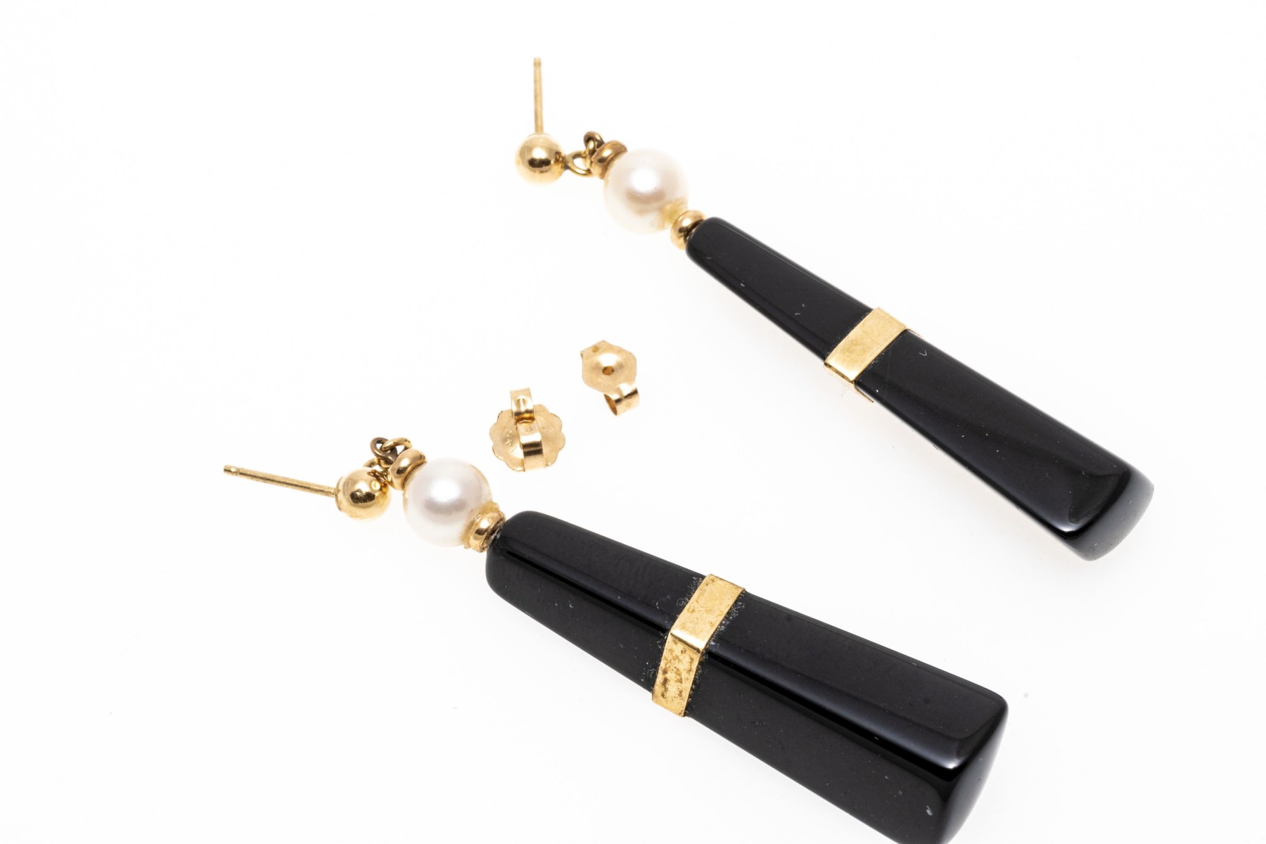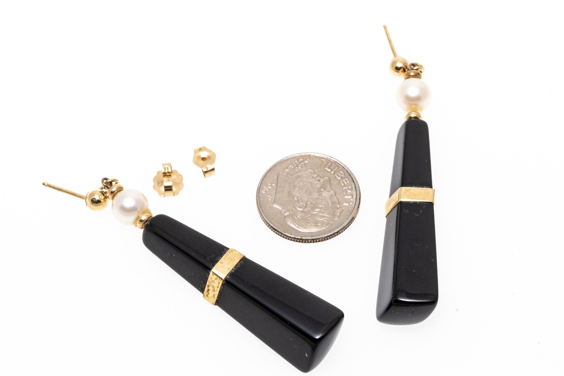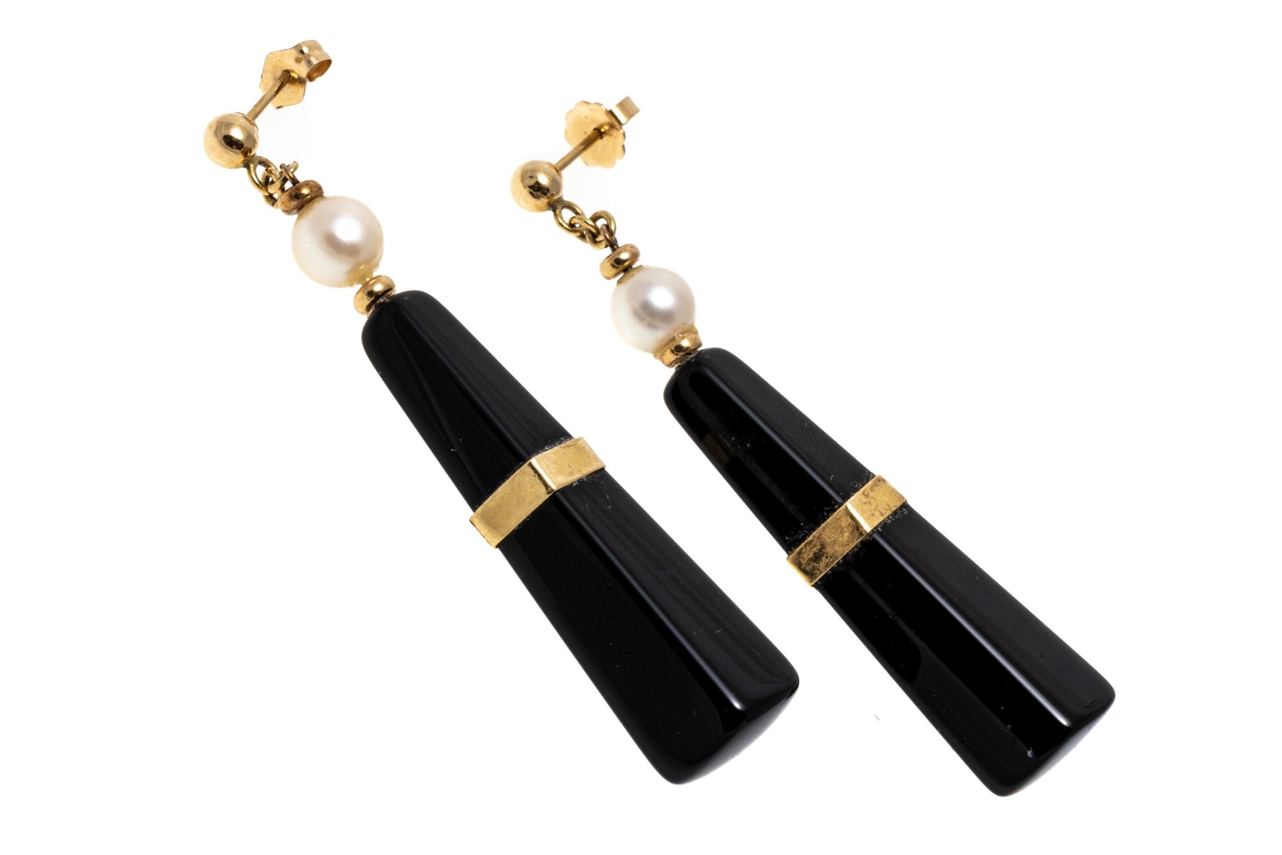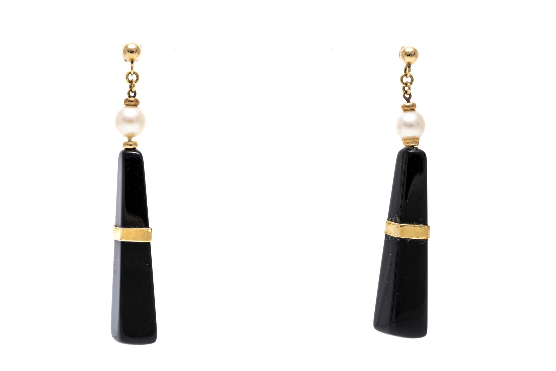 A stylish pair of 14K yellow gold earrings. Suspended from the earrings are polished stone of black onyx. Set above the onyx are 6mm cultured pearls. Post and clutch backings.