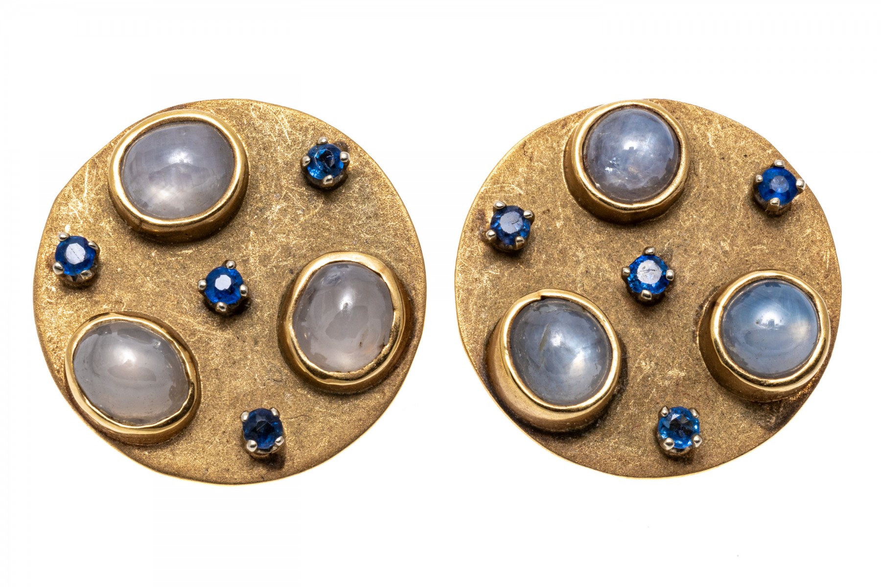 A pair of 14K yellow gold earrings. These disk shaped earrings are set with pale blue opaque sapphires and petite bark blue sapphires for an eye-catching contrast. Clip style backings.