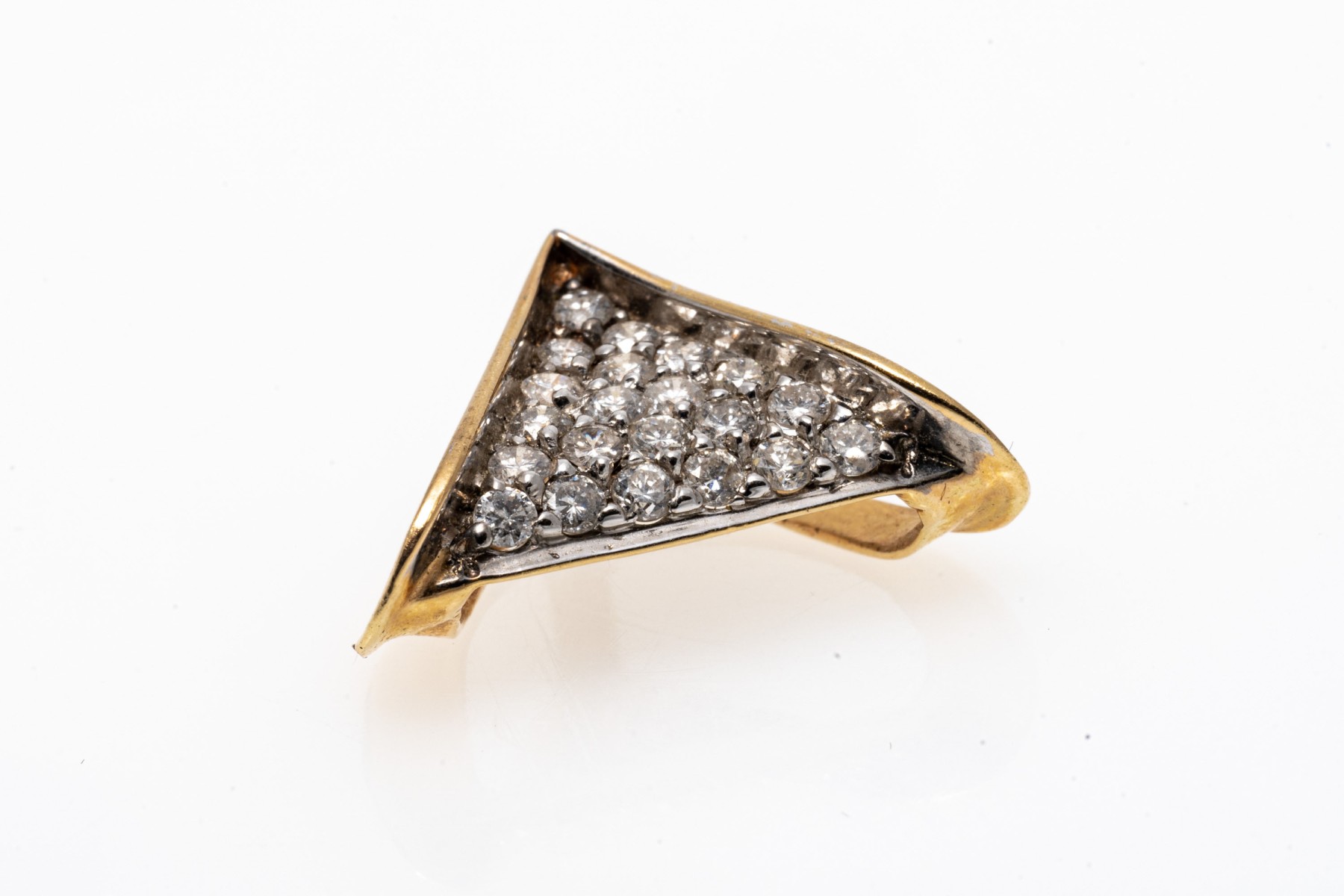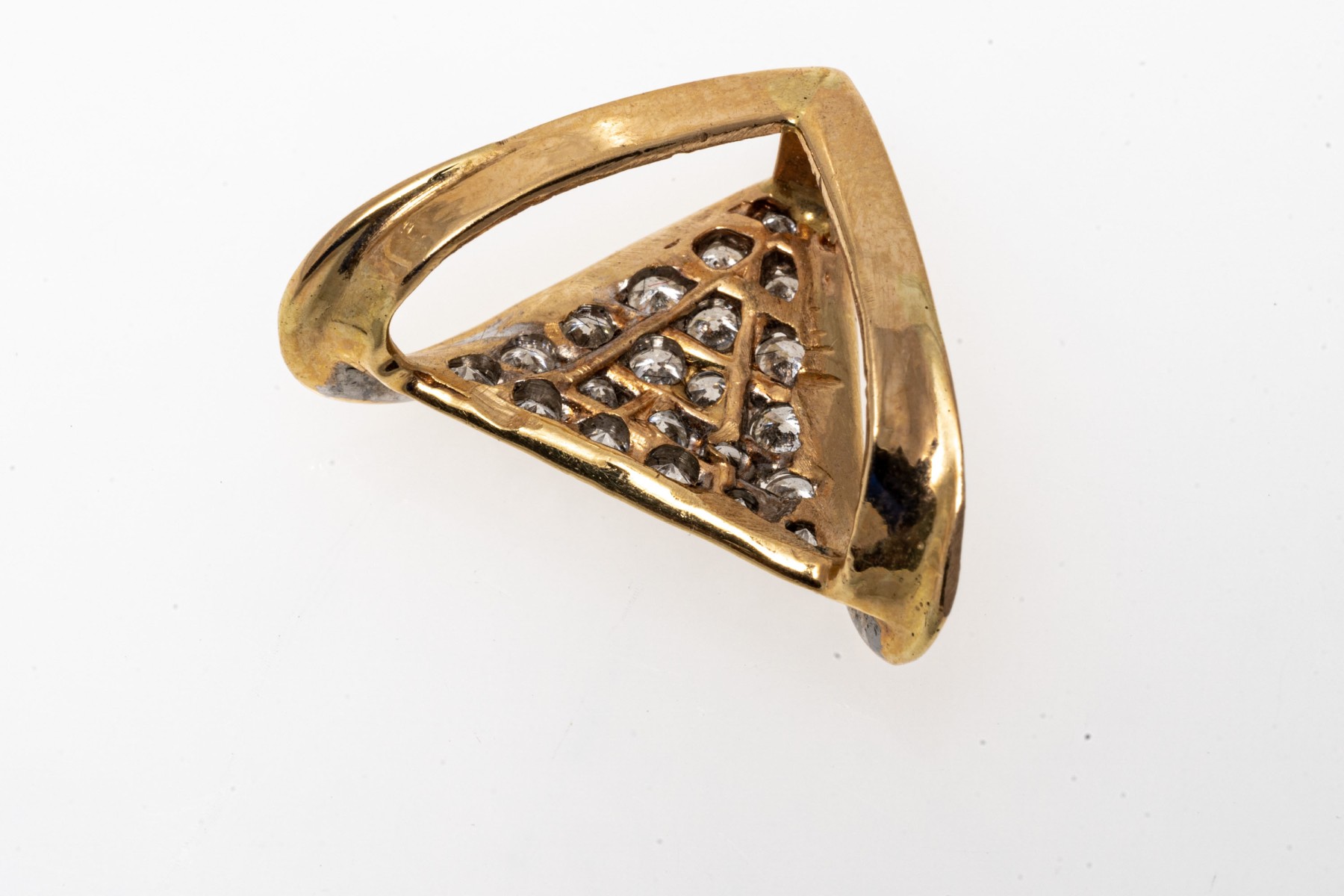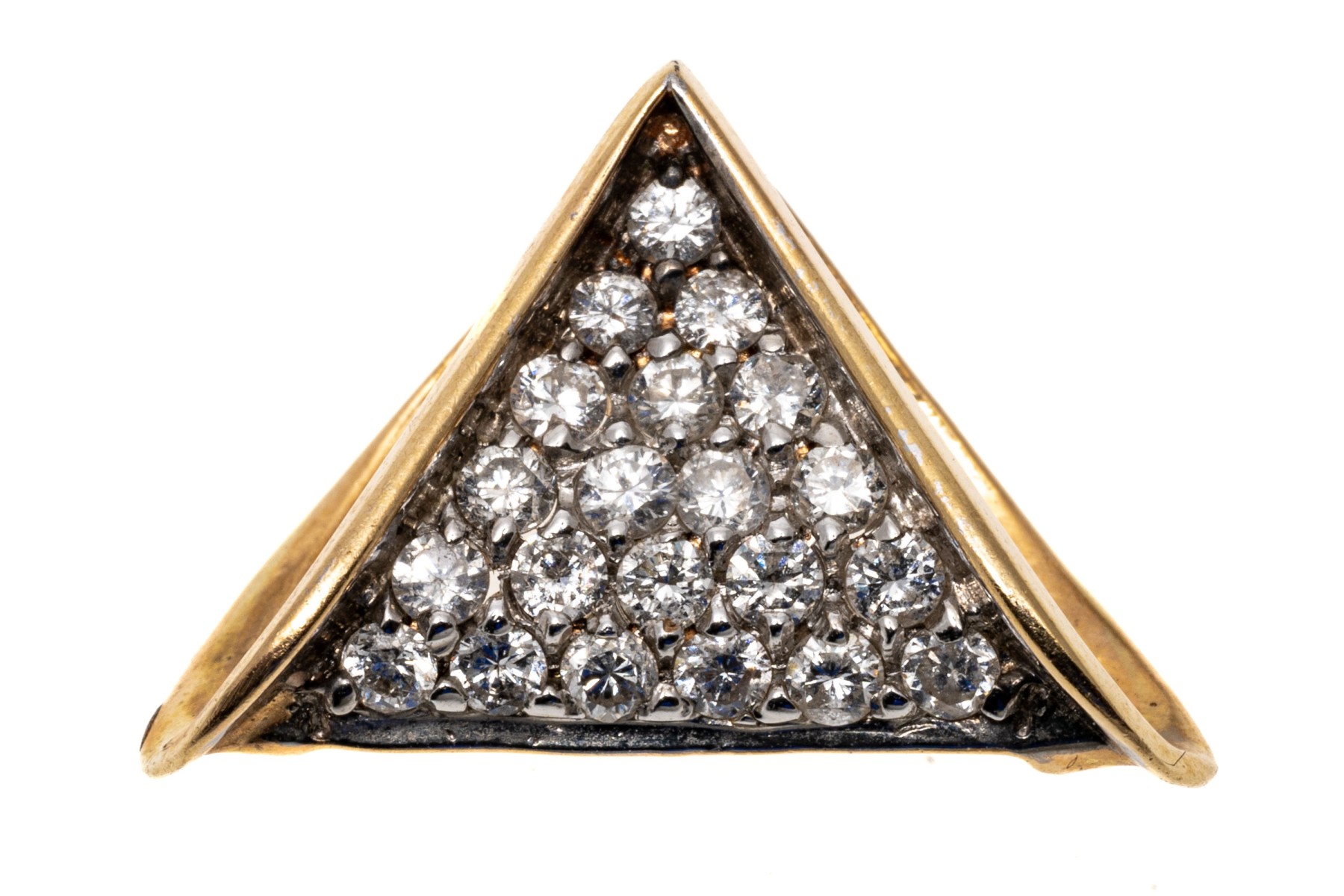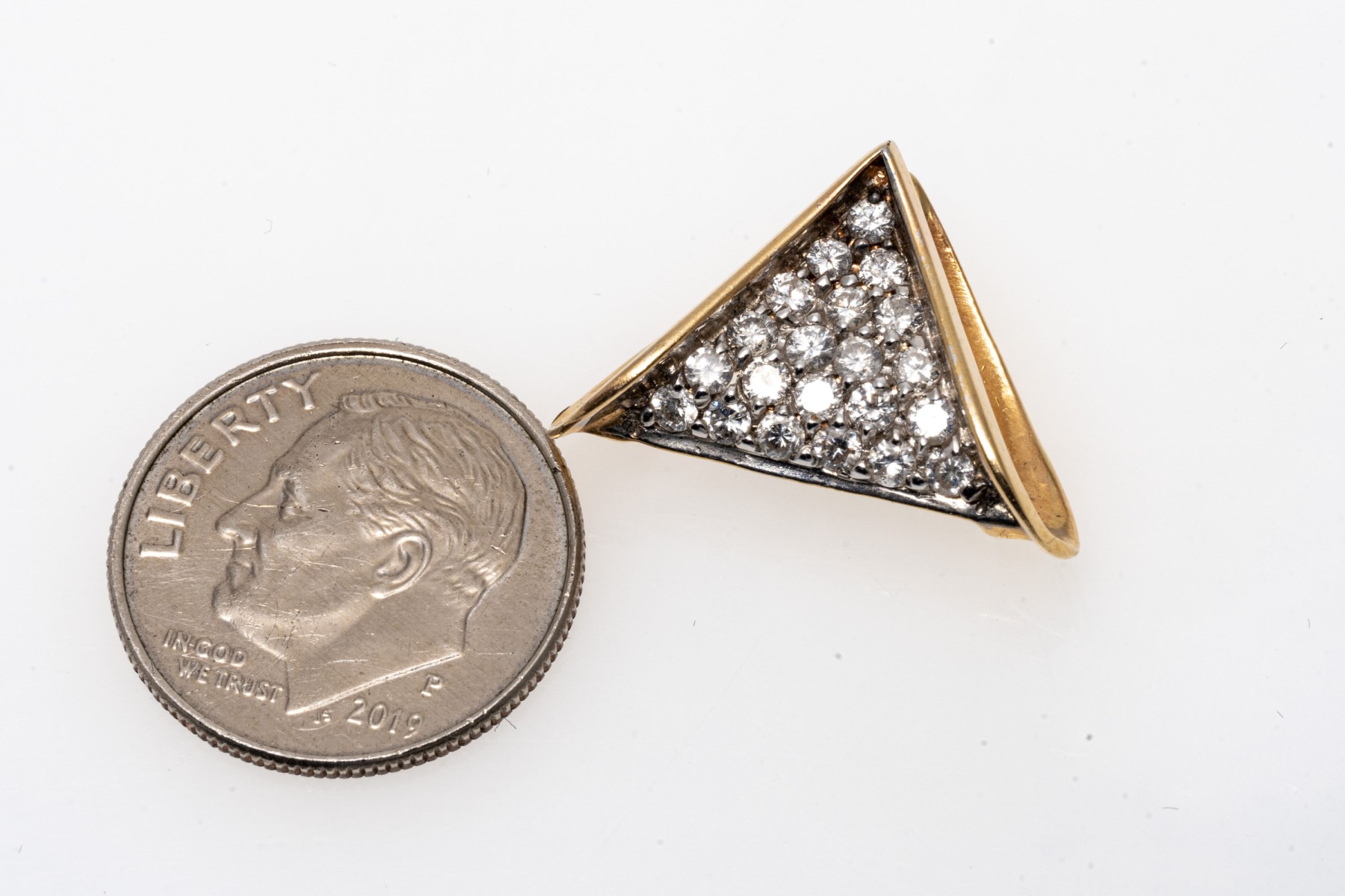 A contemporary 14K yellow gold triangular slide style pendant. Pave set into the face of the pendant are round brilliant cut diamonds, approximately 0.57 TCW.