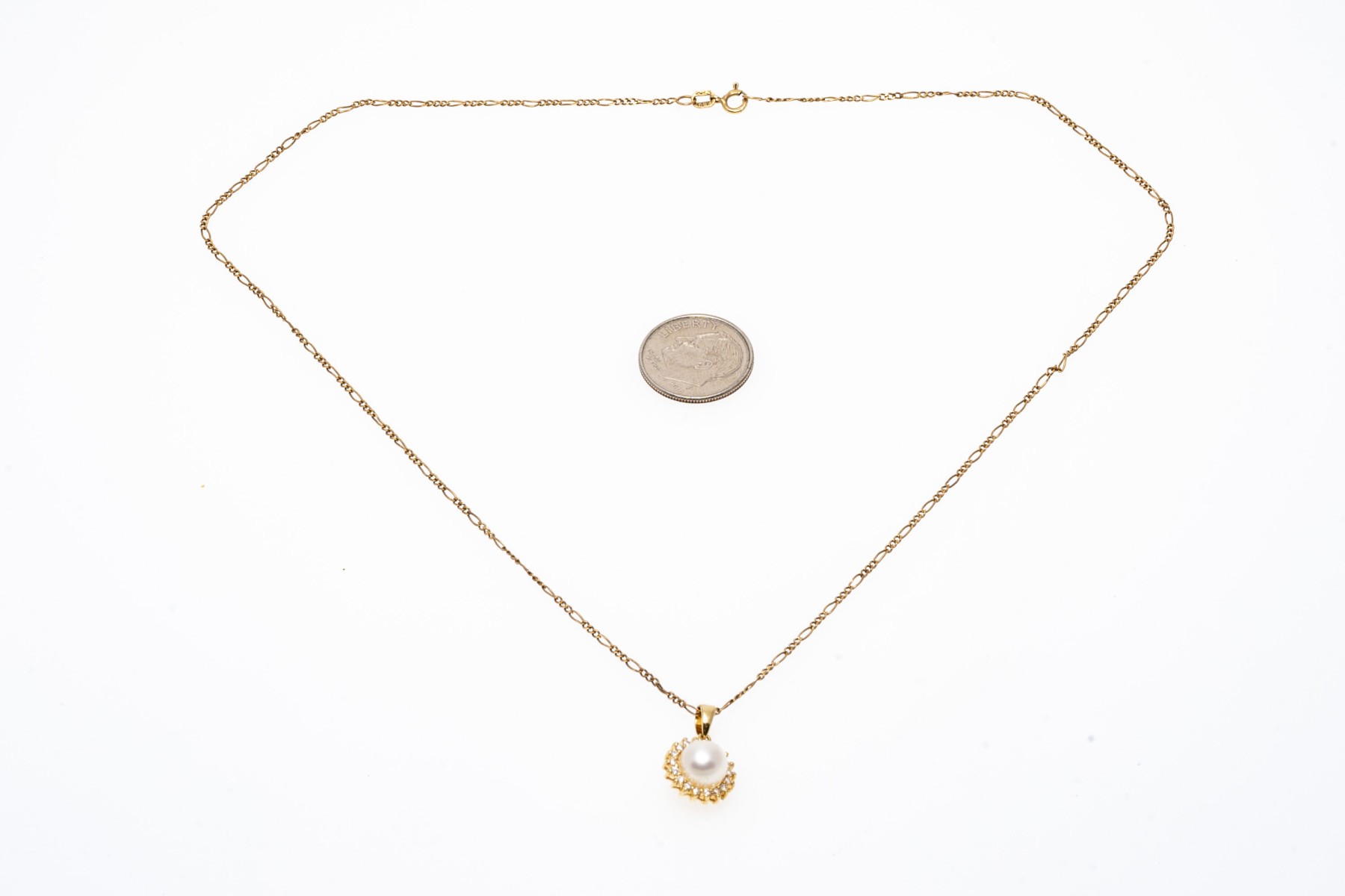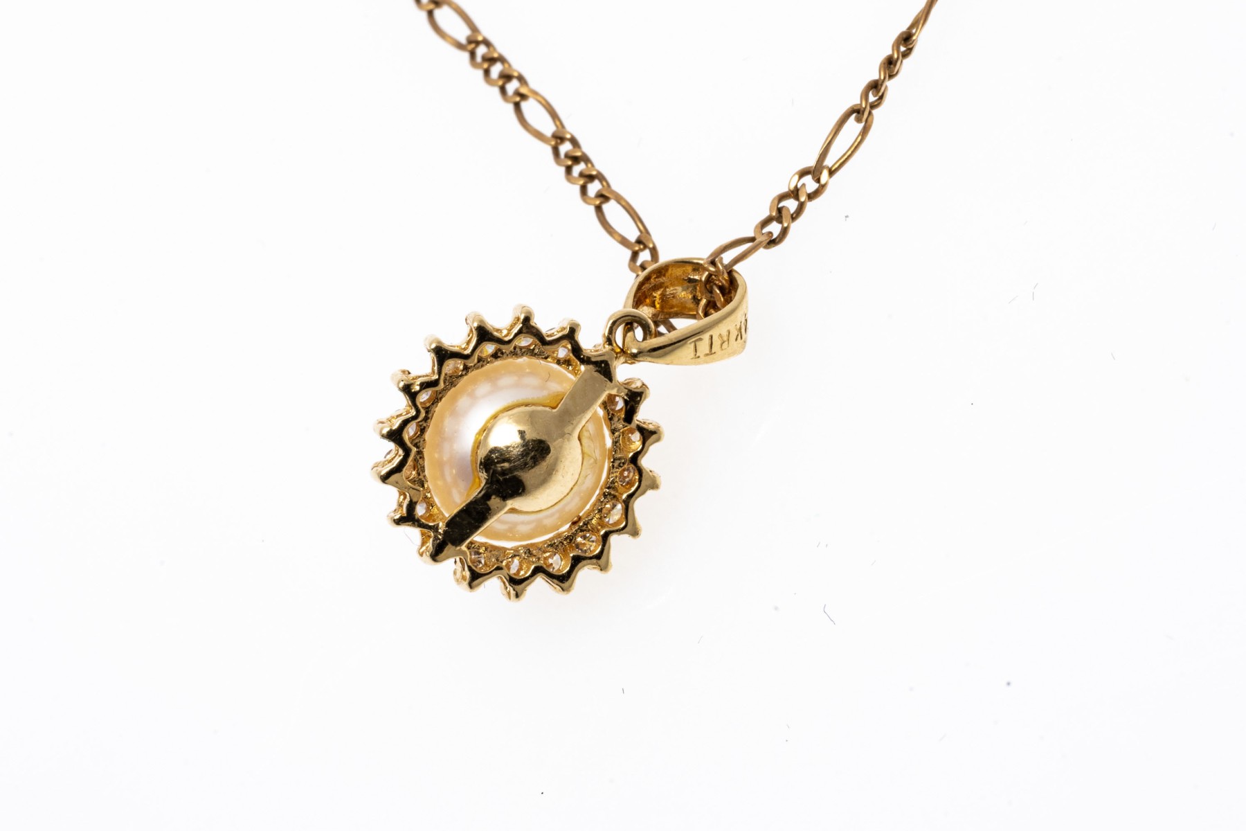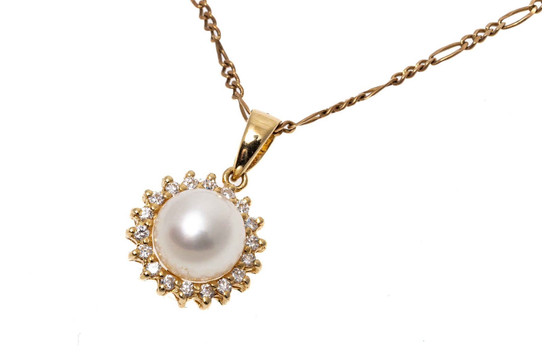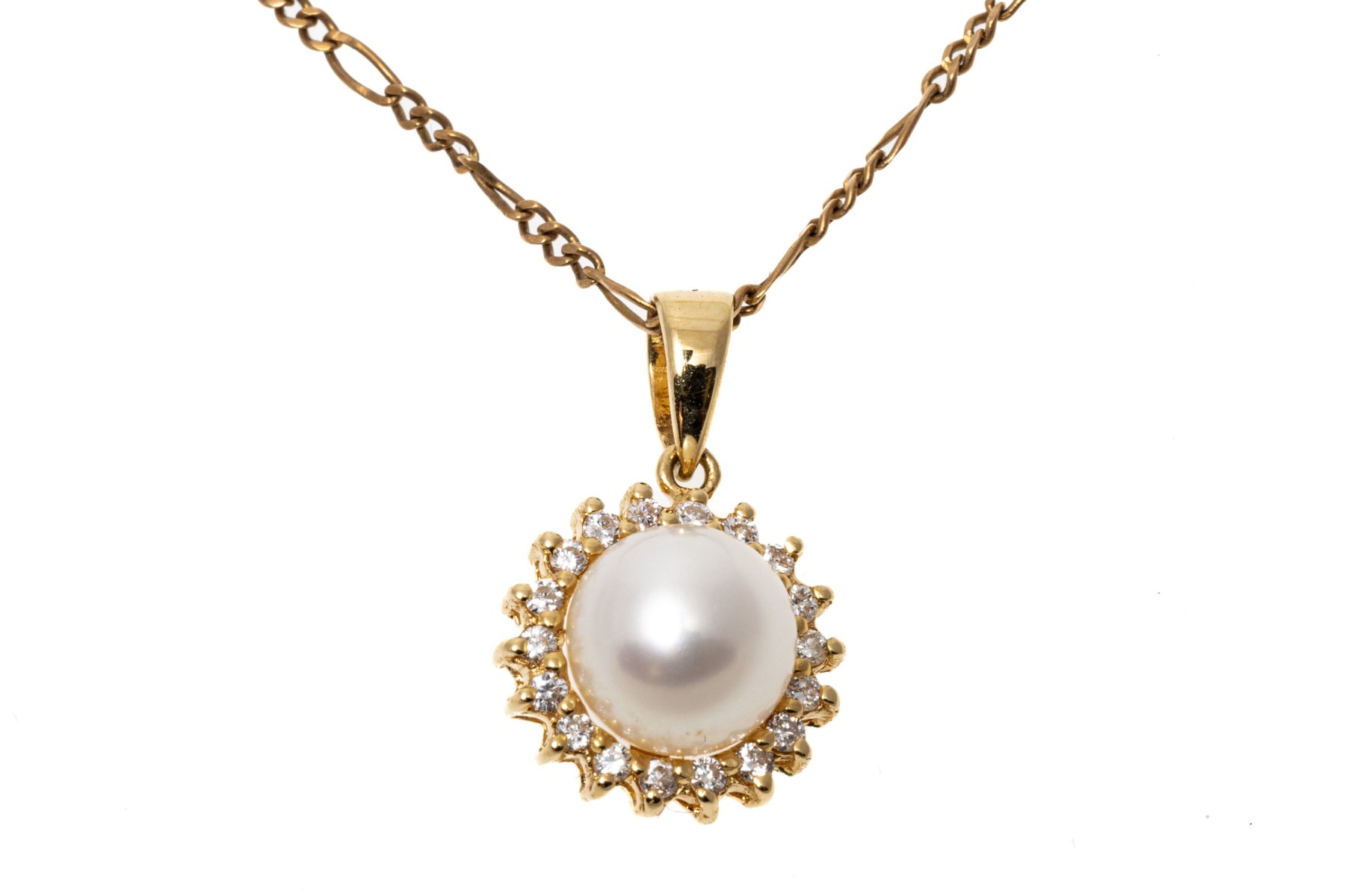 14K yellow gold pendant necklace. The Figaro style chain displays a pendant with a single cultured pearl within a halo of brilliant cut diamonds. The cultured pearl has a bright white color with good luster, 7mm. The diamonds are approximately 0.18 TCW. Spring ring clasp.