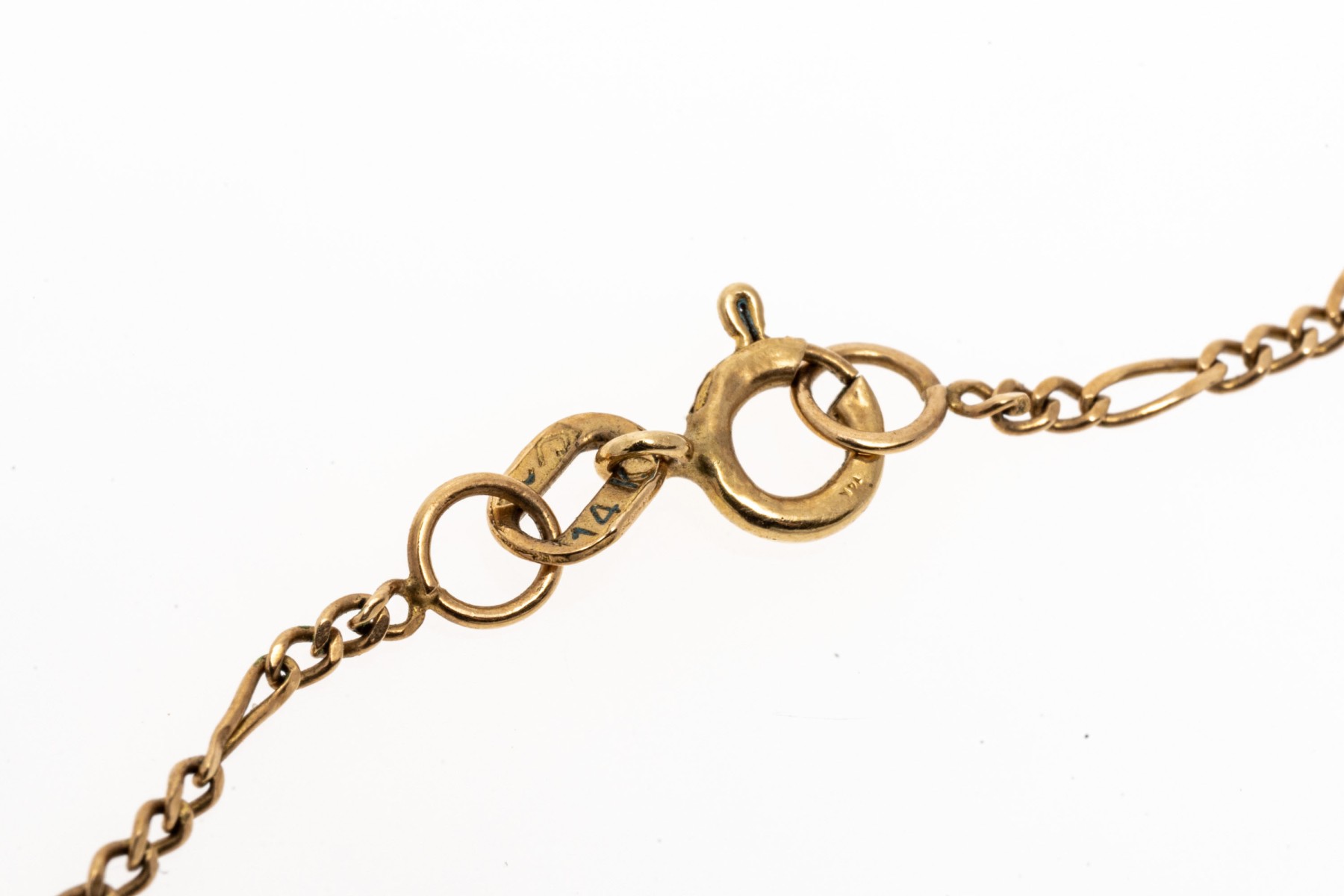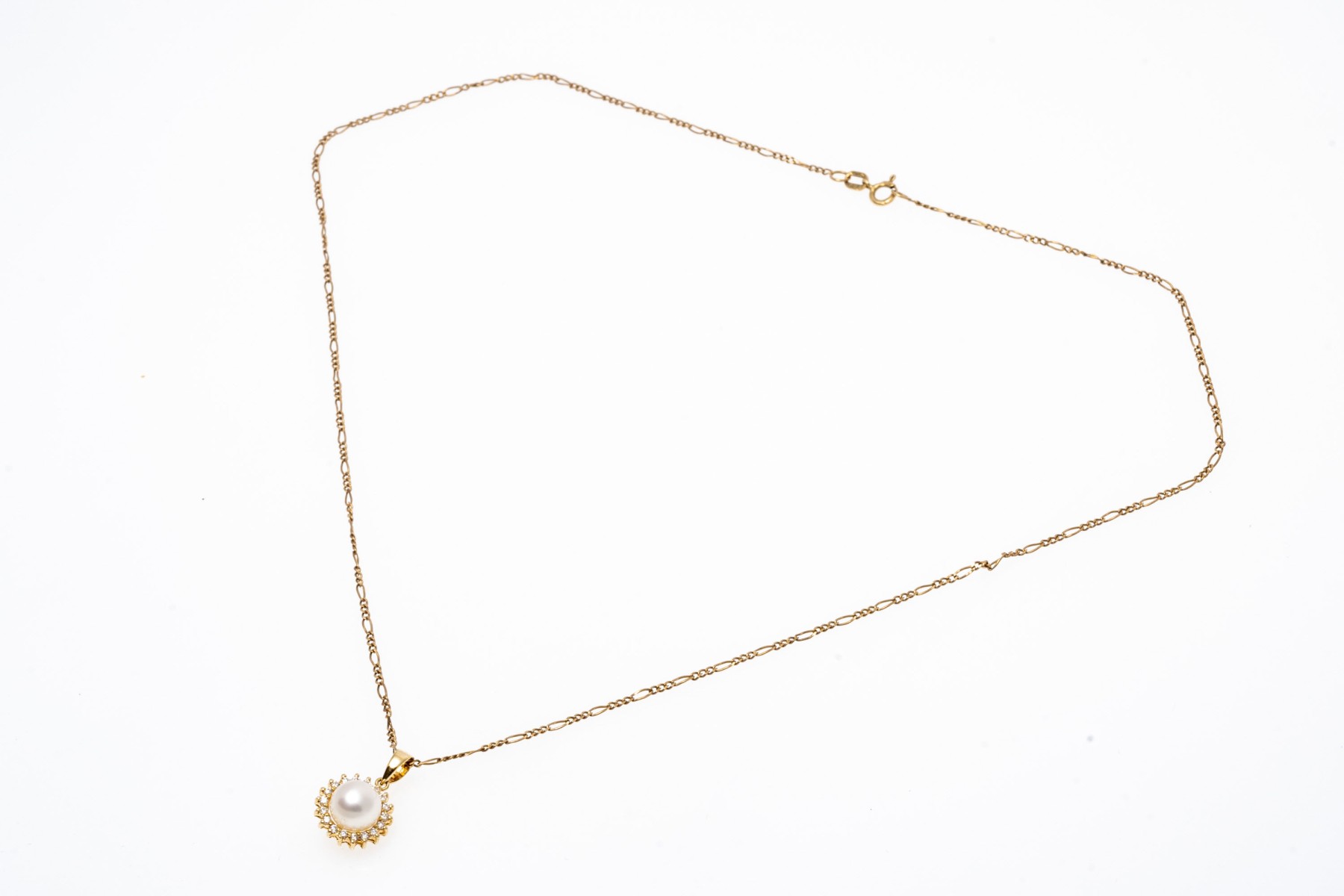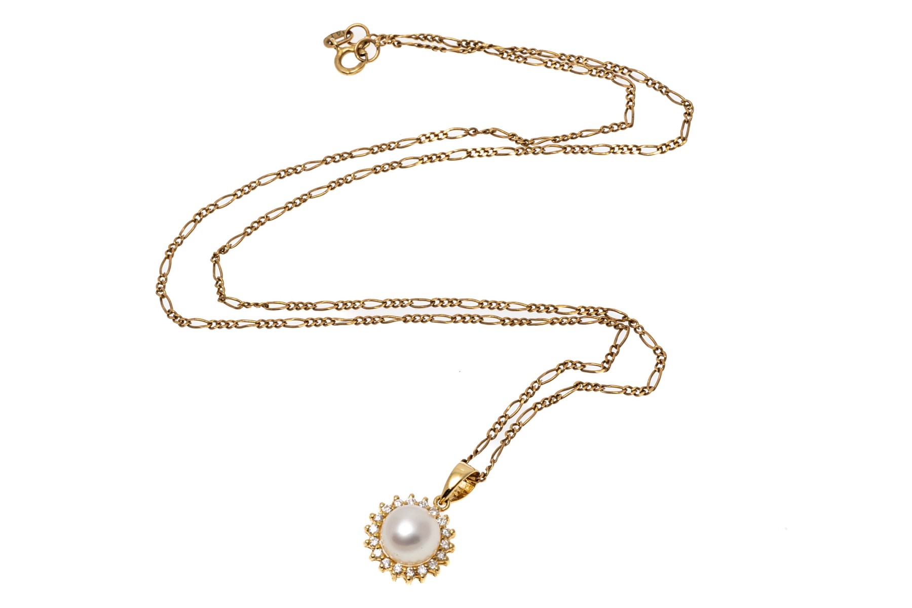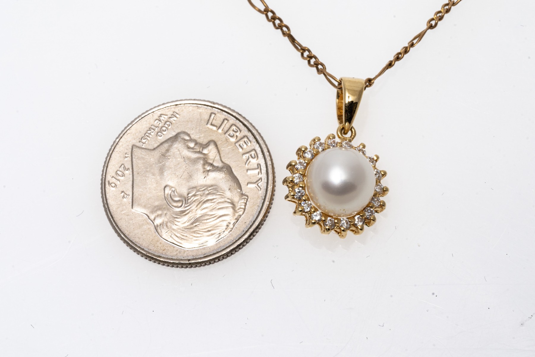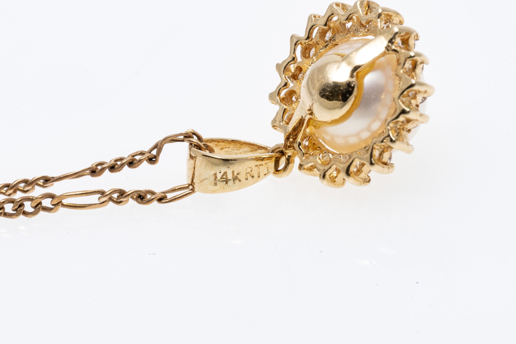 14K yellow gold pendant necklace. The Figaro style chain displays a pendant with a single cultured pearl within a halo of brilliant cut diamonds. The cultured pearl has a bright white color with good luster, 7mm. The diamonds are approximately 0.18 TCW. Spring ring clasp.