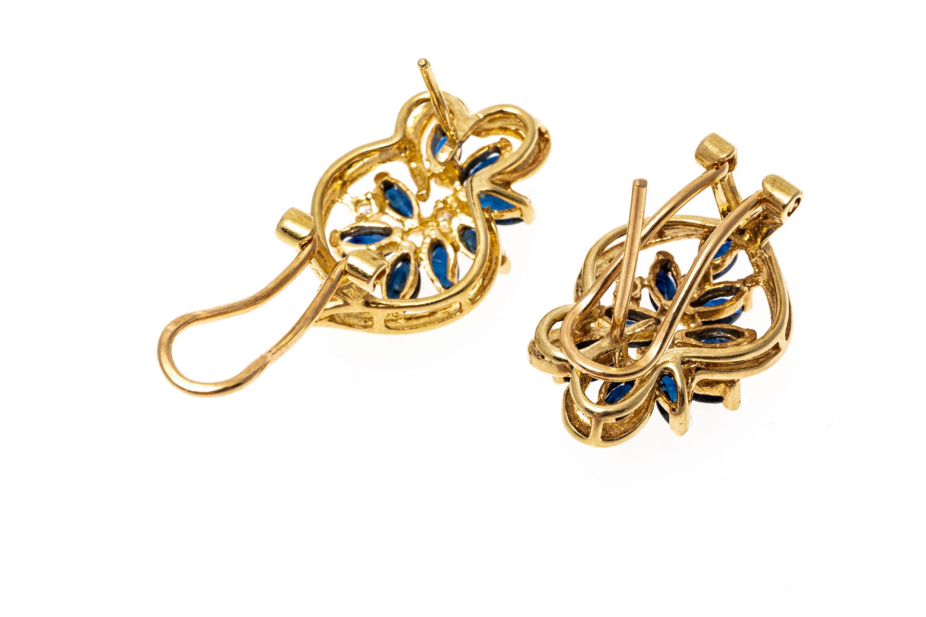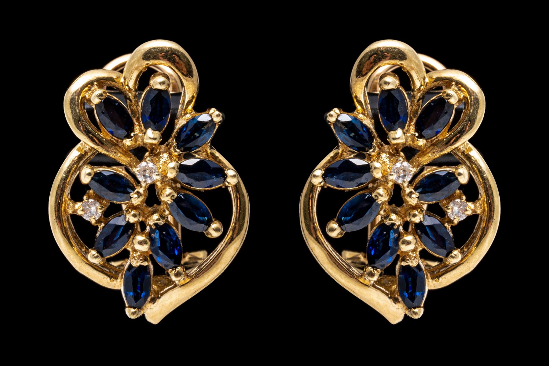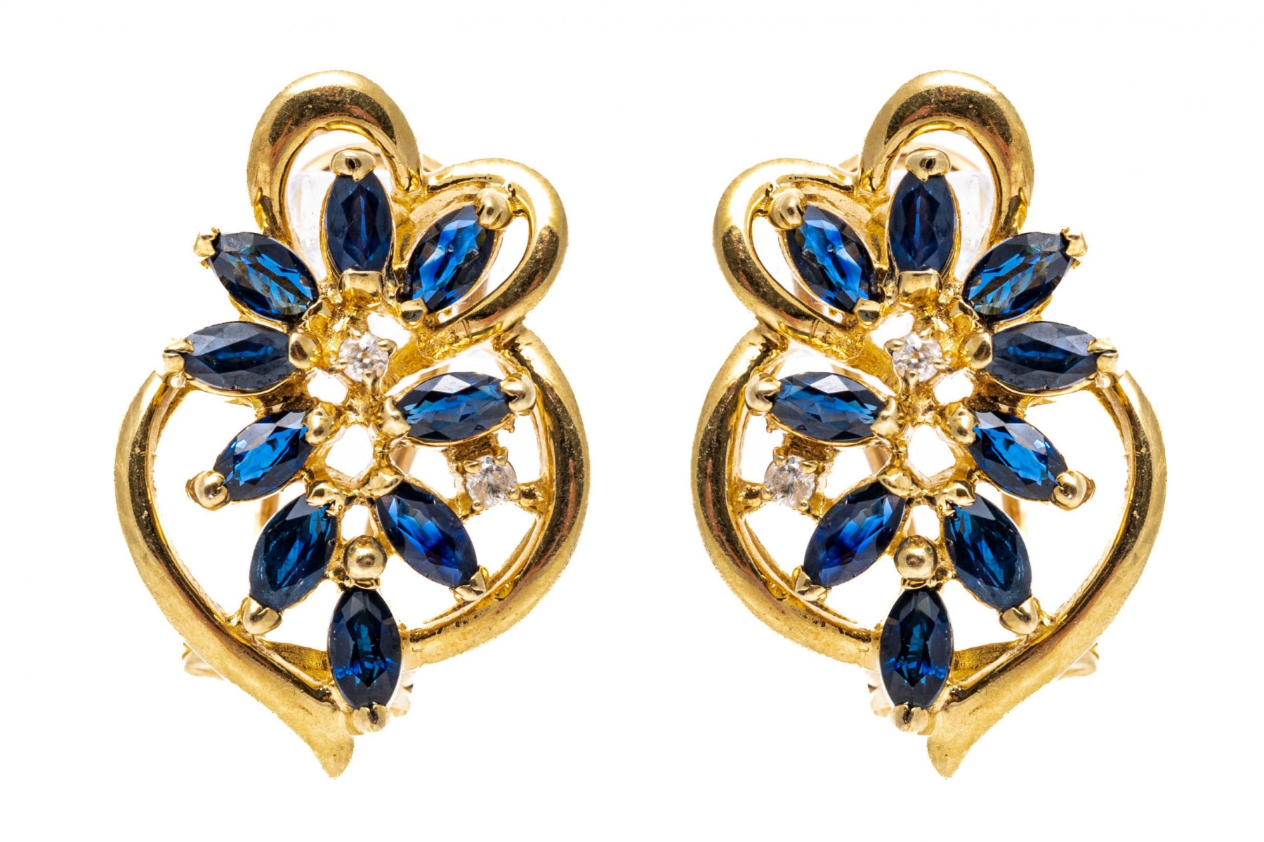 14K yellow gold earrings with an opposing design. Marquise cut sapphires radiate out from the center of these earrings in an opposing design. Two round cut diamonds are set amoung the sapphires on each earring. The sapphires are approximately 0.86 TCW and the diamonds are approximately 0.04 TCW. Post and omega backings.
