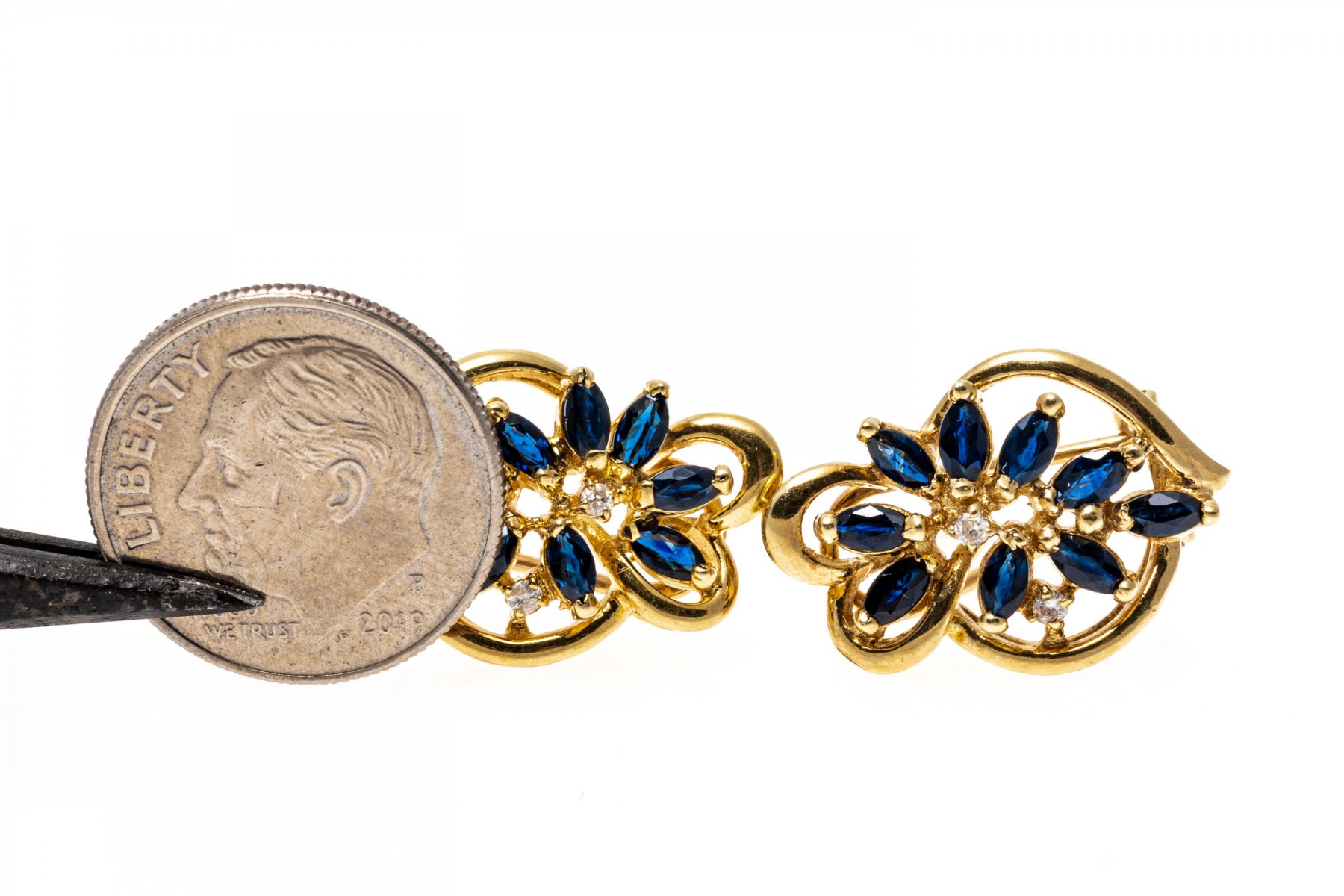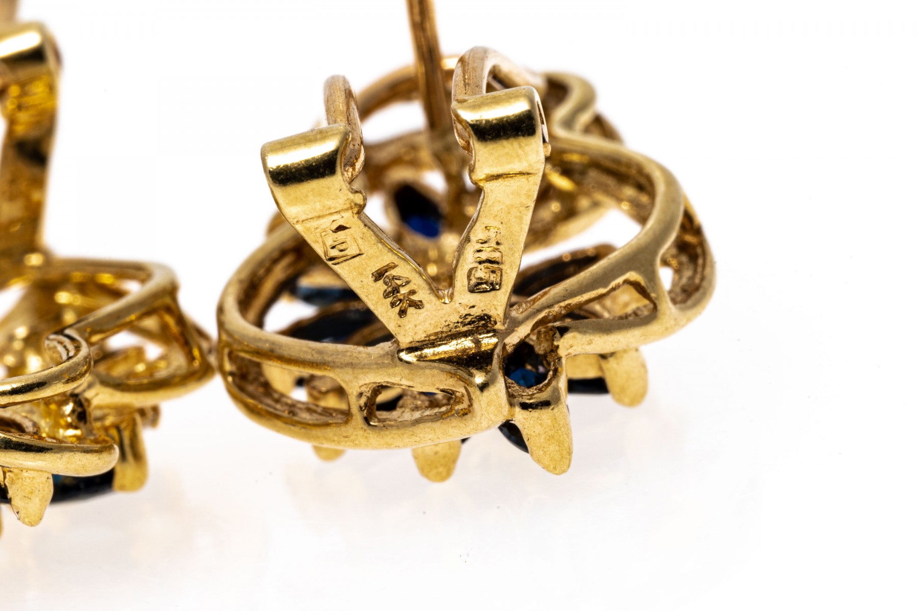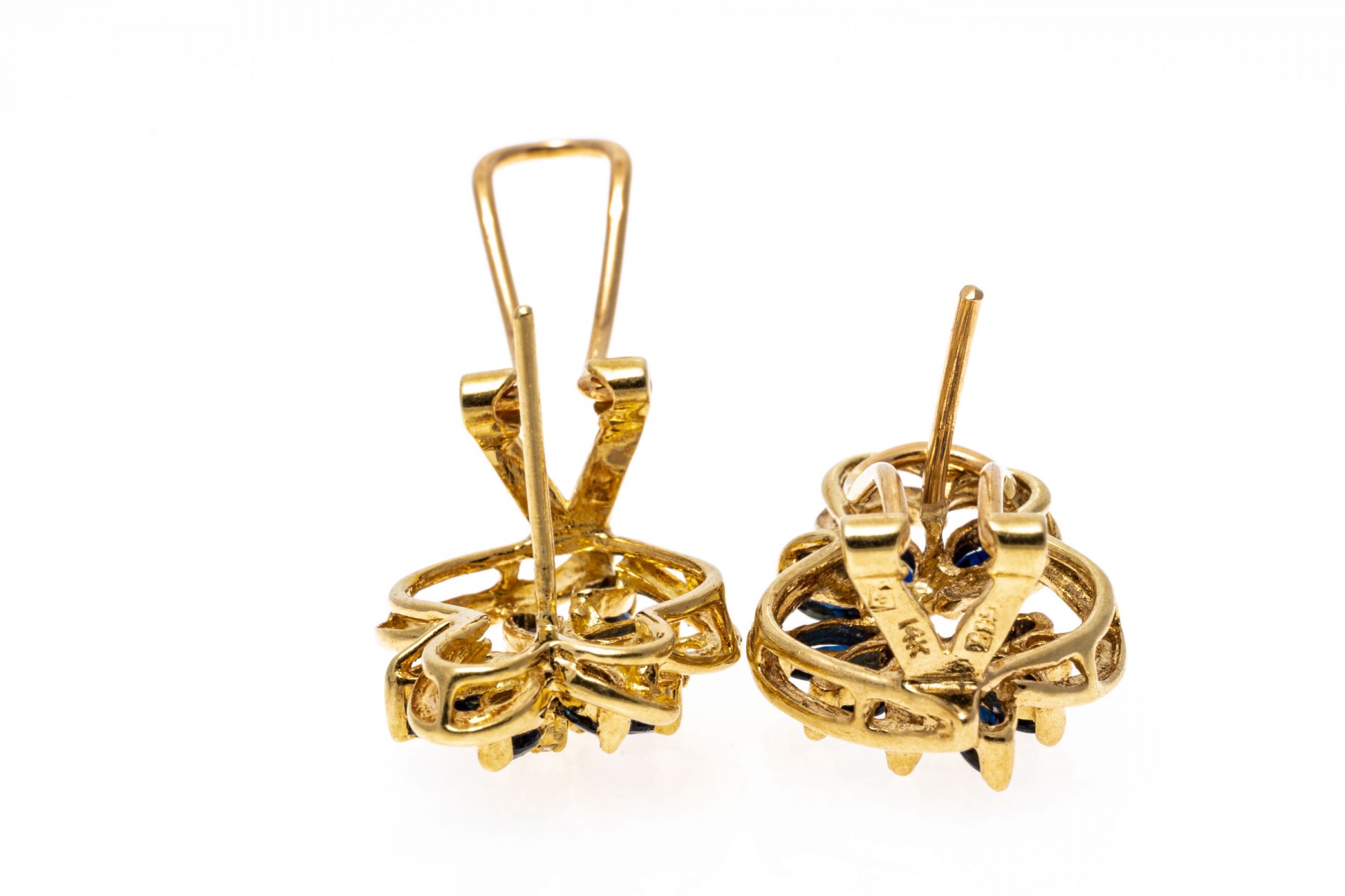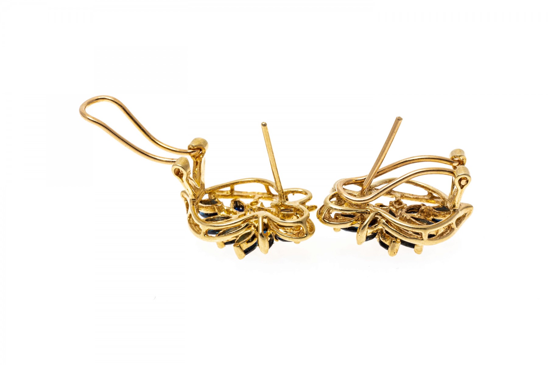 14K yellow gold earrings with an opposing design. Marquise cut sapphires radiate out from the center of these earrings in an opposing design. Two round cut diamonds are set amoung the sapphires on each earring. The sapphires are approximately 0.86 TCW and the diamonds are approximately 0.04 TCW. Post and omega backings.