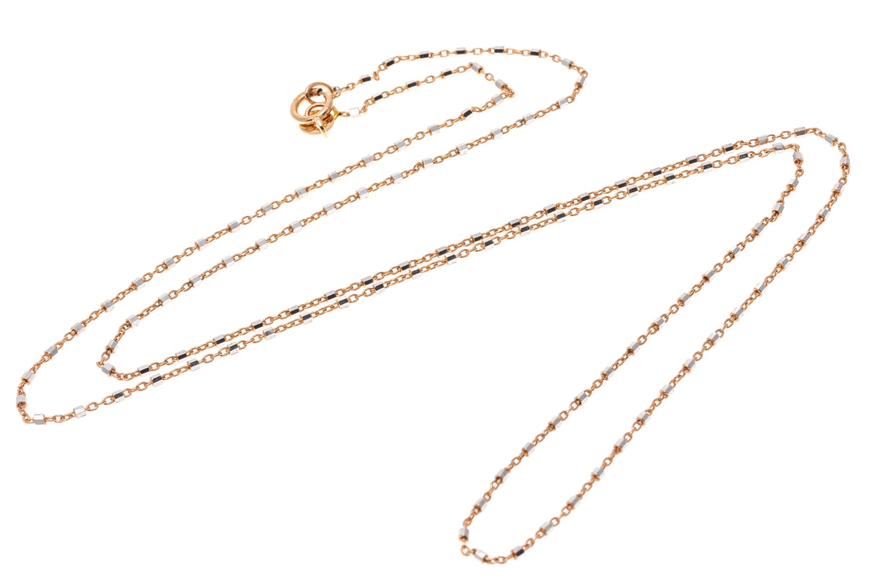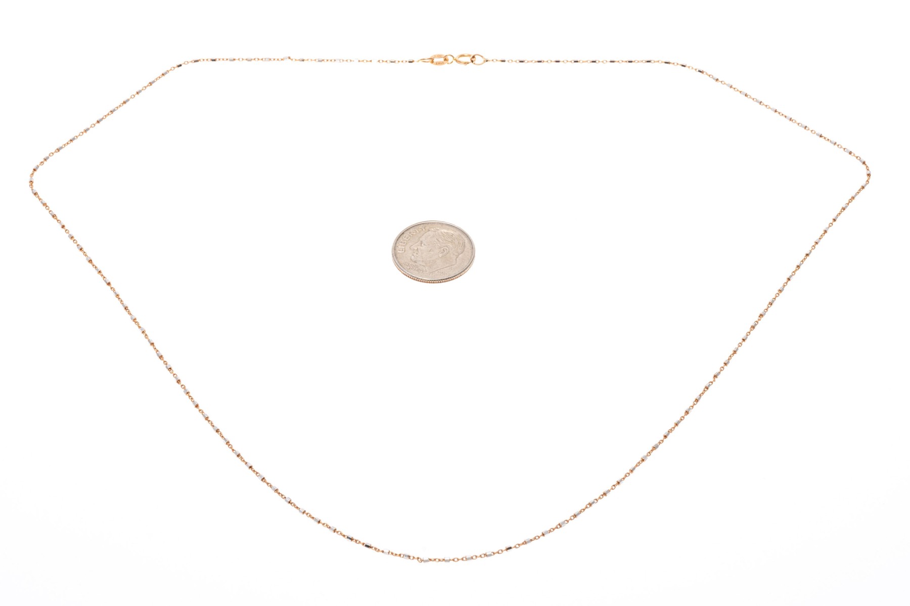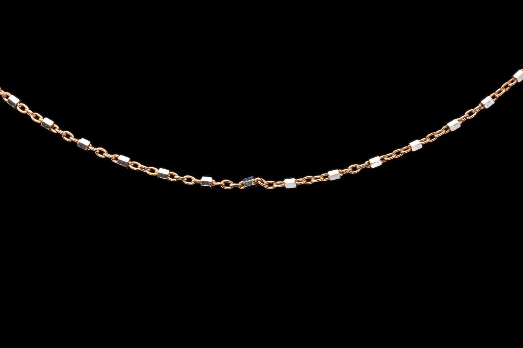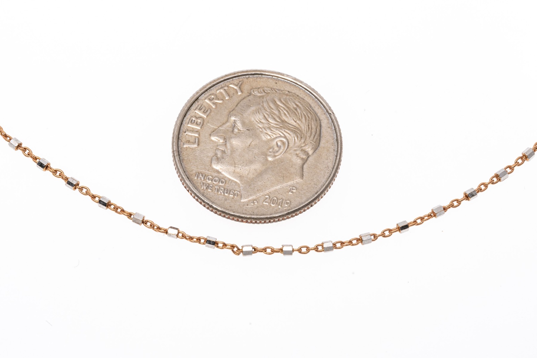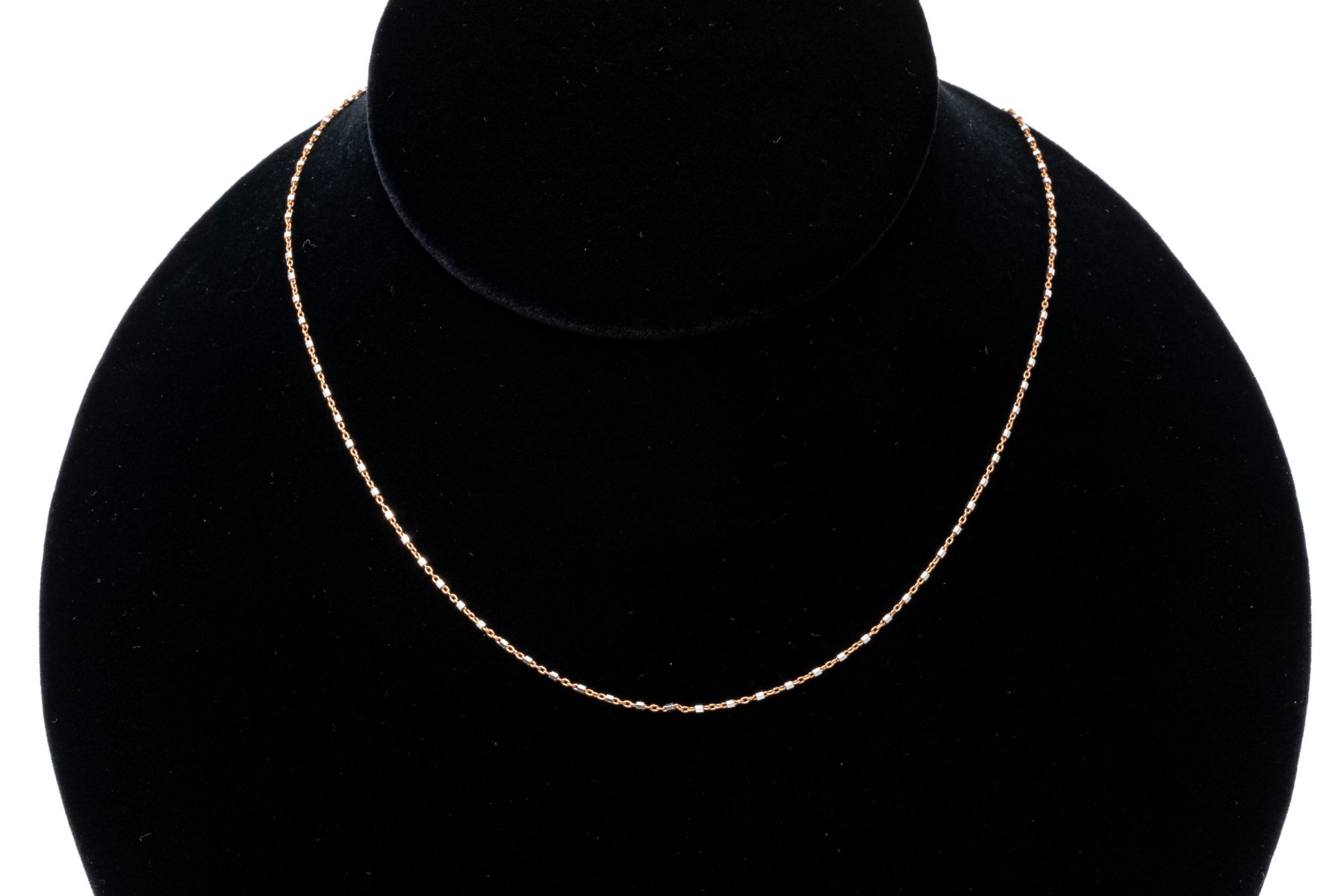 14K rose gold chain necklace. This delicate chain displays barrel shaped beads of contrasting white gold set at intervals. The chain secures with a spring ring clasp.