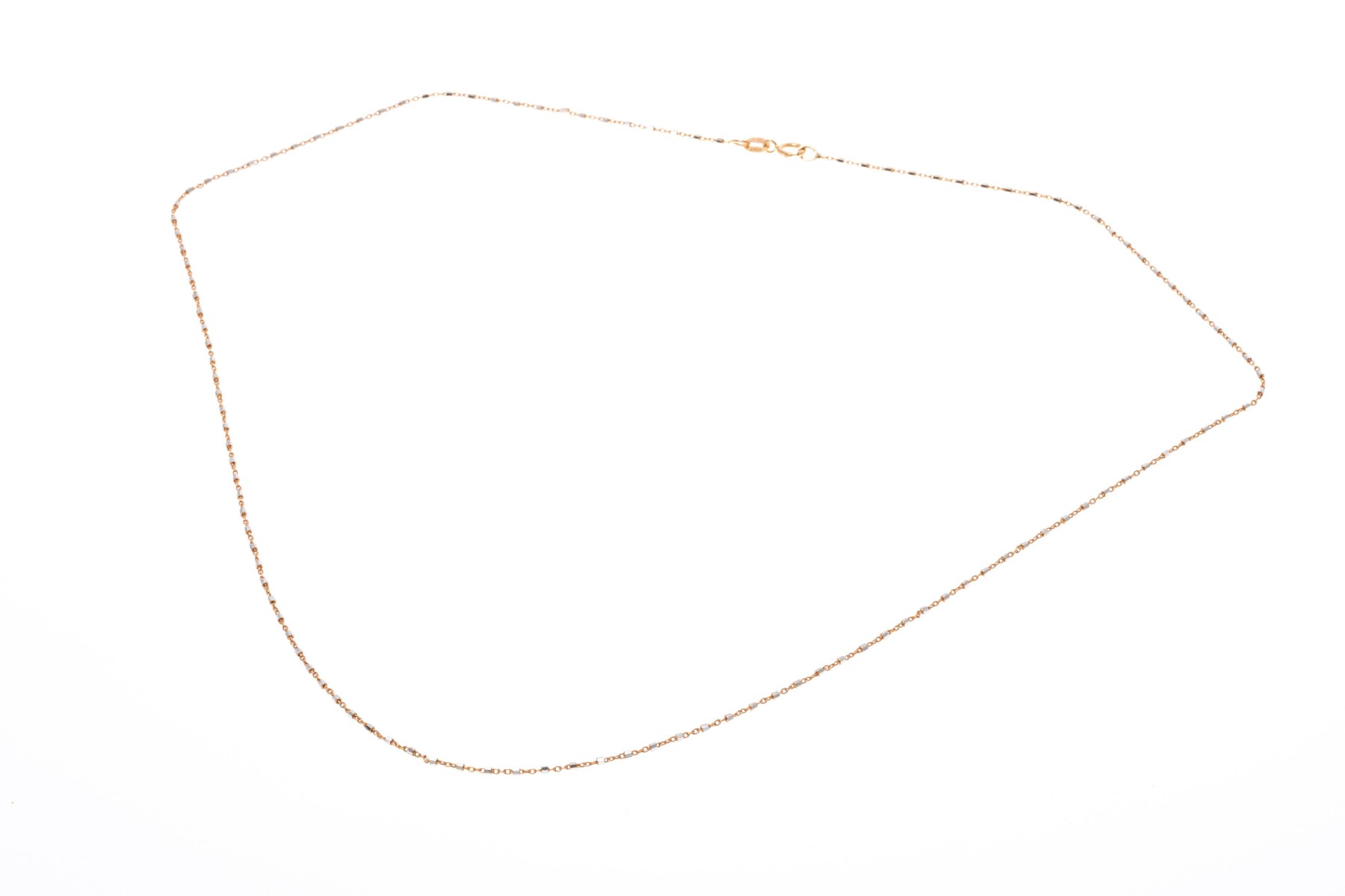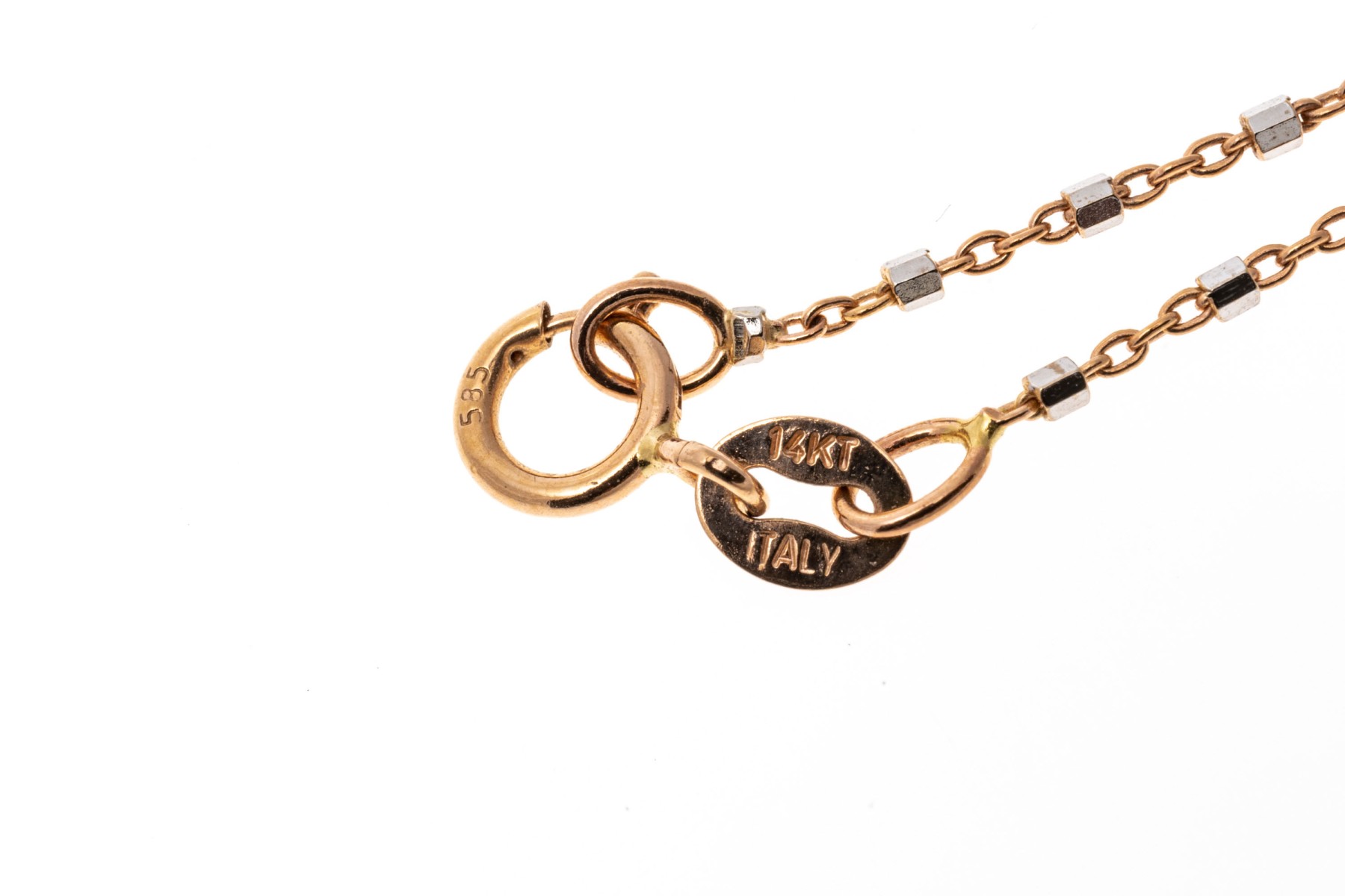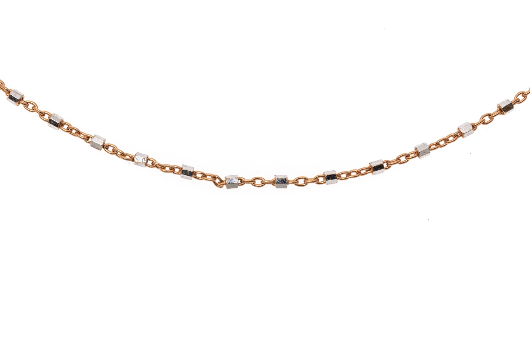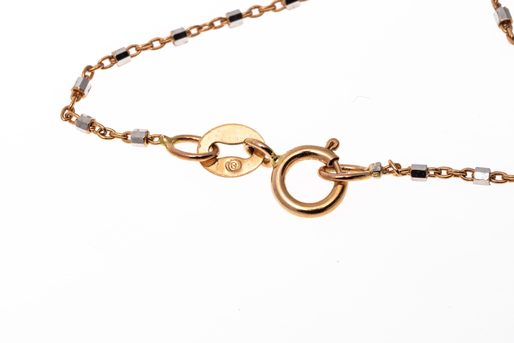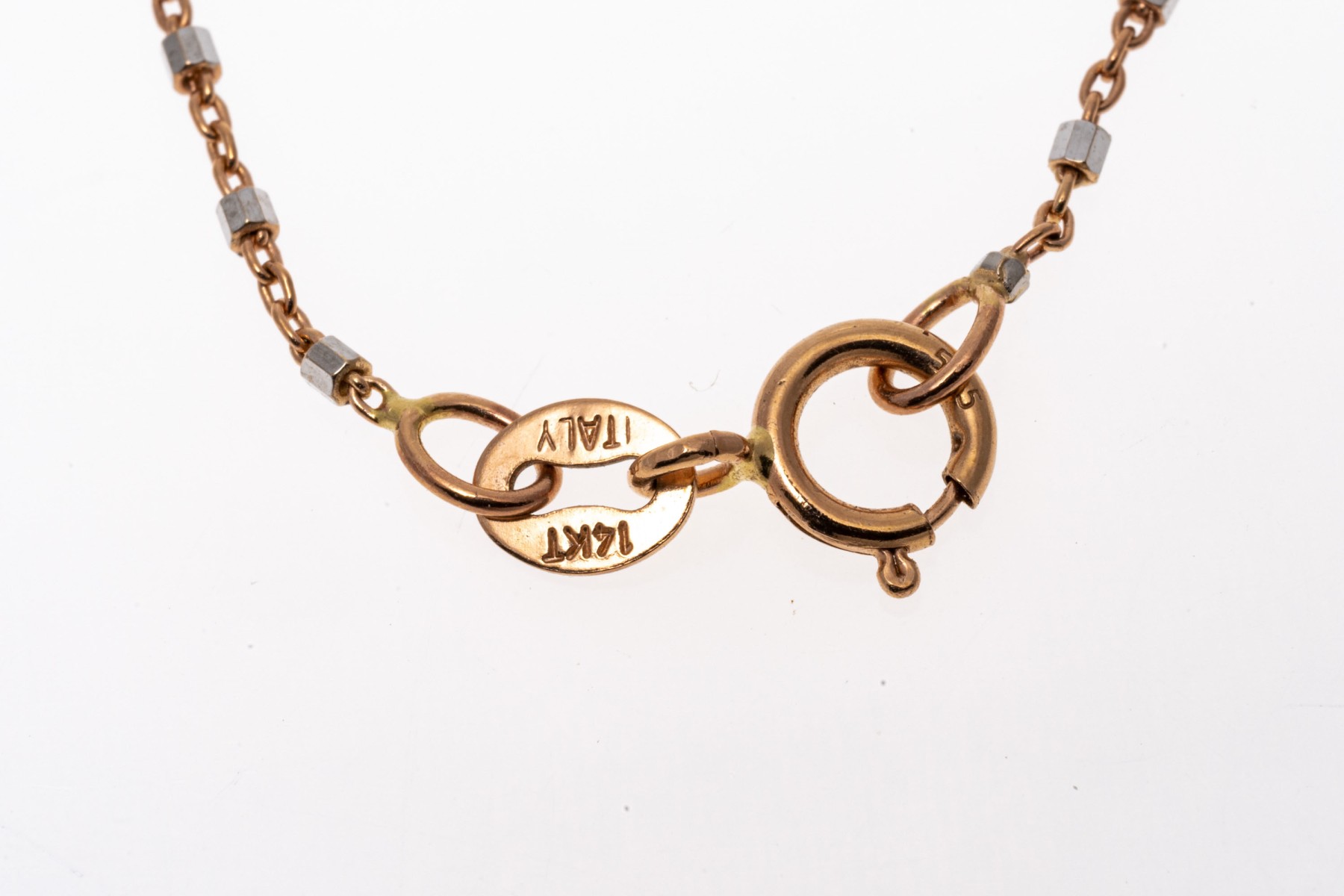 14K rose gold chain necklace. This delicate chain displays barrel shaped beads of contrasting white gold set at intervals. The chain secures with a spring ring clasp.