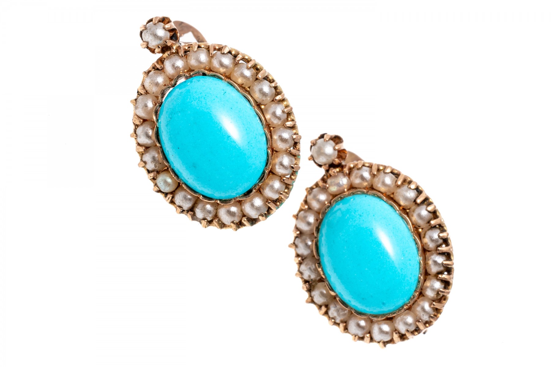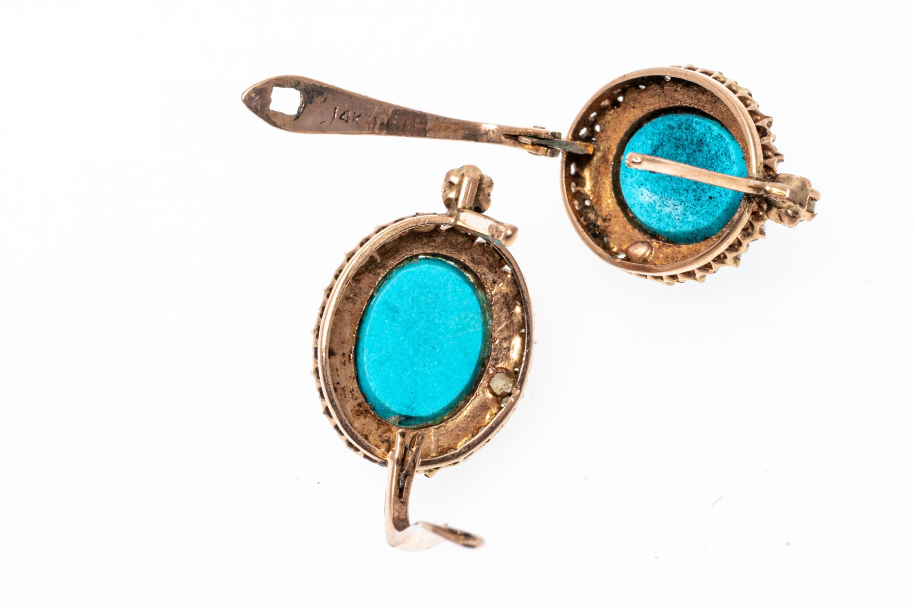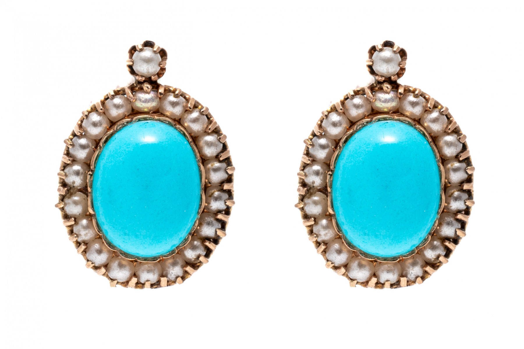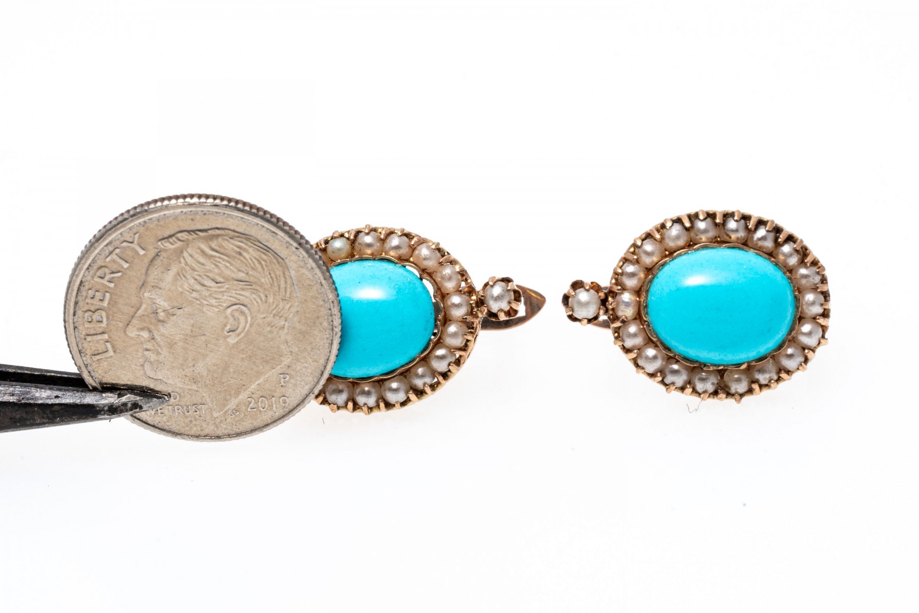 14k rose gold lovely vintage turquoise cabachon and seed pearl halo earrings, with posts and lever style backs