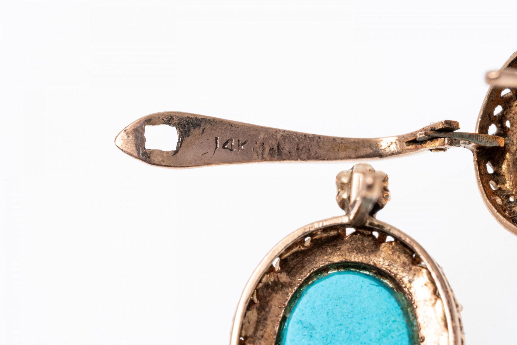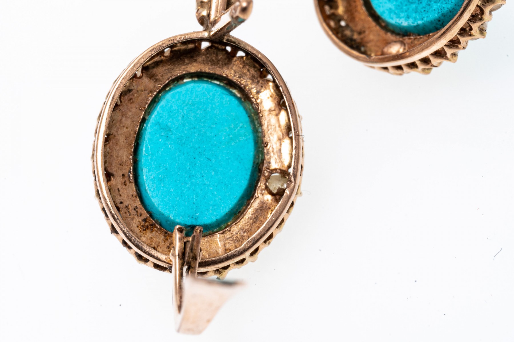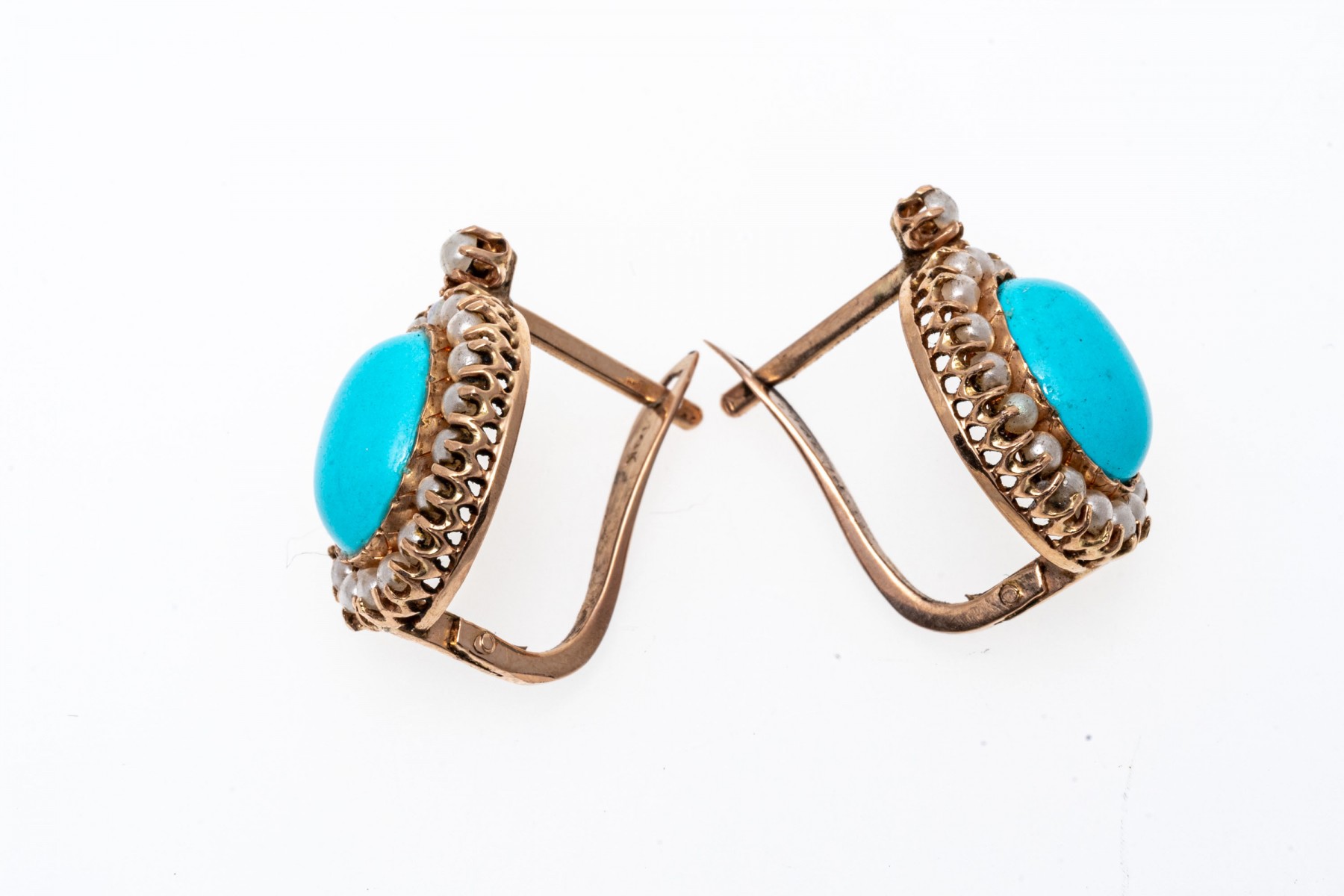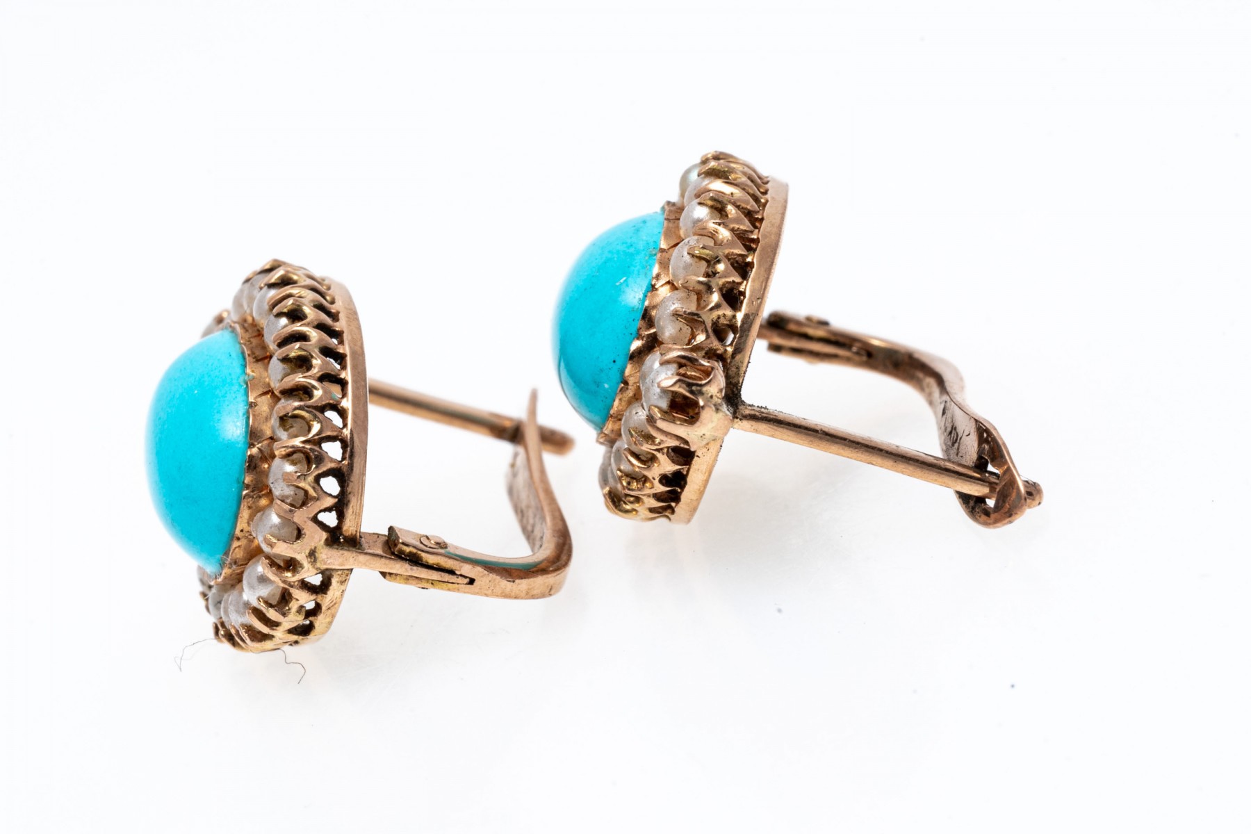 14k rose gold lovely vintage turquoise cabachon and seed pearl halo earrings, with posts and lever style backs